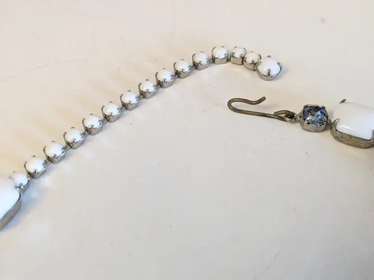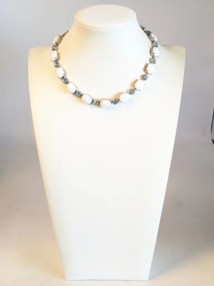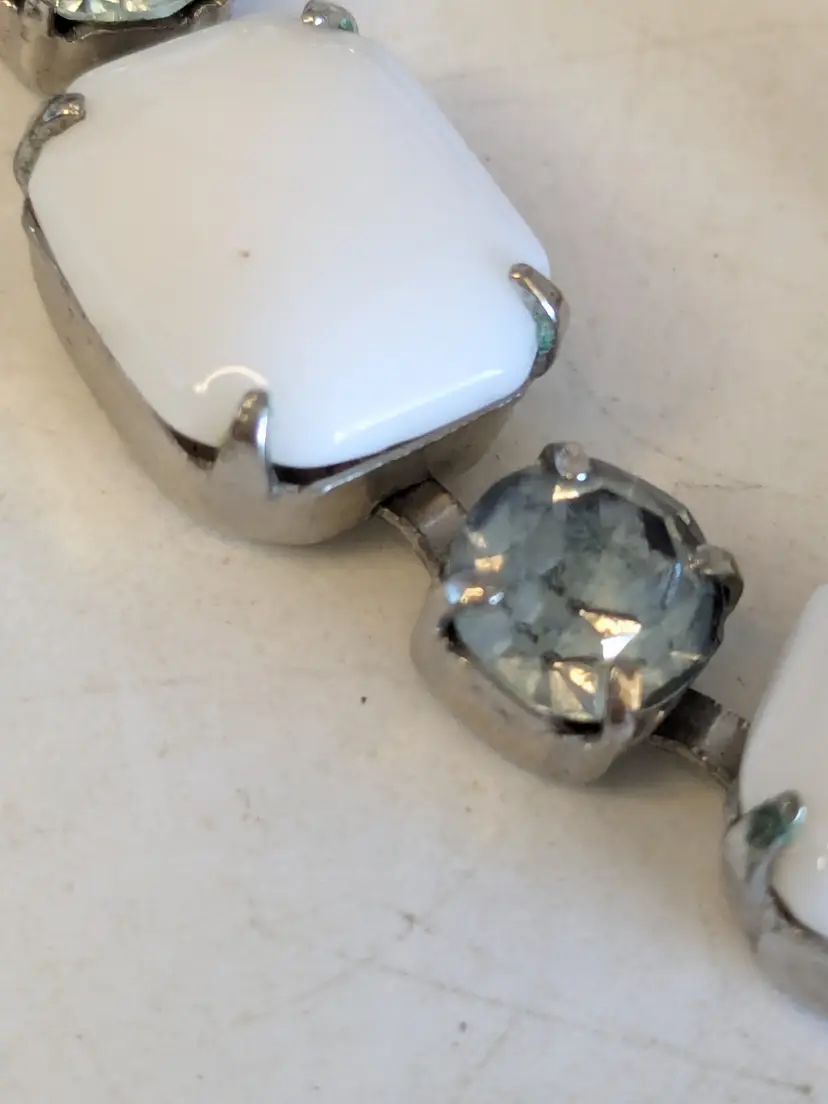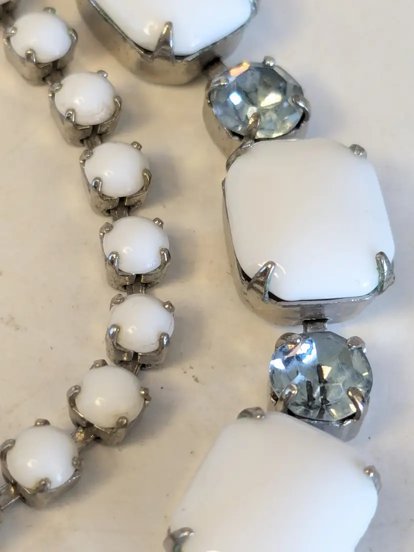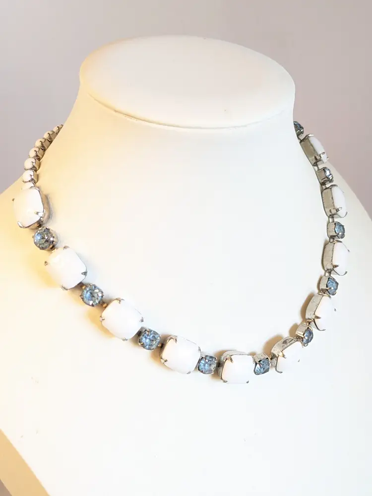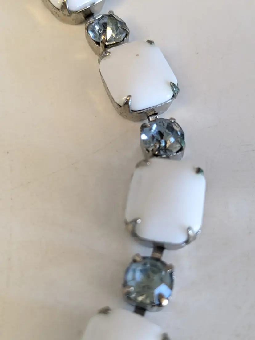 Just lovely! Good condition. Very minimal wear to silver tone. Necklace features prong set milk glass and light blue rhinestones. Adjustable choker necklace measures 12-15 1/2". wen