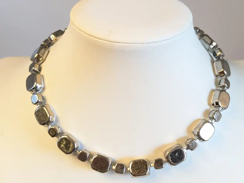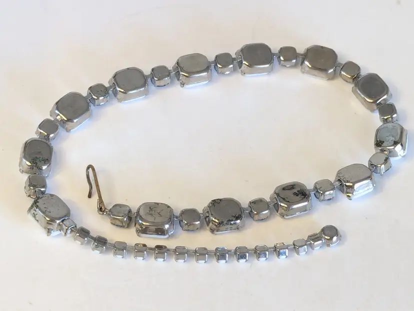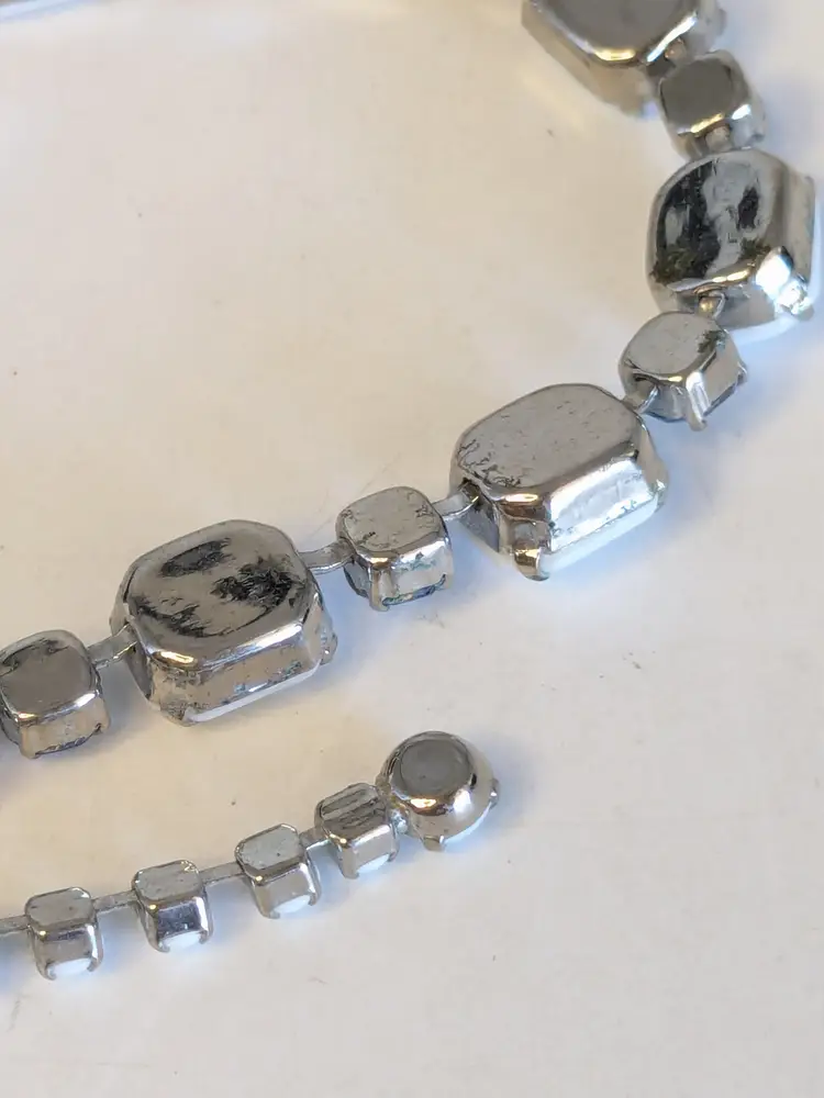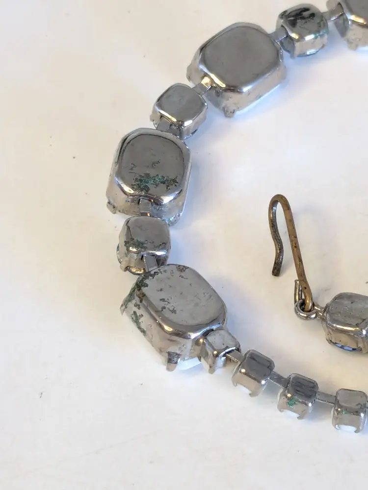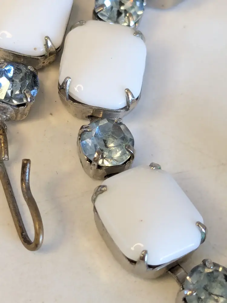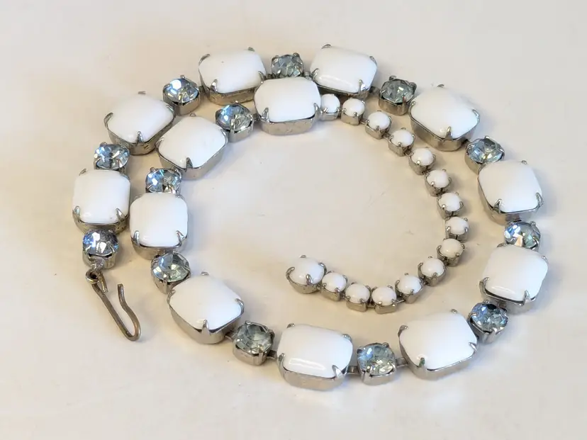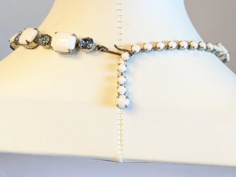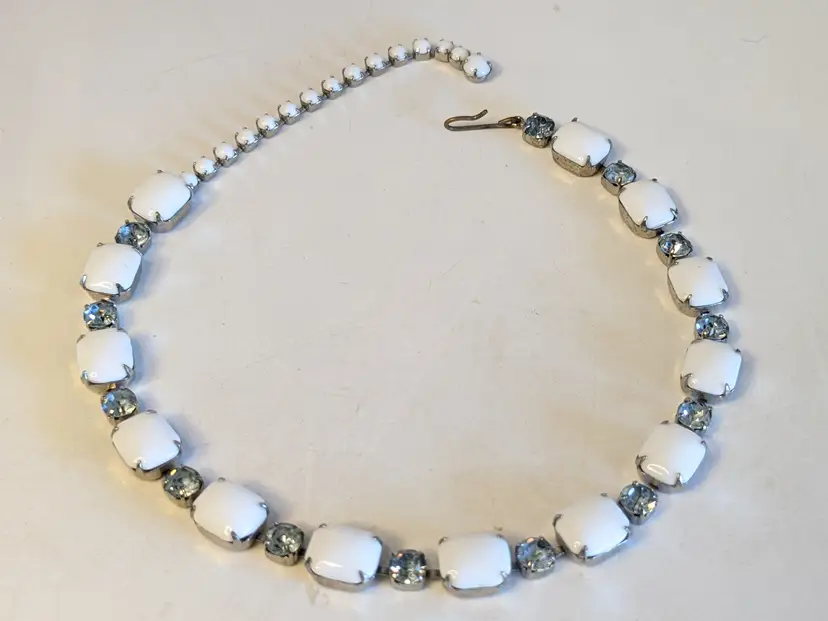 Just lovely! Good condition. Very minimal wear to silver tone. Necklace features prong set milk glass and light blue rhinestones. Adjustable choker necklace measures 12-15 1/2". wen