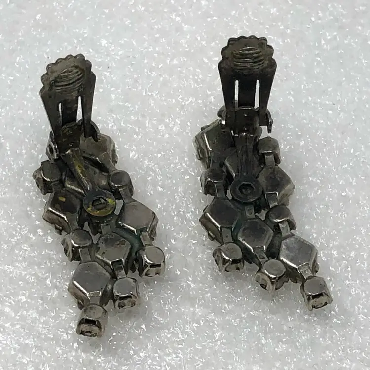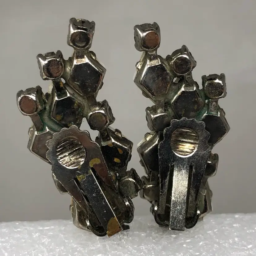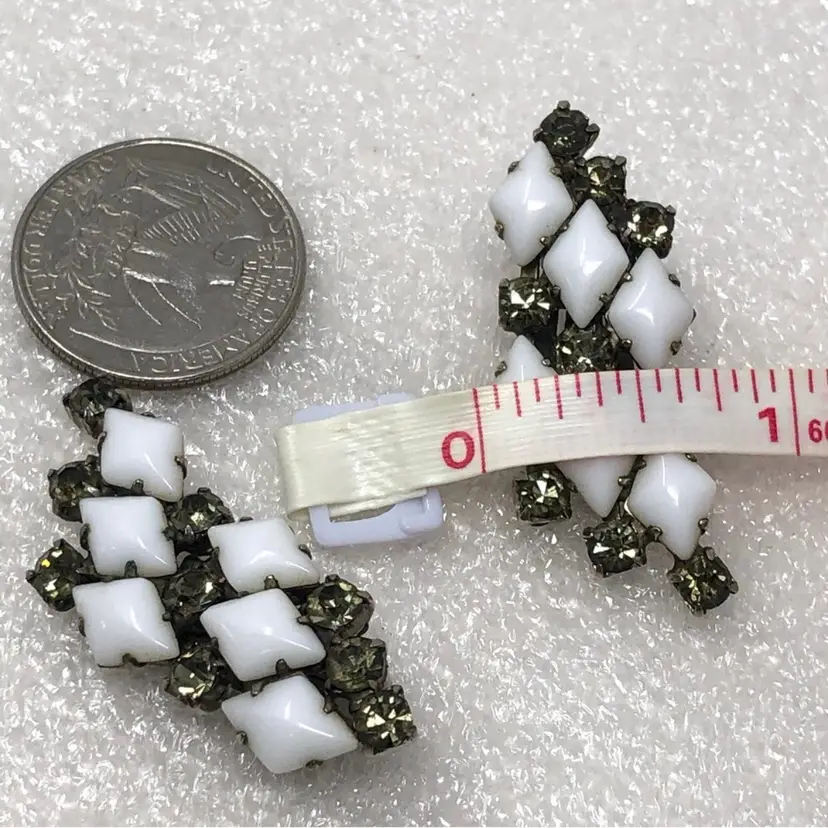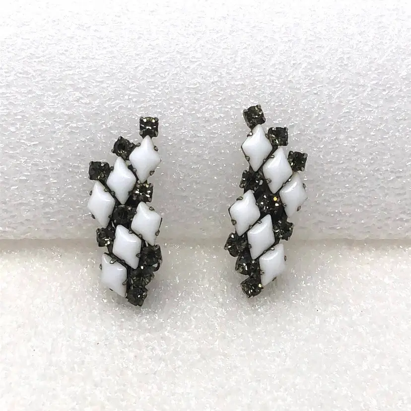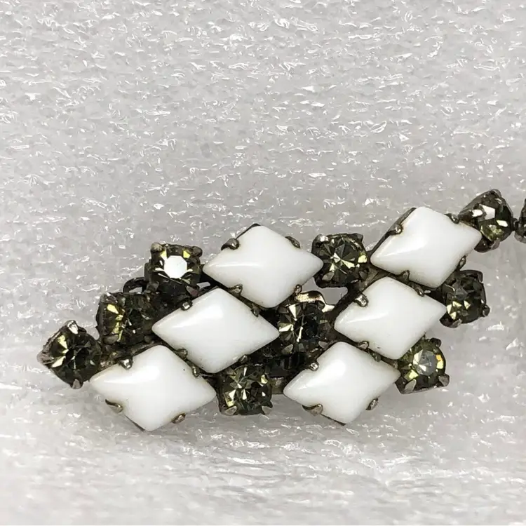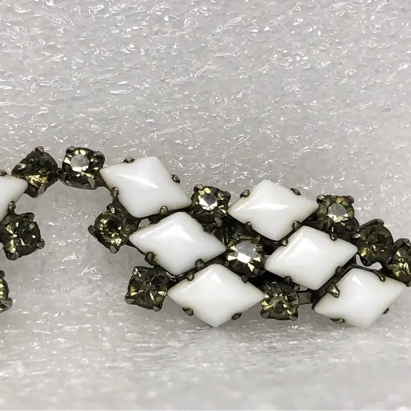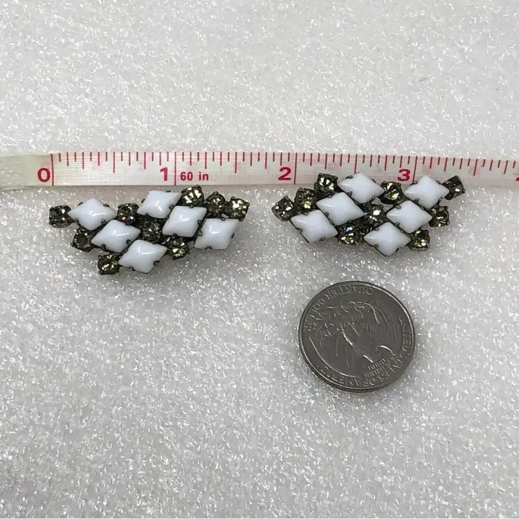 Diamond shaped white milk glass and rhinestone Prong set Clip on style Vintage unsigned Statement Estate
