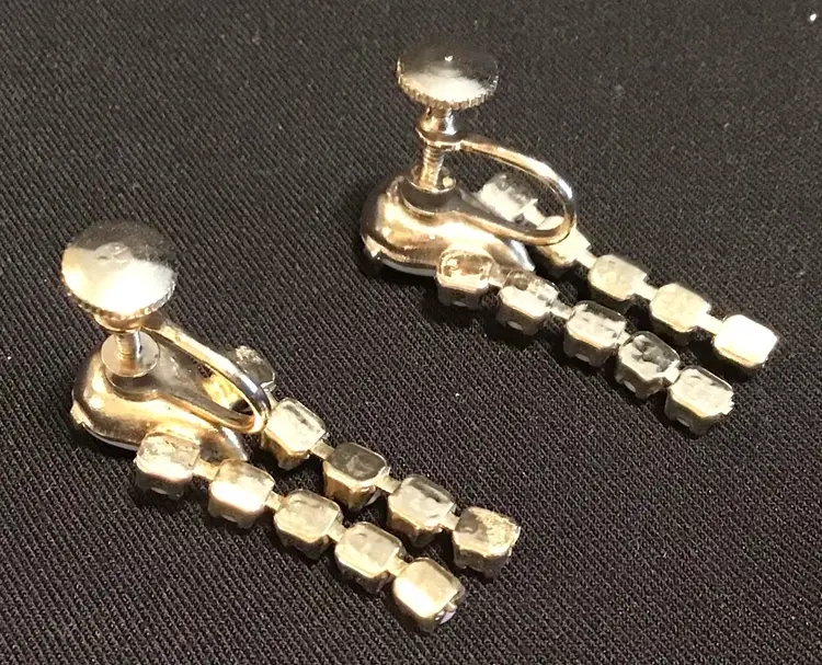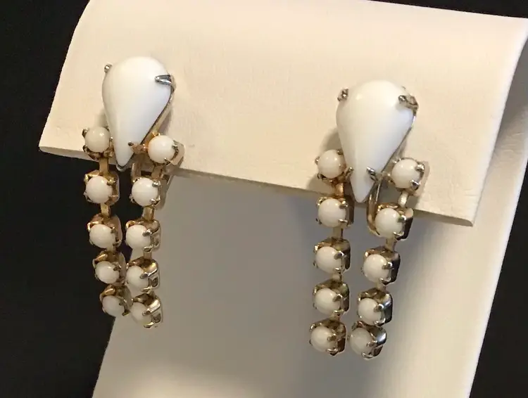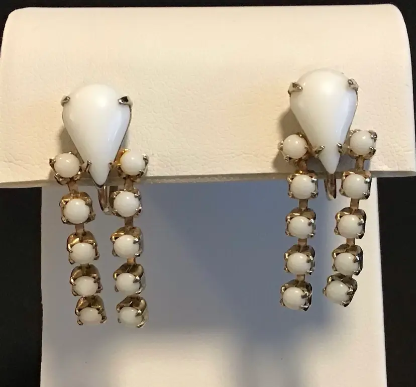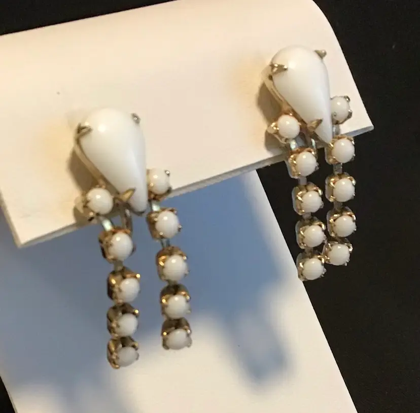 White prong set milk glass gold tone dangle screw back, 1-1/4” drop. #277