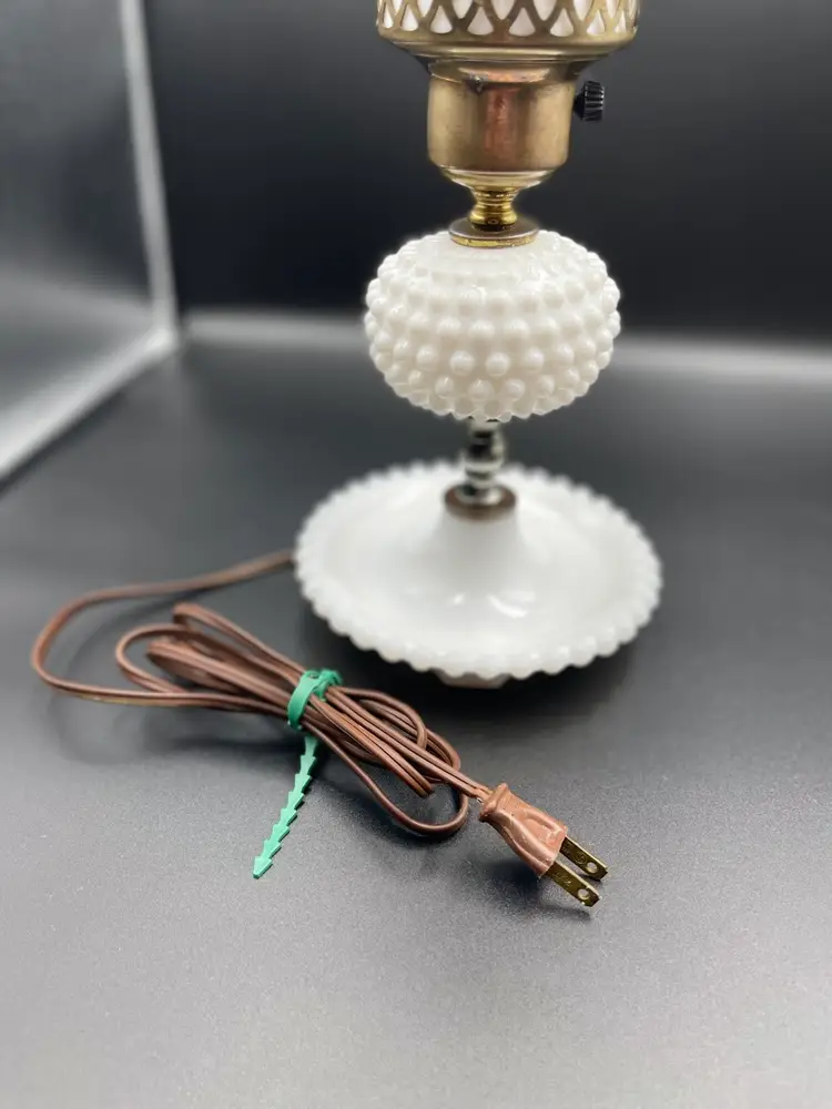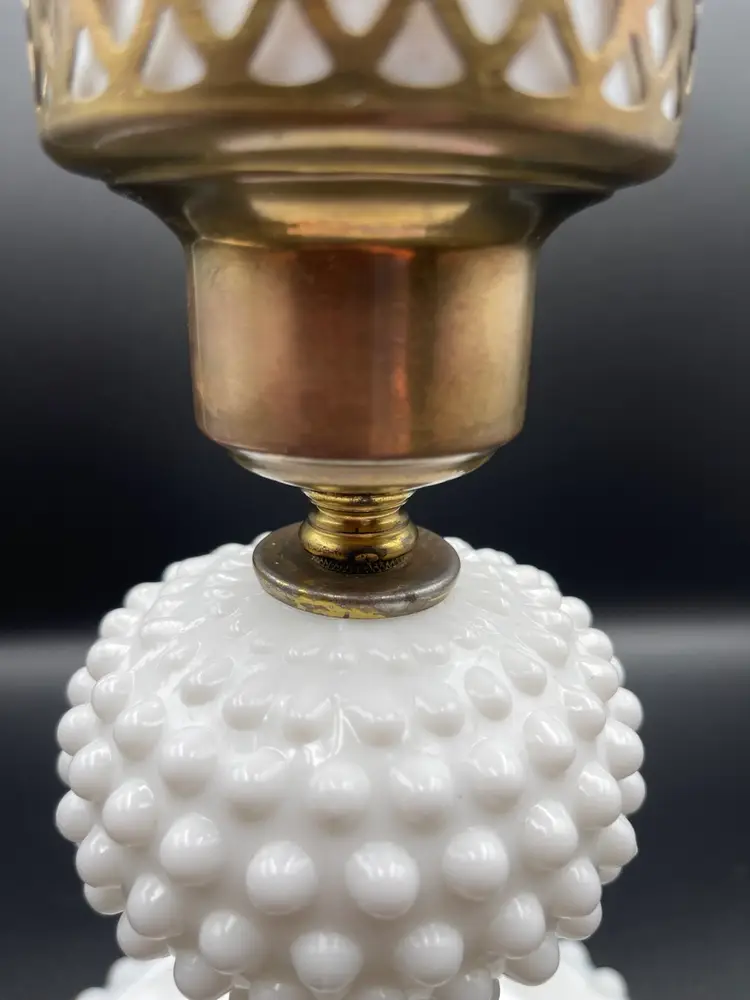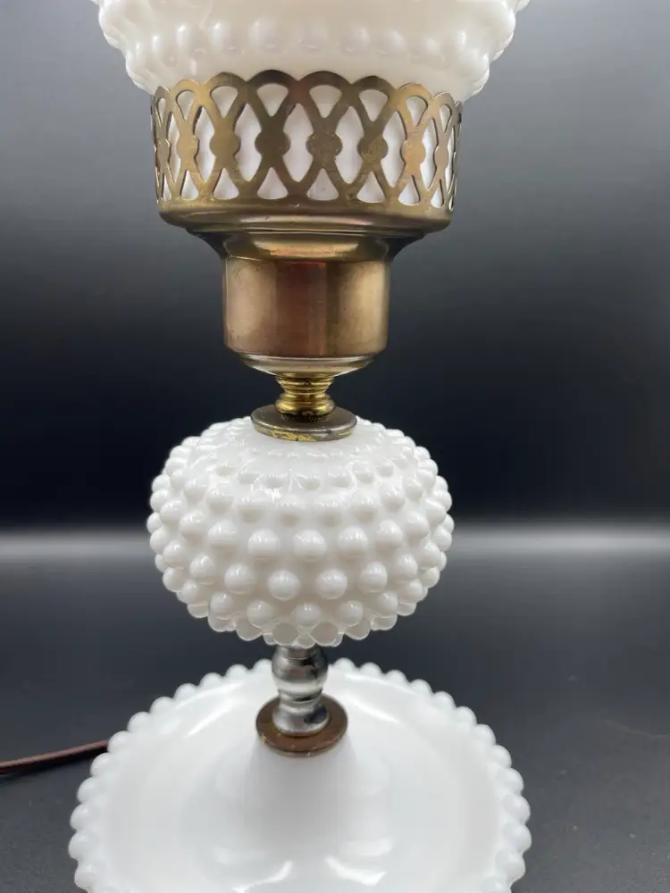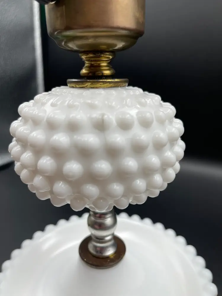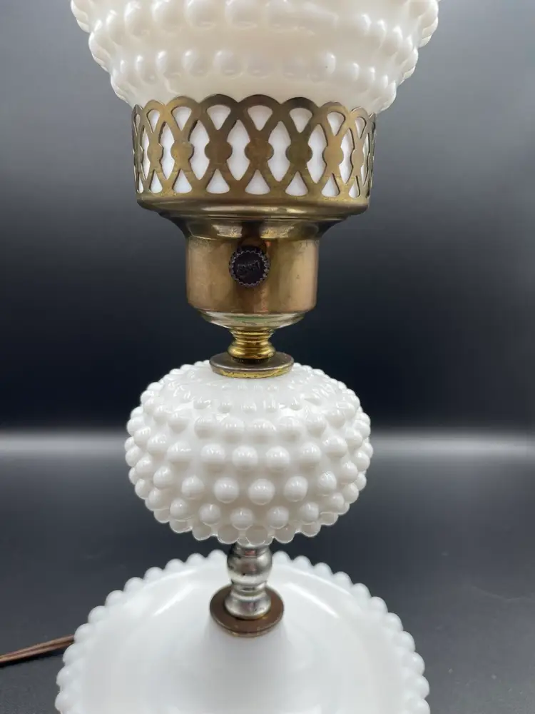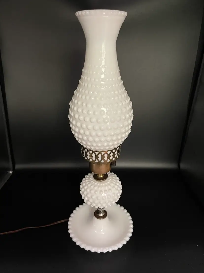 Vintage Milk Glass Hobnail Lamp. 18 inches x 6 inches. Wear on metal, chip on hurricane bottom rim that is not noticeable unless you remove the top shown in picture. There is also a hair line crack in the center glass piece shown in picture. Lamp works, but the wiring appears to be original to the lamp.