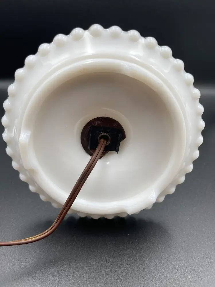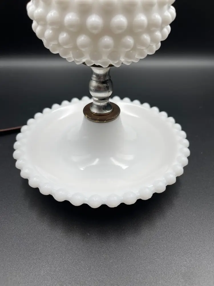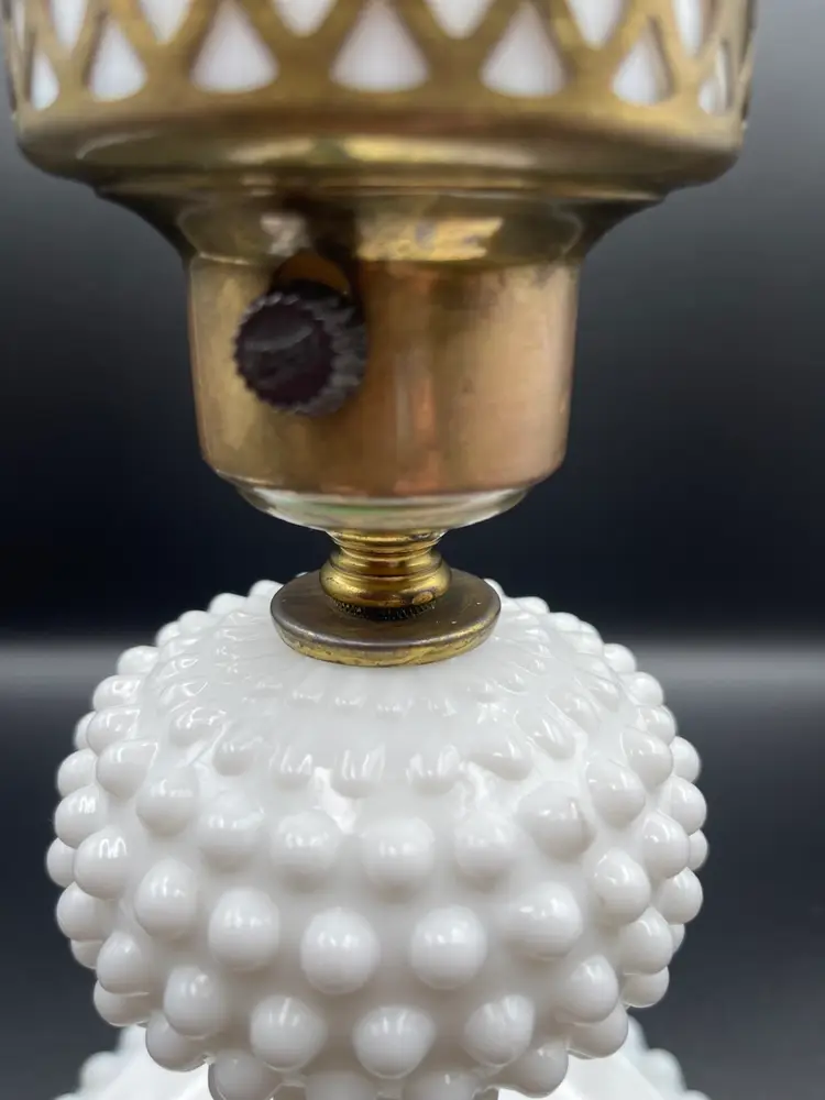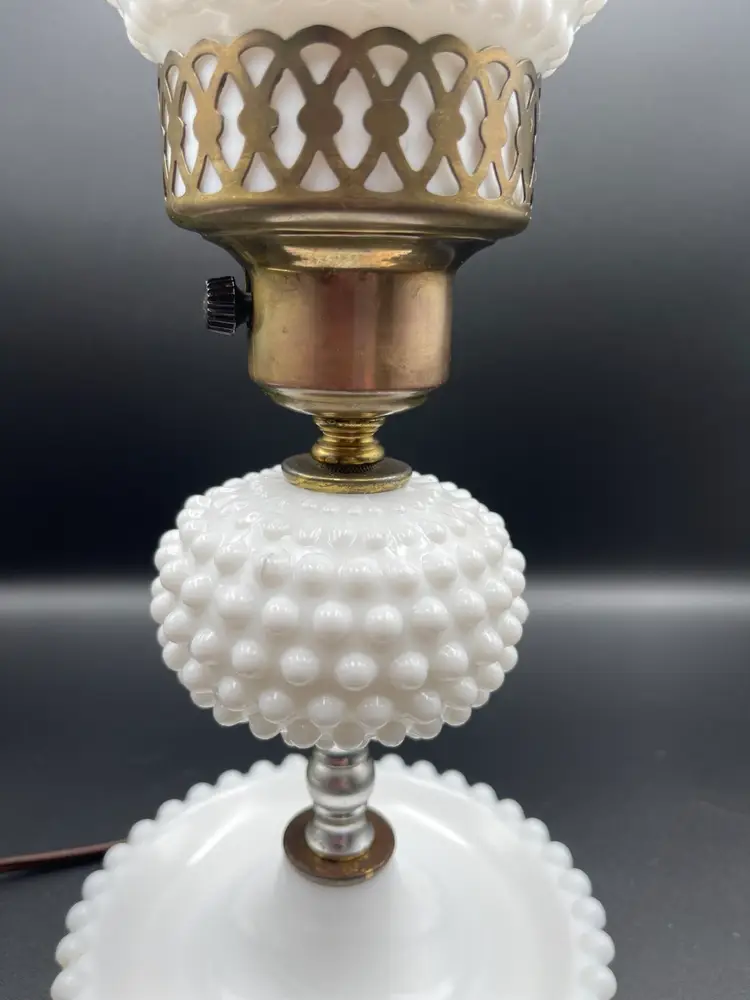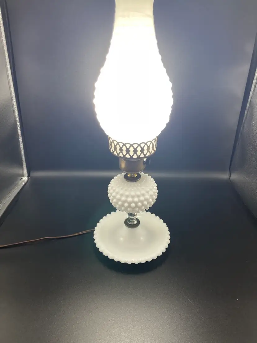 Vintage Milk Glass Hobnail Lamp. 18 inches x 6 inches. Wear on metal, chip on hurricane bottom rim that is not noticeable unless you remove the top shown in picture. There is also a hair line crack in the center glass piece shown in picture. Lamp works, but the wiring appears to be original to the lamp.