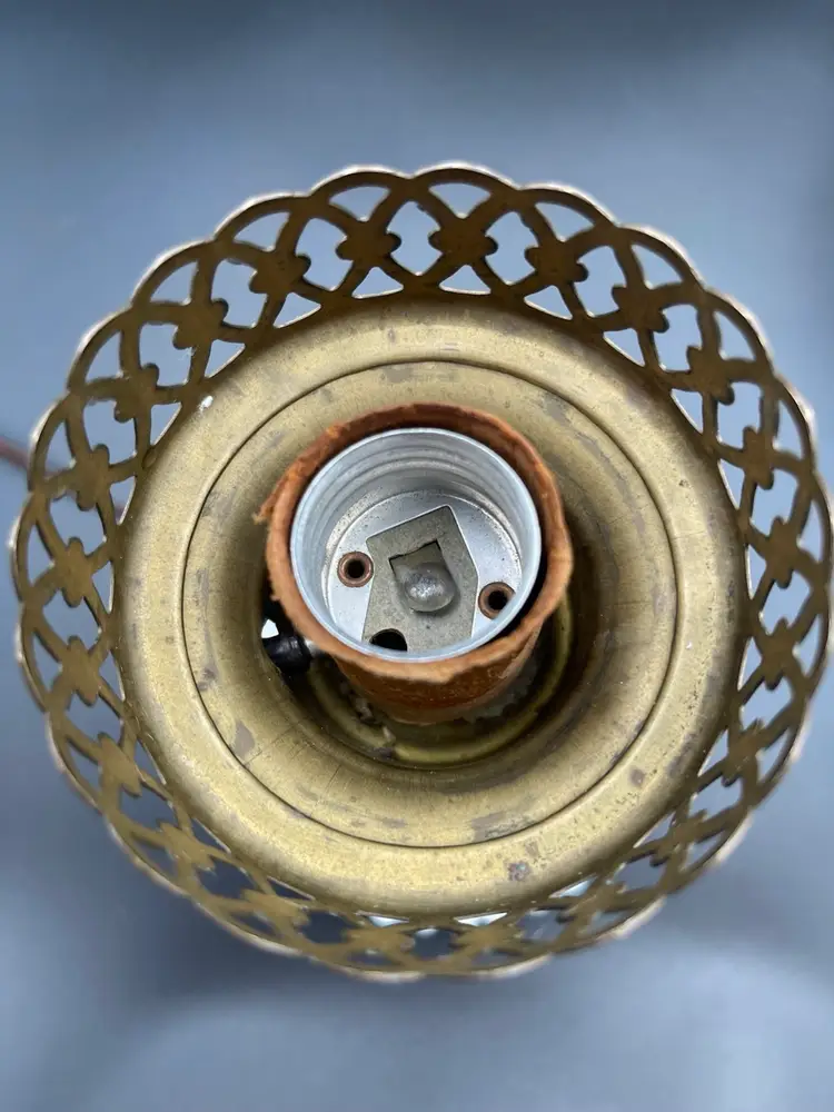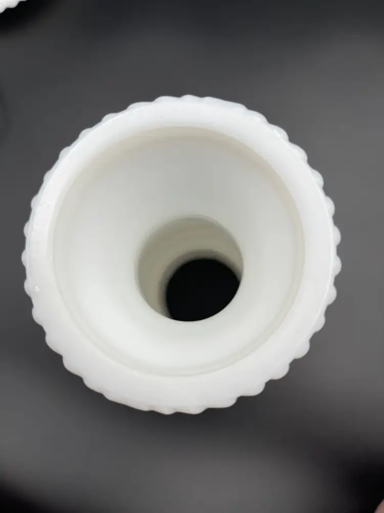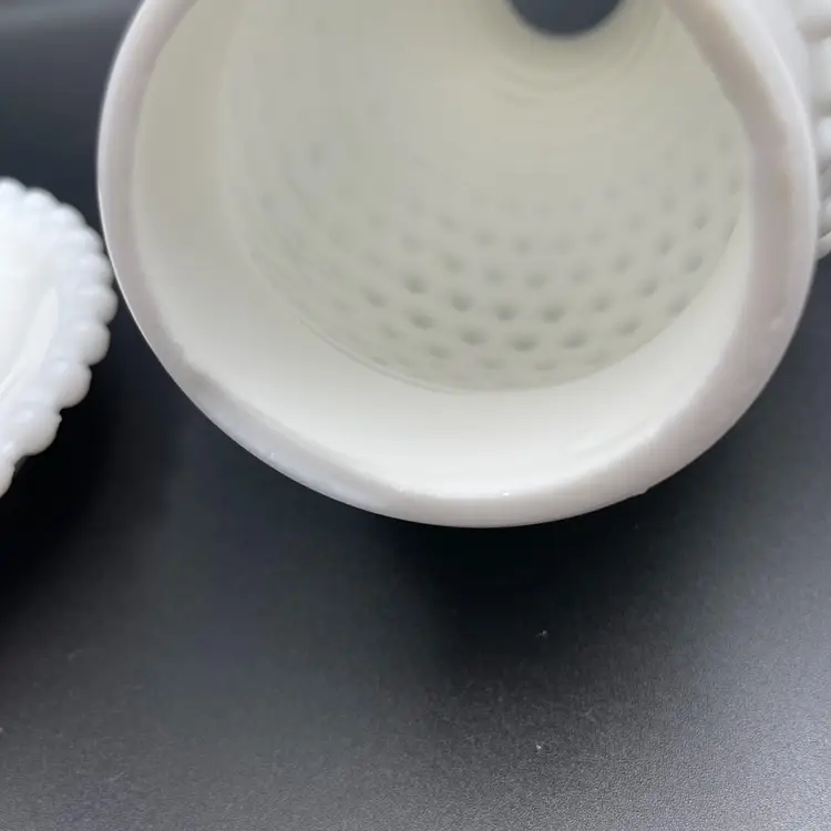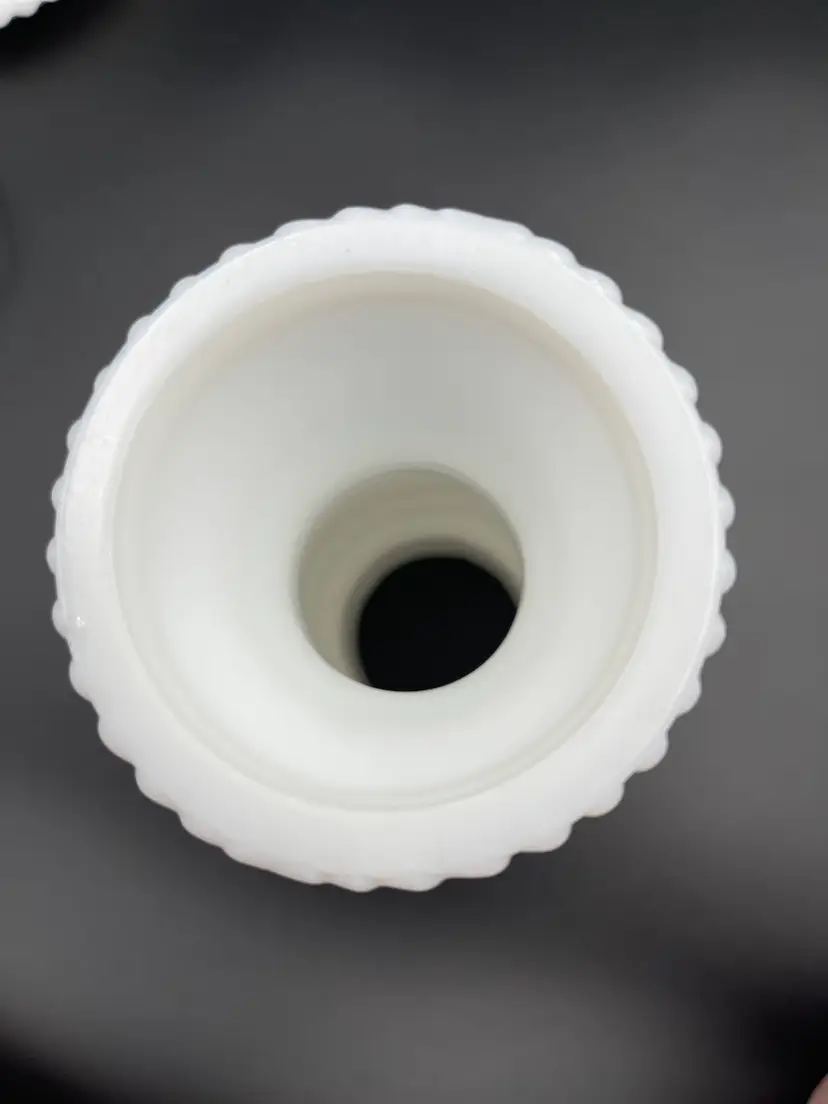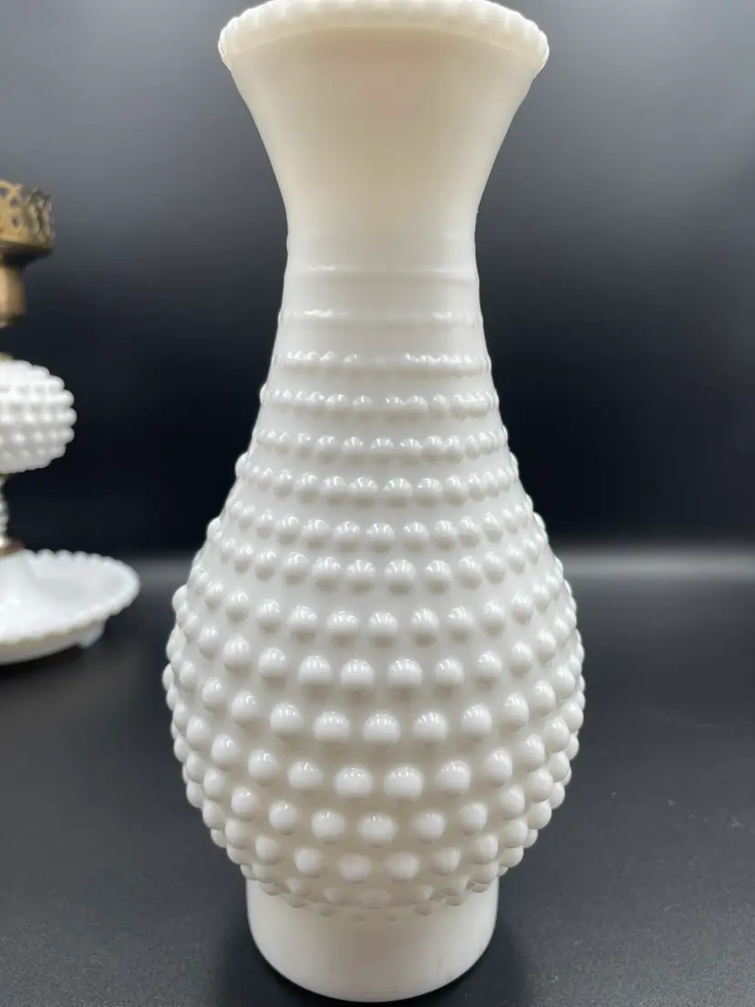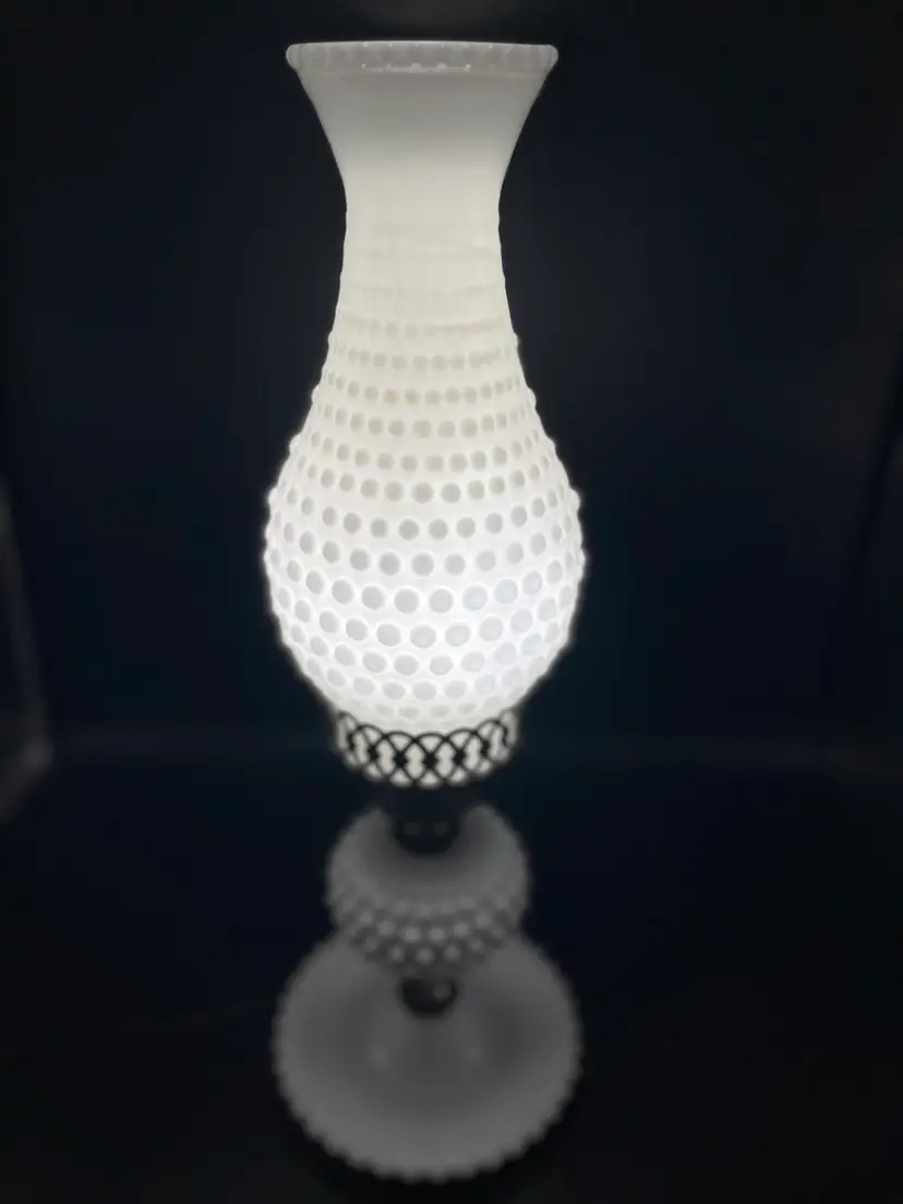 Vintage Milk Glass Hobnail Lamp. 18 inches x 6 inches. Wear on metal, chip on hurricane bottom rim that is not noticeable unless you remove the top shown in picture. There is also a hair line crack in the center glass piece shown in picture. Lamp works, but the wiring appears to be original to the lamp.