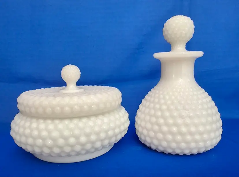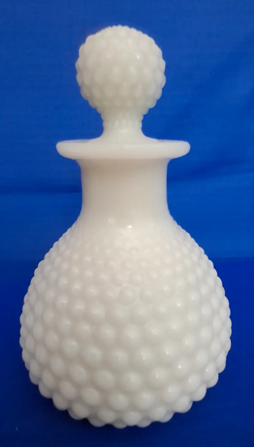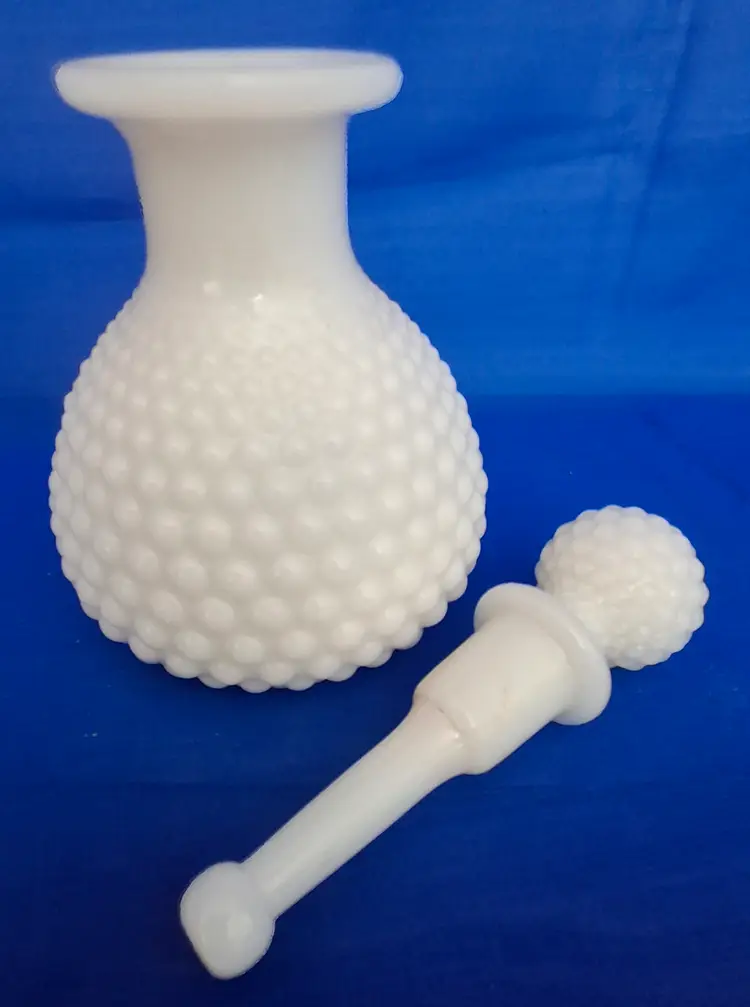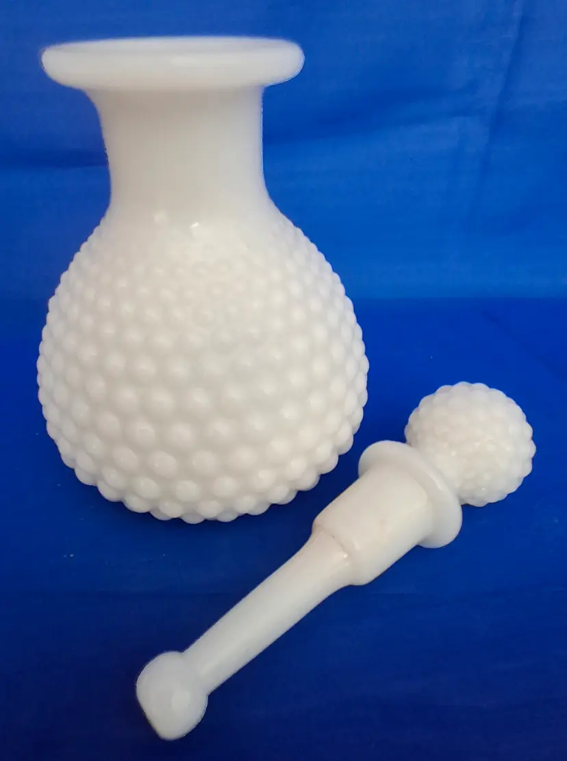 Vintage Milk Glass Hobnail Powder Box and Perfume Bottle with Dauber. The round powder box is 4 3/4" wide x 3 3/4" tall. The perfume bottle is 5" tall. The perfume bottle stopper has a molder glass dauber. Both pieces had a graduated hobnail design with the hobs getting smaller as the go up. The perfume has roughness at the opening. No chips, cracks, or repairs. Please view pictures and feel free to ask questions. Thank you for visiting my shop.