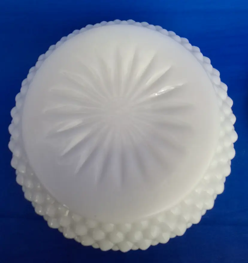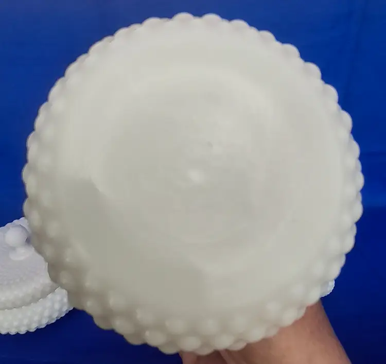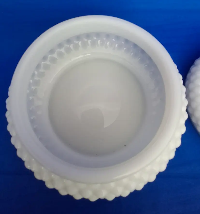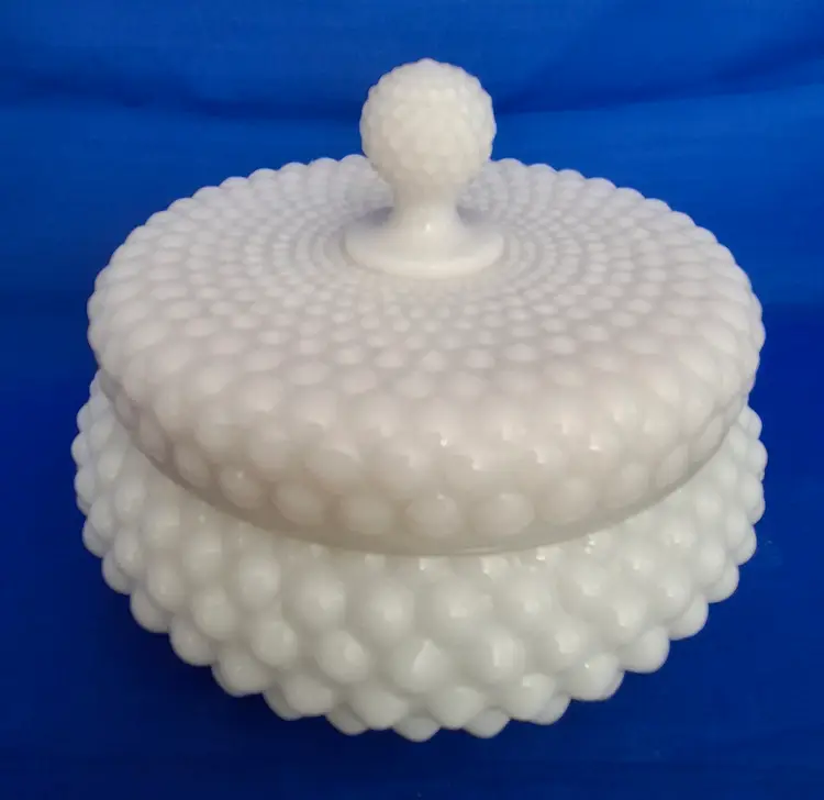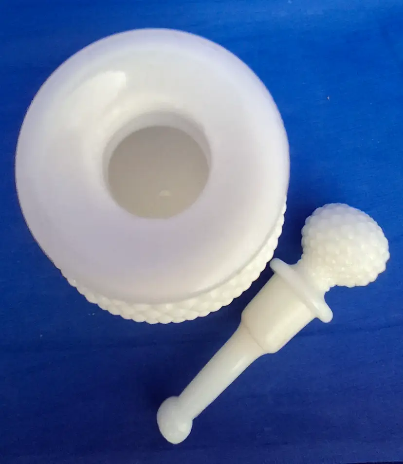 Vintage Milk Glass Hobnail Powder Box and Perfume Bottle with Dauber. The round powder box is 4 3/4" wide x 3 3/4" tall. The perfume bottle is 5" tall. The perfume bottle stopper has a molder glass dauber. Both pieces had a graduated hobnail design with the hobs getting smaller as the go up. The perfume has roughness at the opening. No chips, cracks, or repairs. Please view pictures and feel free to ask questions. Thank you for visiting my shop.