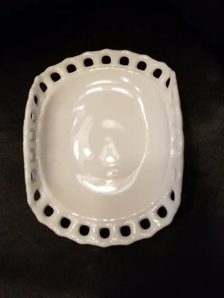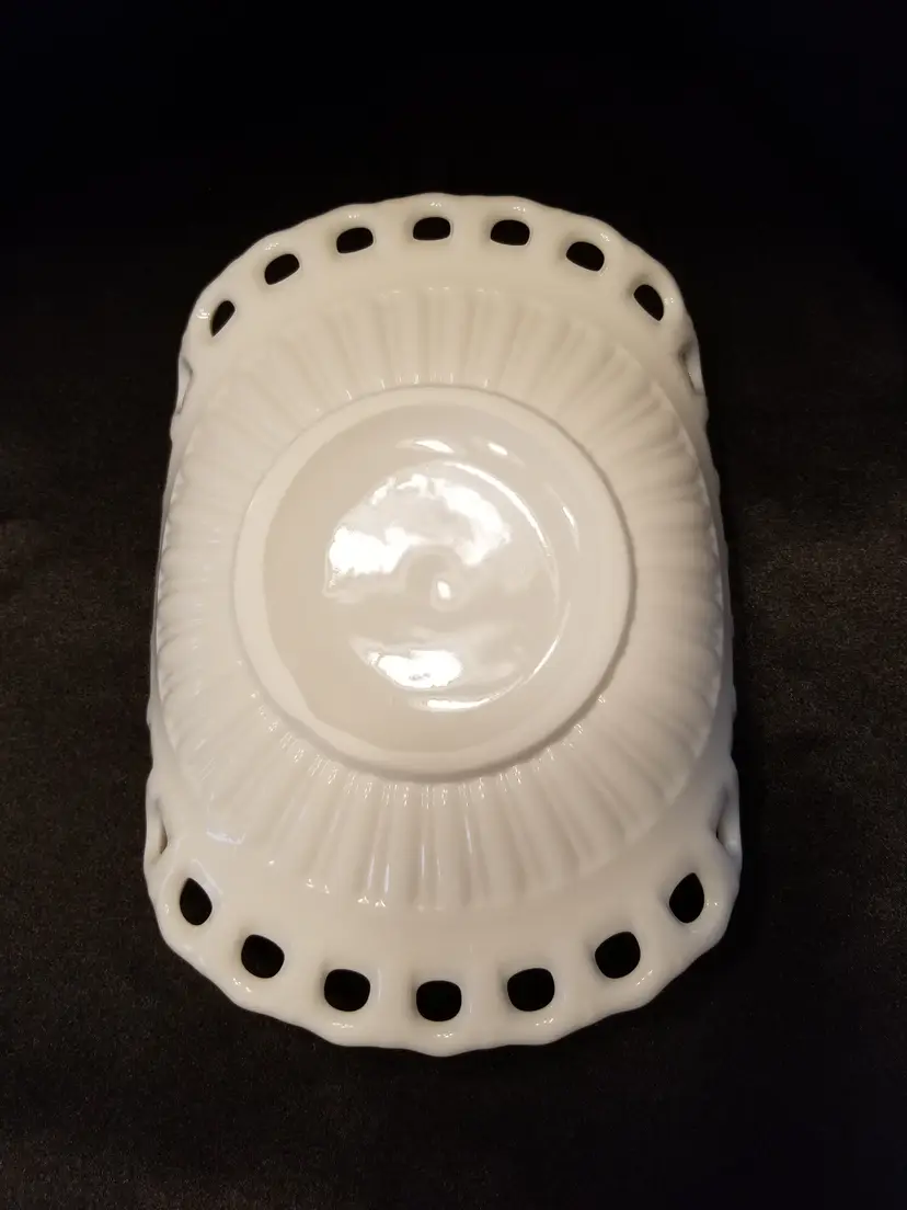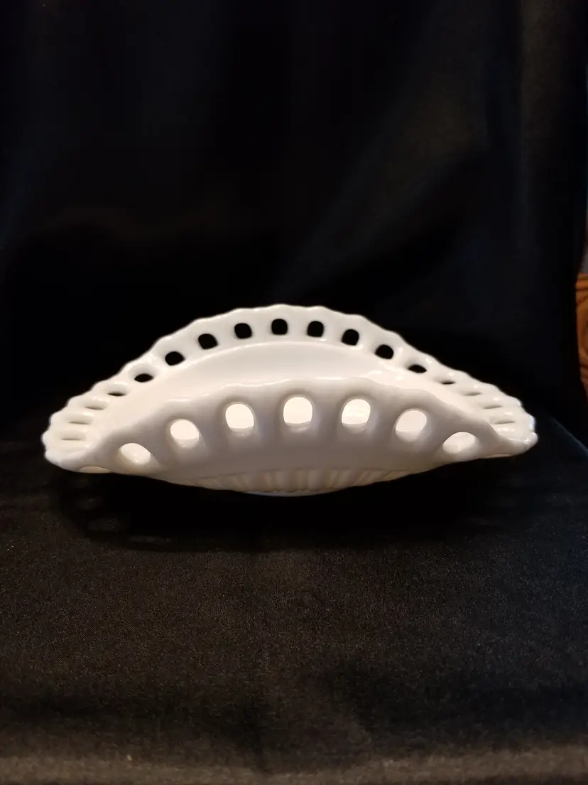 Vintage Milk Glass Open Lace Fruit Flat Fruit Basket is 7 3/4" wide. No chips, cracks or repairs.