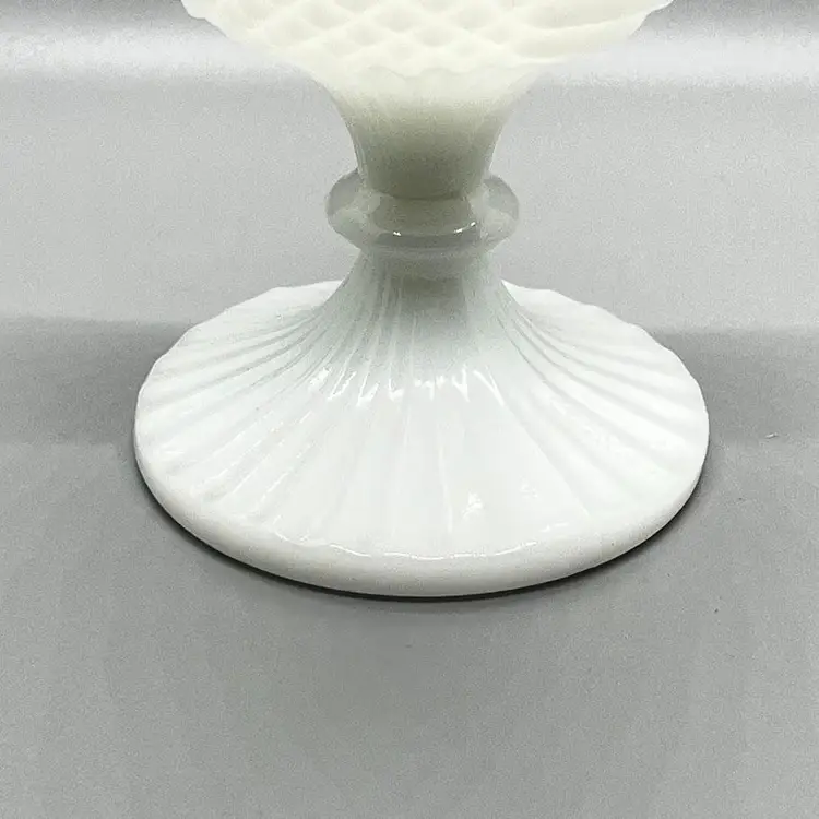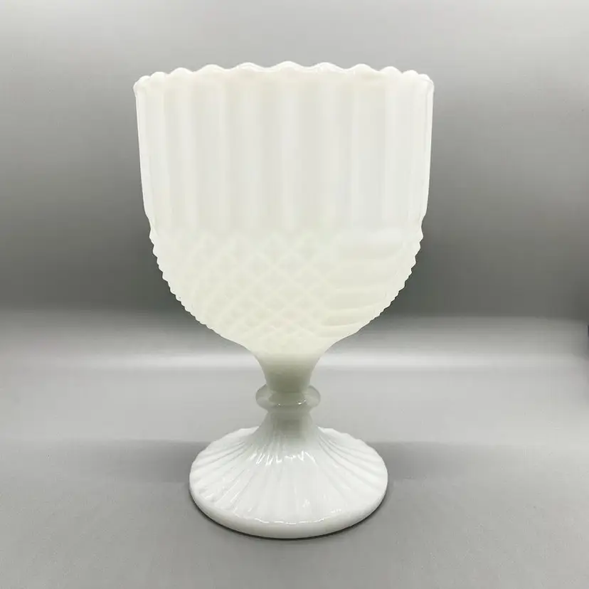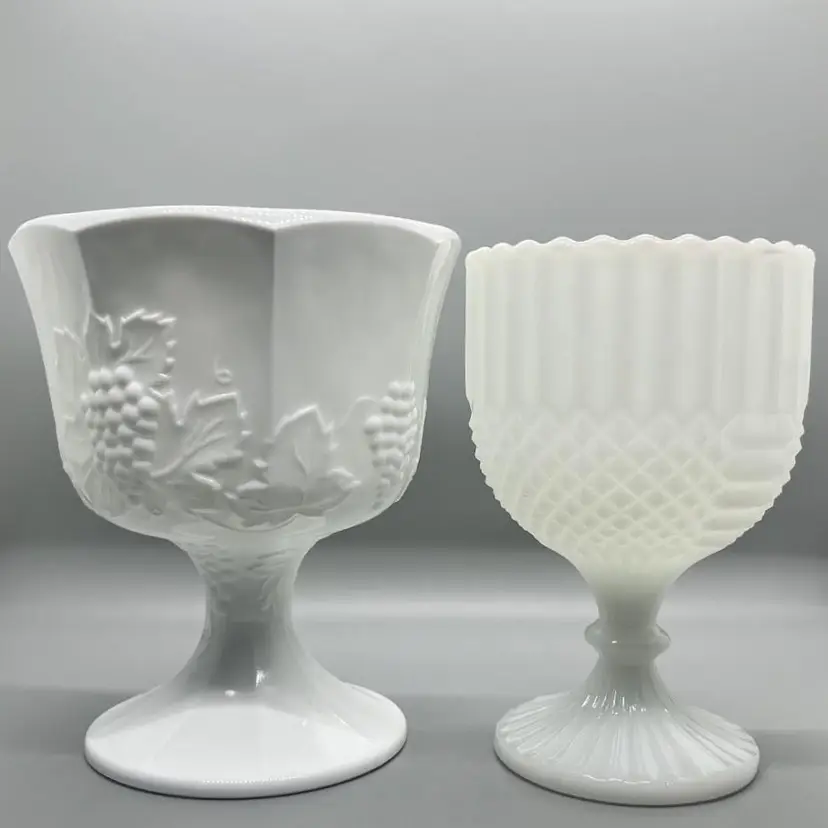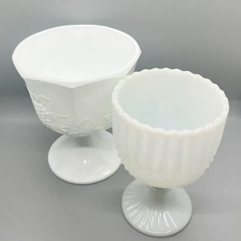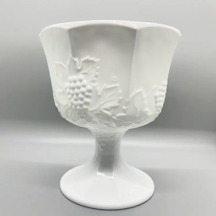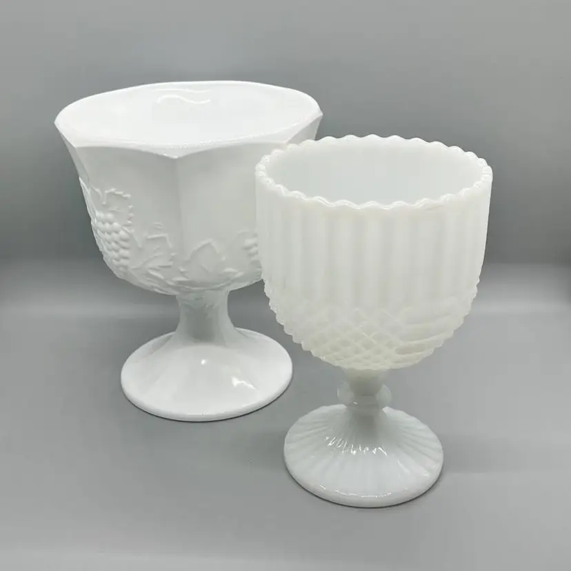 Elevate your home decor with this charming set of vintage milk glass compotes. Featuring intricate grapevine and diamond patterns, these pieces are perfect for displaying fruit, flowers, or as standalone decorative accents. Add a touch of elegance to any room with these timeless treasures. Large: 6.5" Tall x 5.25" Diameter Bowl x 4" Diameter Base Medium: 6" Tall x 4" Diameter Bowl x 3" Diameter Base