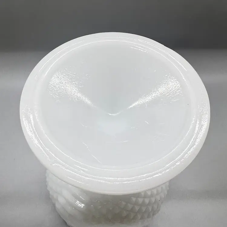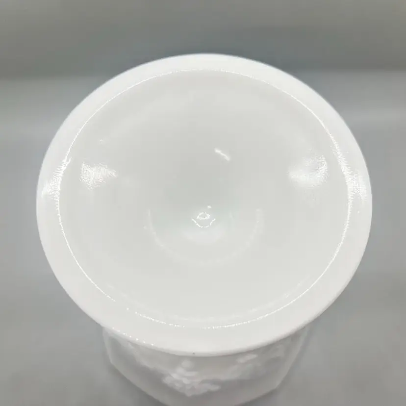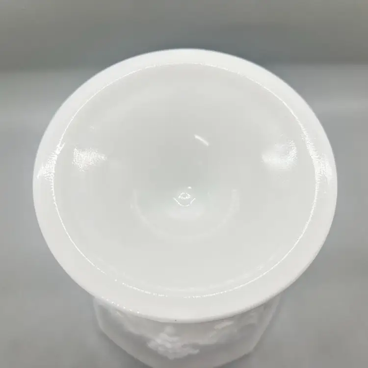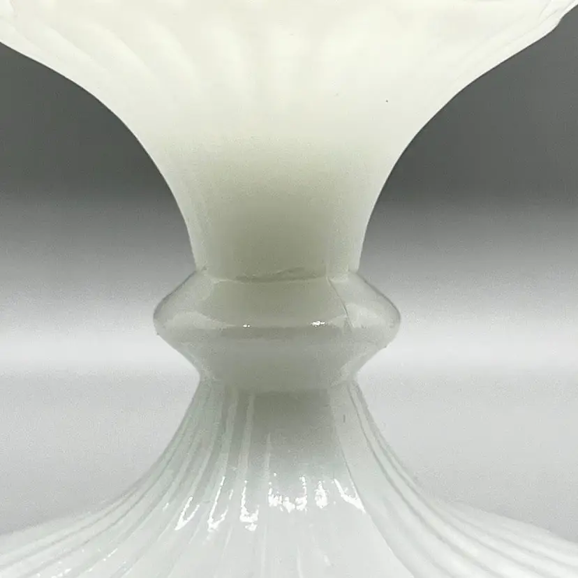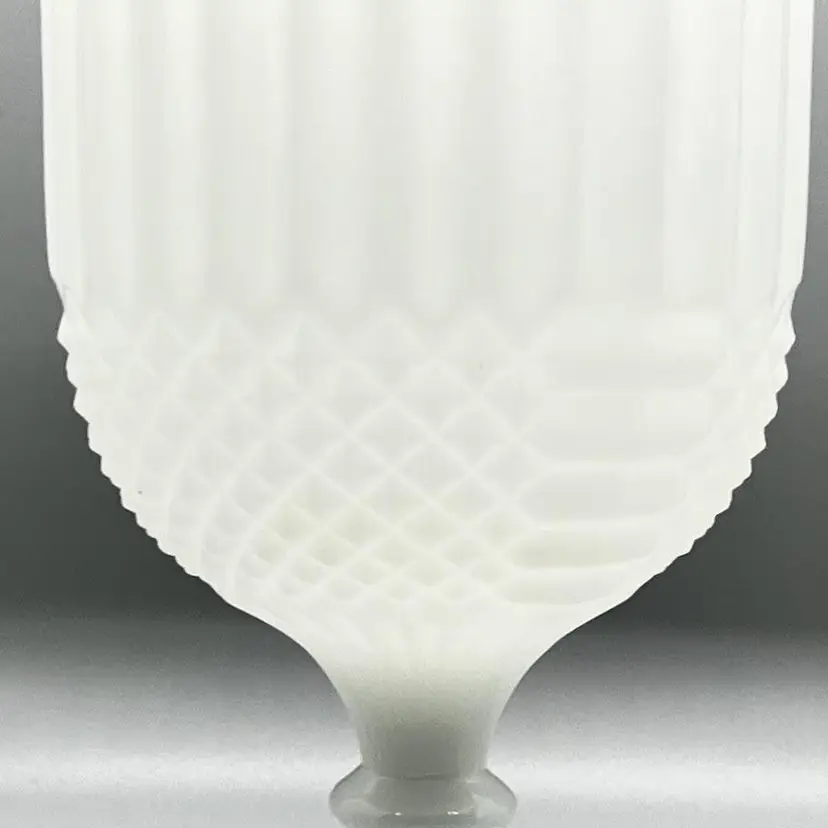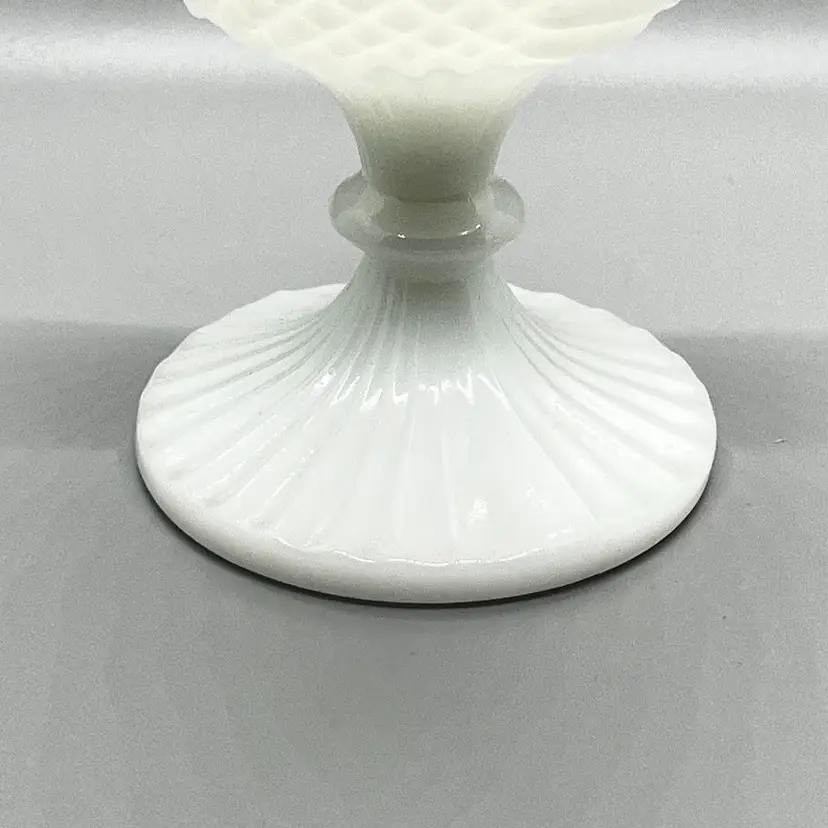 Elevate your home decor with this charming set of vintage milk glass compotes. Featuring intricate grapevine and diamond patterns, these pieces are perfect for displaying fruit, flowers, or as standalone decorative accents. Add a touch of elegance to any room with these timeless treasures. Large: 6.5" Tall x 5.25" Diameter Bowl x 4" Diameter Base Medium: 6" Tall x 4" Diameter Bowl x 3" Diameter Base