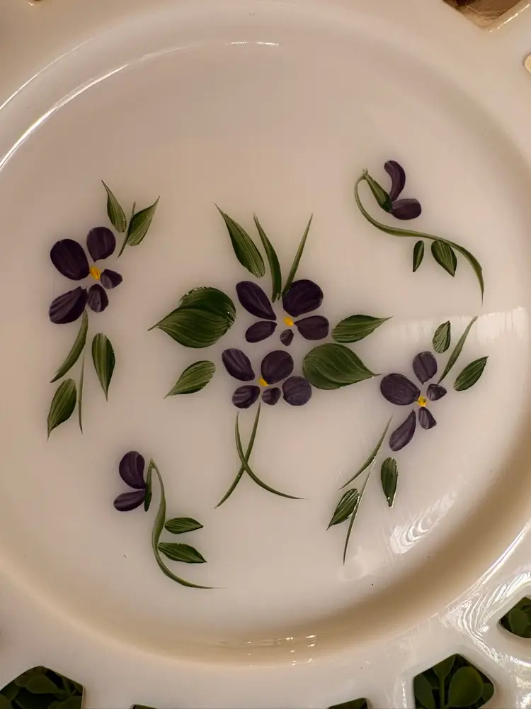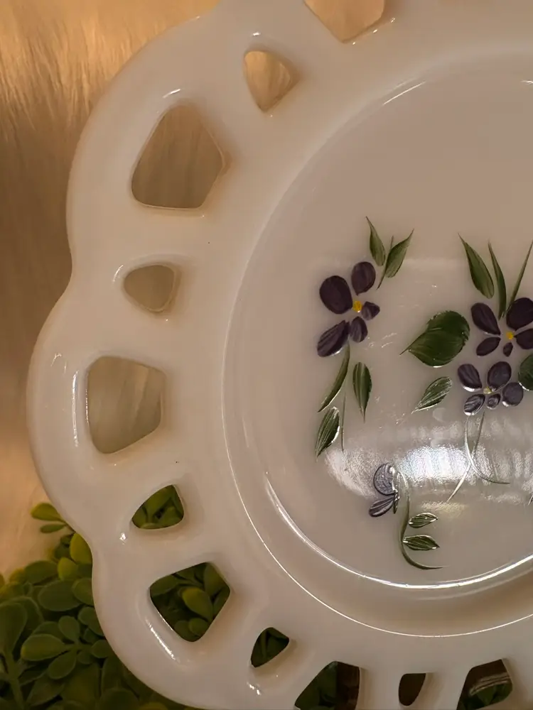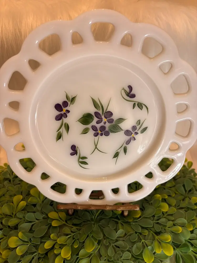 Vintage Hand Painted Milk Glass Plate with Reticulated Edge 8.5”, excellent condition