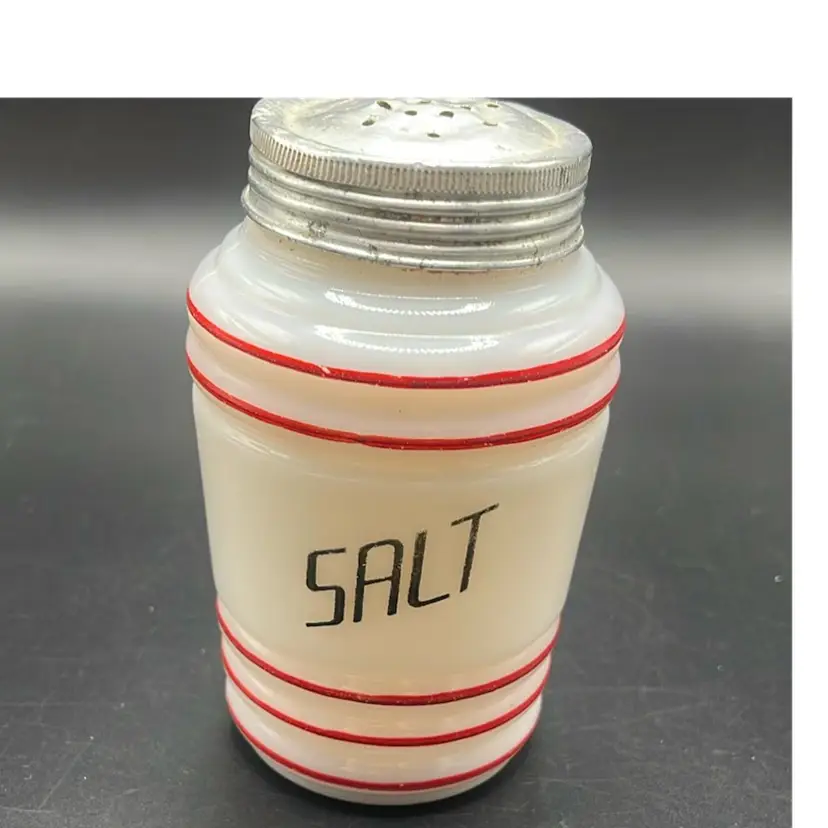 Rare vintage milk glass salt shaker with bold black “SALT” lettering and striking red ringed bands, dating back to the 1930s–1940s. This antique kitchen staple features a classic Art Deco font and is a more unusual variant—most commonly, these were made with red lettering.