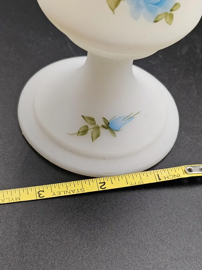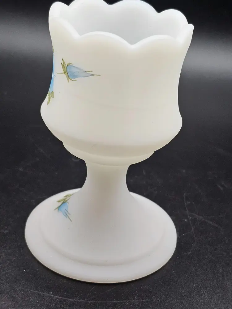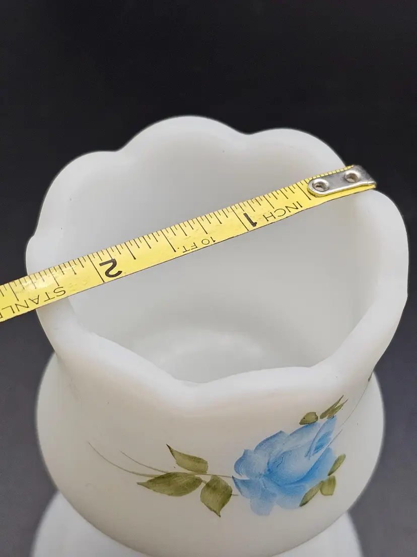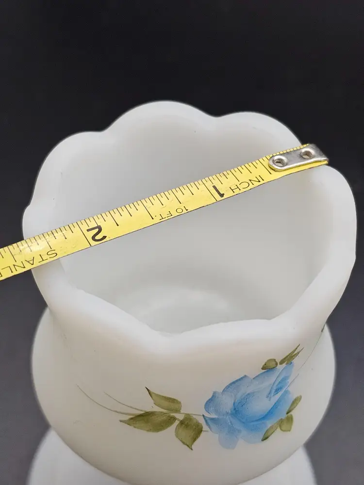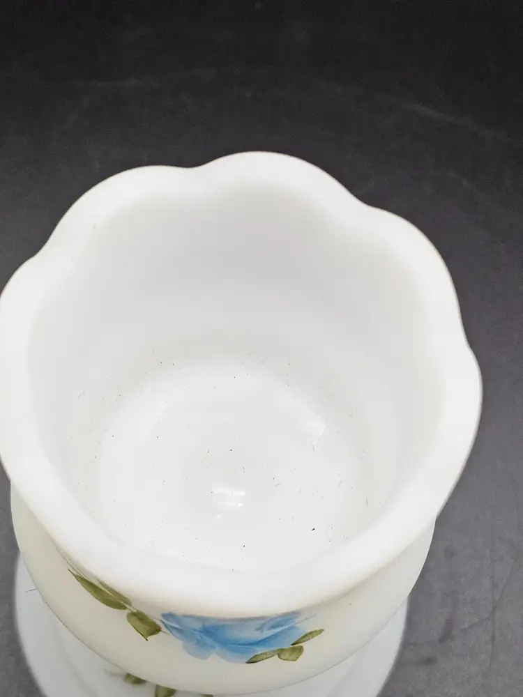 This vintage milk glass vase features a lovely blue floral design. Perfect for small arrangements or as a decorative piece.