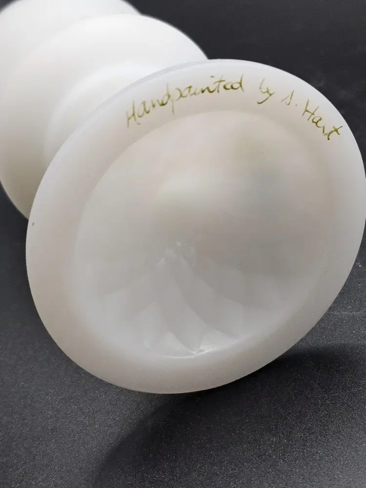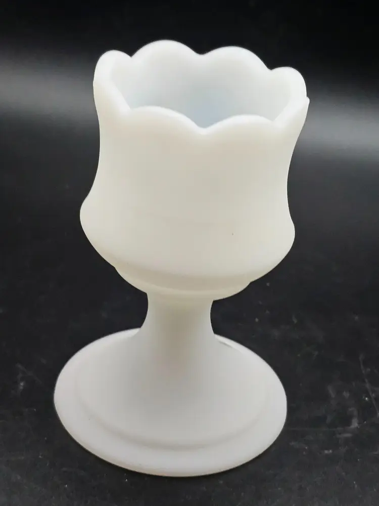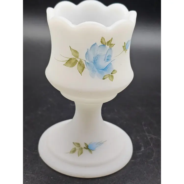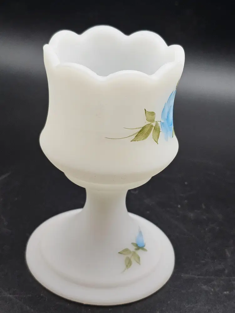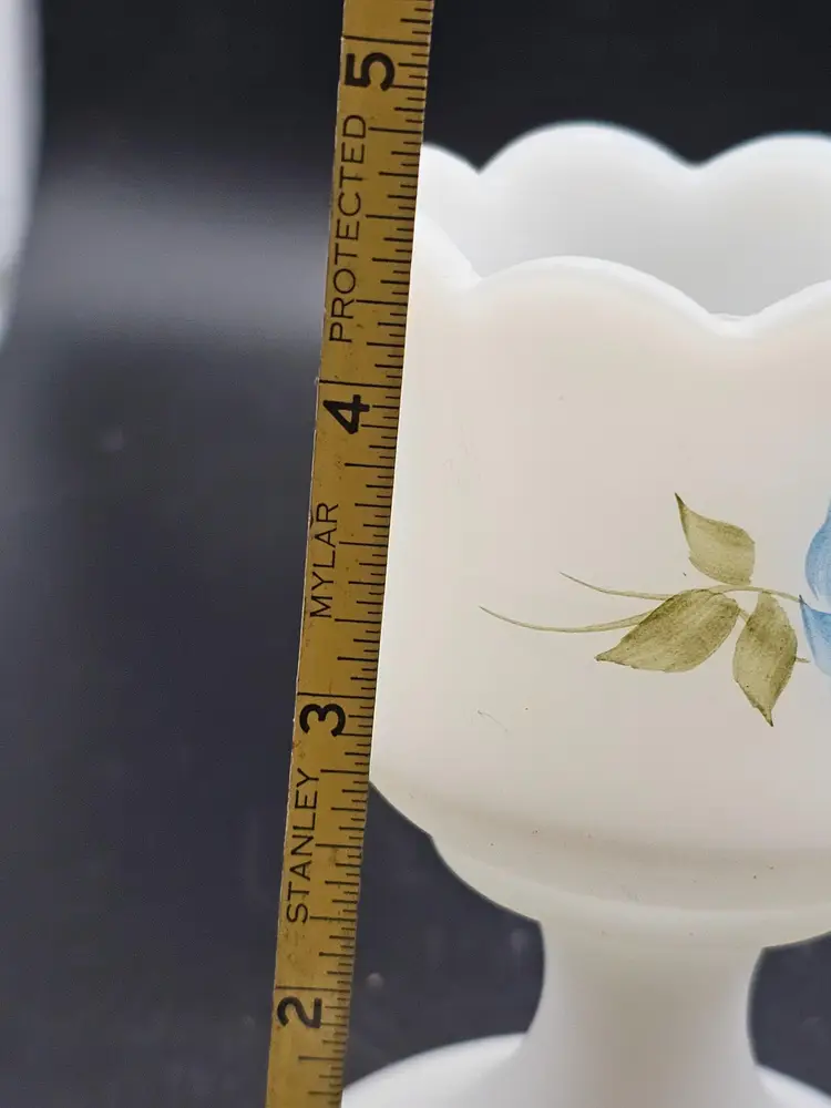 This vintage milk glass vase features a lovely blue floral design. Perfect for small arrangements or as a decorative piece.