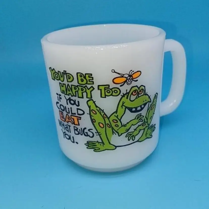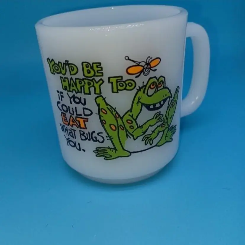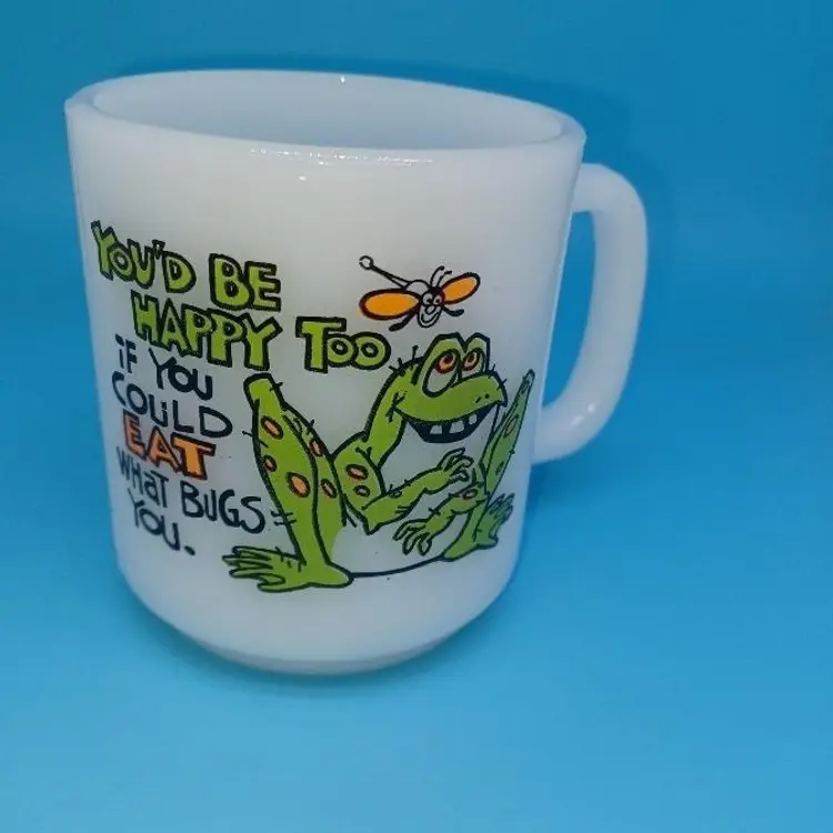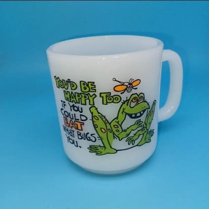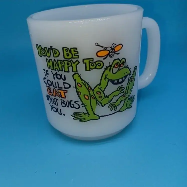 This funny milk glass mug is perfect for the vintage frog lover. The bright white milk glass is embellished with an illustration of a frog and insect with the statement “You’d be happy too if you could eat what bugs you” The graphics are bright and clear.