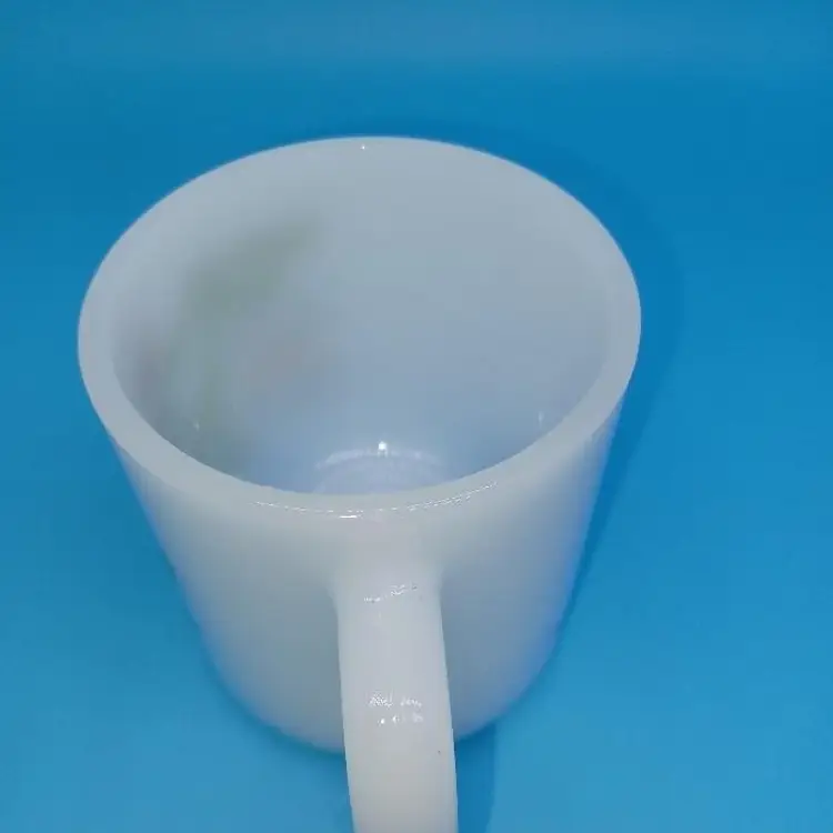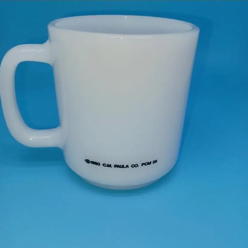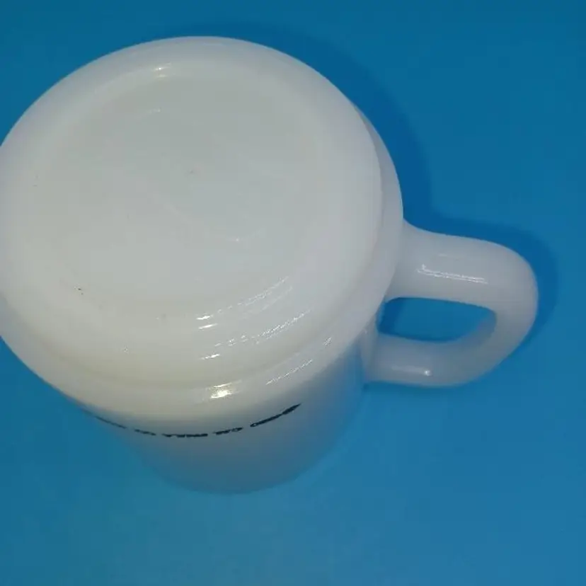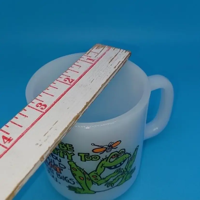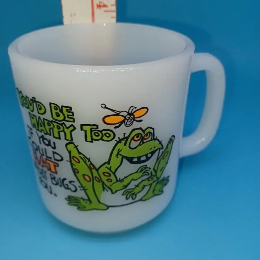 This funny milk glass mug is perfect for the vintage frog lover. The bright white milk glass is embellished with an illustration of a frog and insect with the statement “You’d be happy too if you could eat what bugs you” The graphics are bright and clear.
