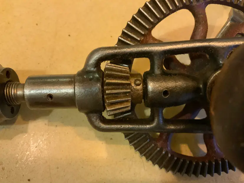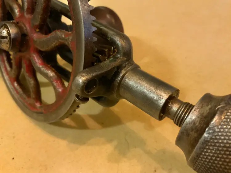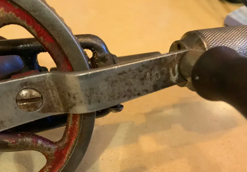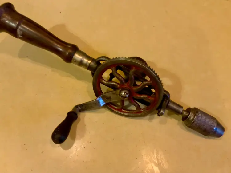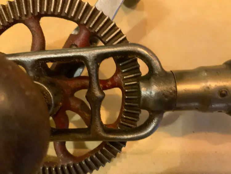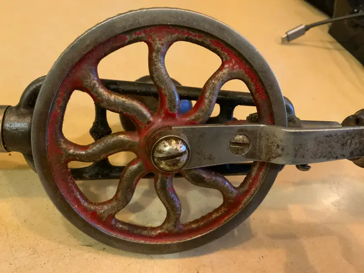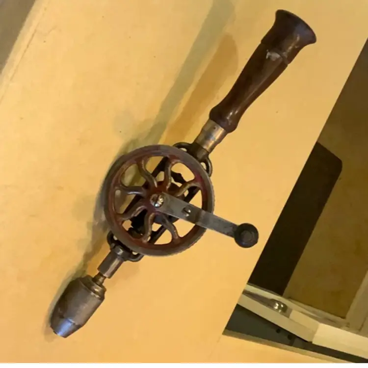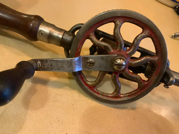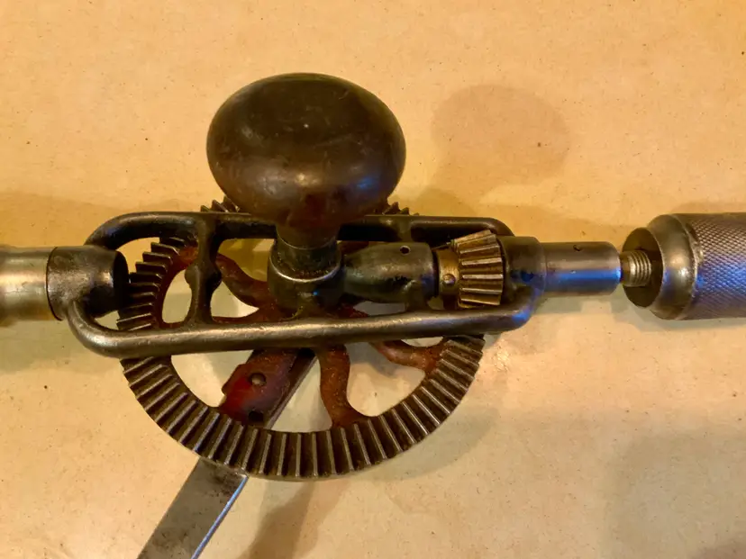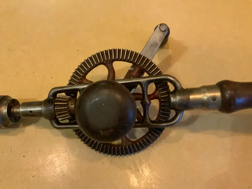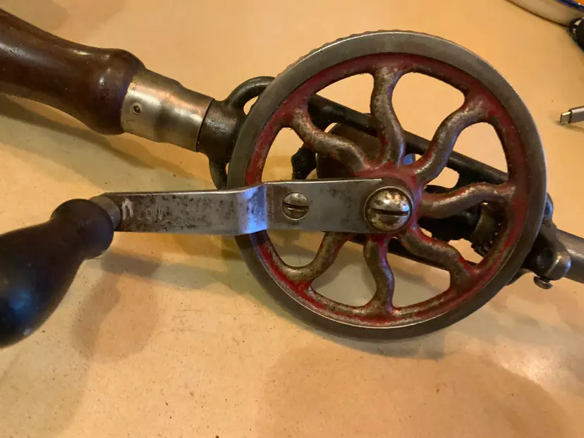 I have for sale a Miller Falls No. 2 hand drill. Its date of manufacture can be placed sharply between 1929 (when the reinforced spindle housing was introduced) and 1931, when Miller Falls moved its manufacturing facilities to Greenfield MA. This is established because the handle has the triangular logo (introduced in 1921) and the MILLER FALLS, MASS location stamped on the handle along with the logo. The logo is too faint to photograph clearly but is visible, showing the Diamond logo and Miller Falls production location. This drill is in really nice condition, and operates smoothly. It is missing the adjustable friction roller, as are almost all of these old drills. That does not significantly affect operation. There is very, very light, superficial rust on the body and chuck. The handles are all made of hardwood and intact, including the side handle, which many of these drill are missing. It has the triangular logo"chef's cap" head on the handle. All the original drill bits that were in the handle when sold are missing. There are no cracks in any of the wood handles, and no teeth damaged or missing from the drive mechanism. The drill is very smooth and silent, as it should be, when operating. The length of the drill is 14-1/2 inches. I'm selling this only because it's a duplicate; I inherited it from my father in law and I had another one on hand already. Shipping to US customers only, by USPS Ground Advantage mail, at the actual cost of shipment to the buyer's location from Pasadena CA. I will somewhat disassemble the drill to minimize the package size, and thus the shipping cost.