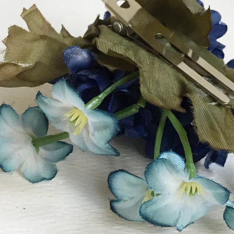 In good preowned condition. The hair clip with the cluster of blue flowers has a stem with a split in it.