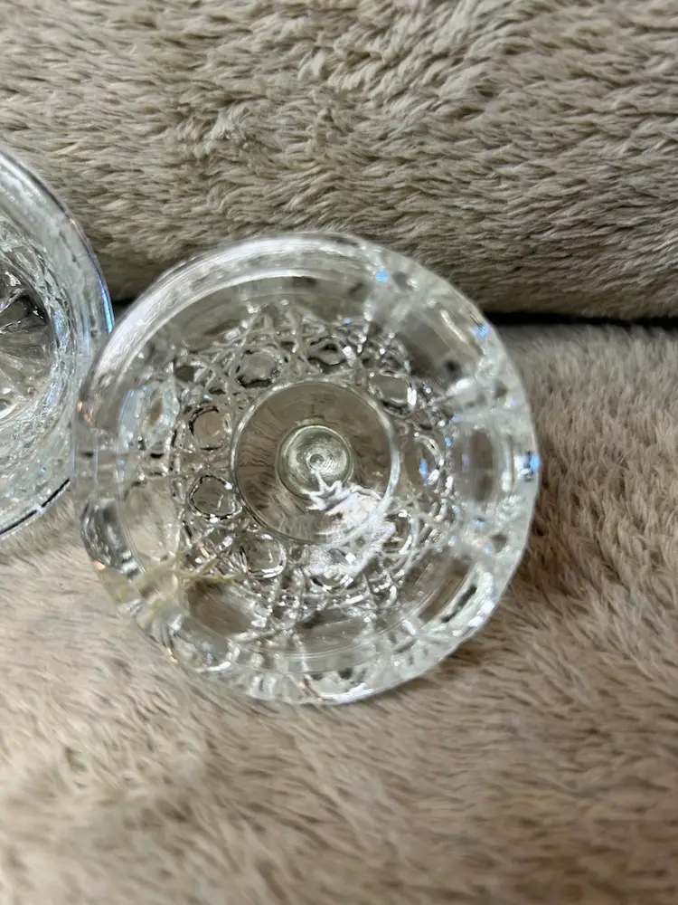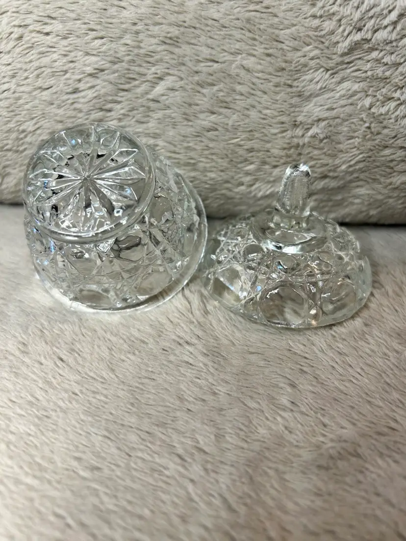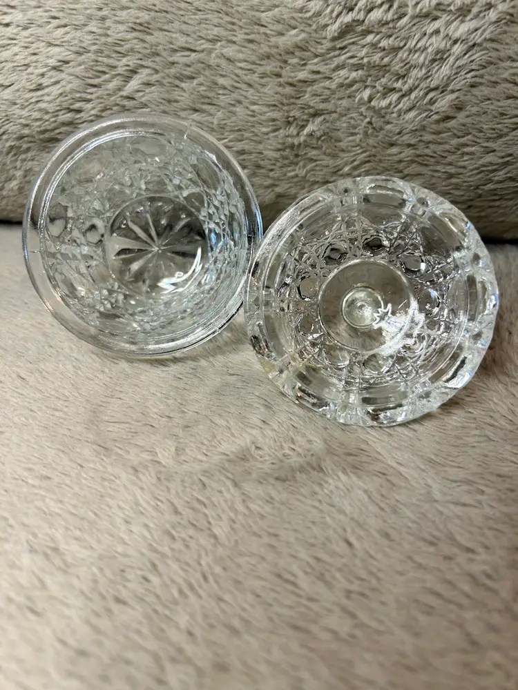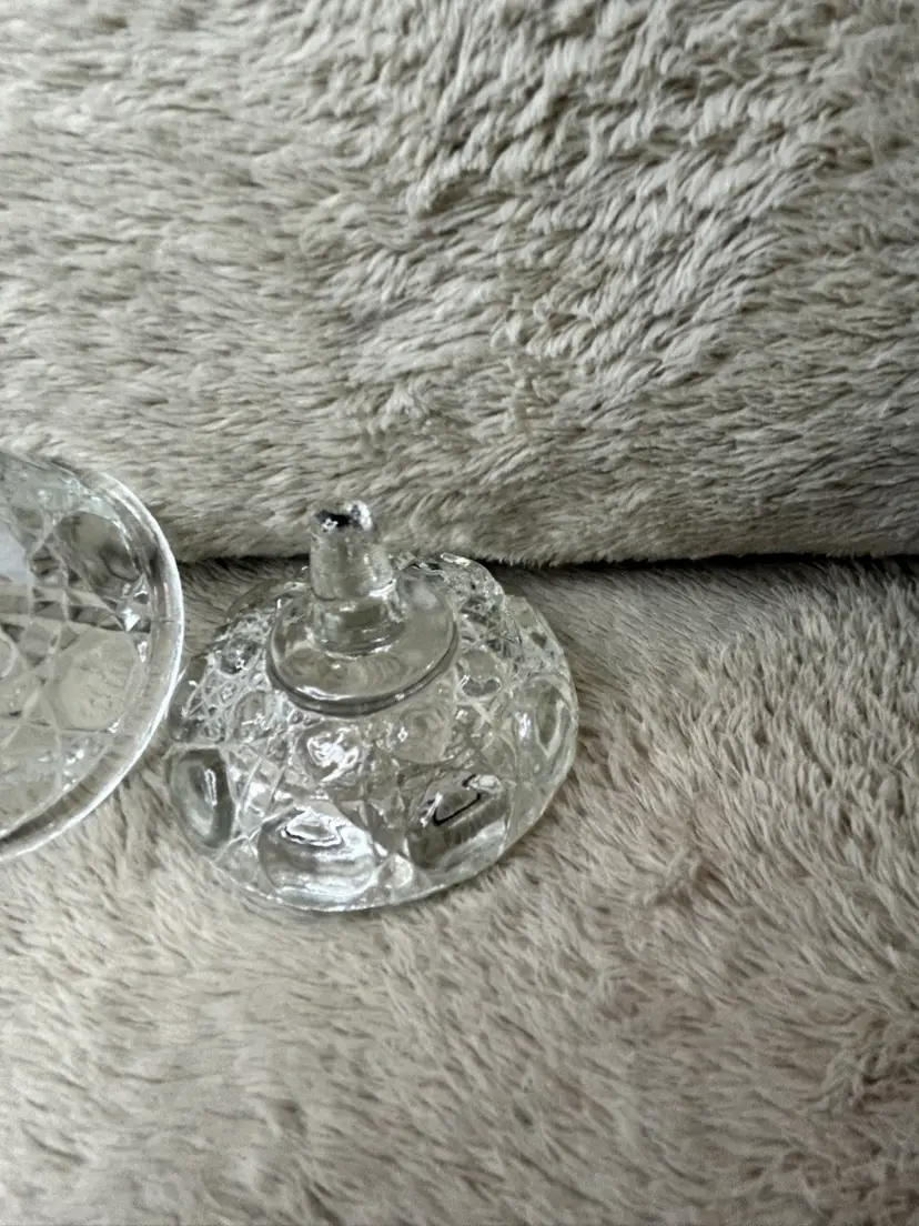 This is a vintage apple-shaped trinket box, made of pressed glass.