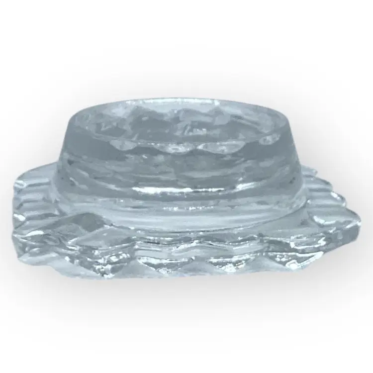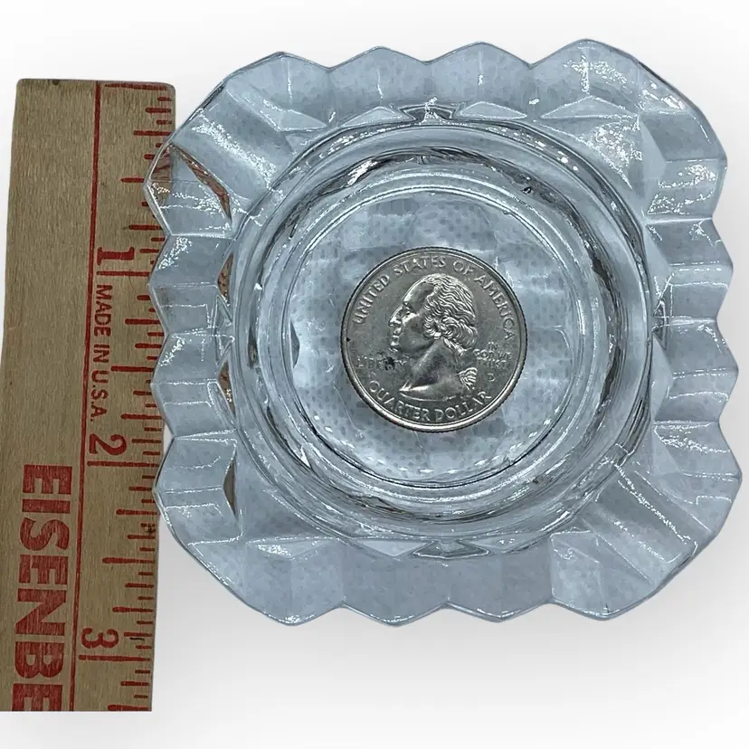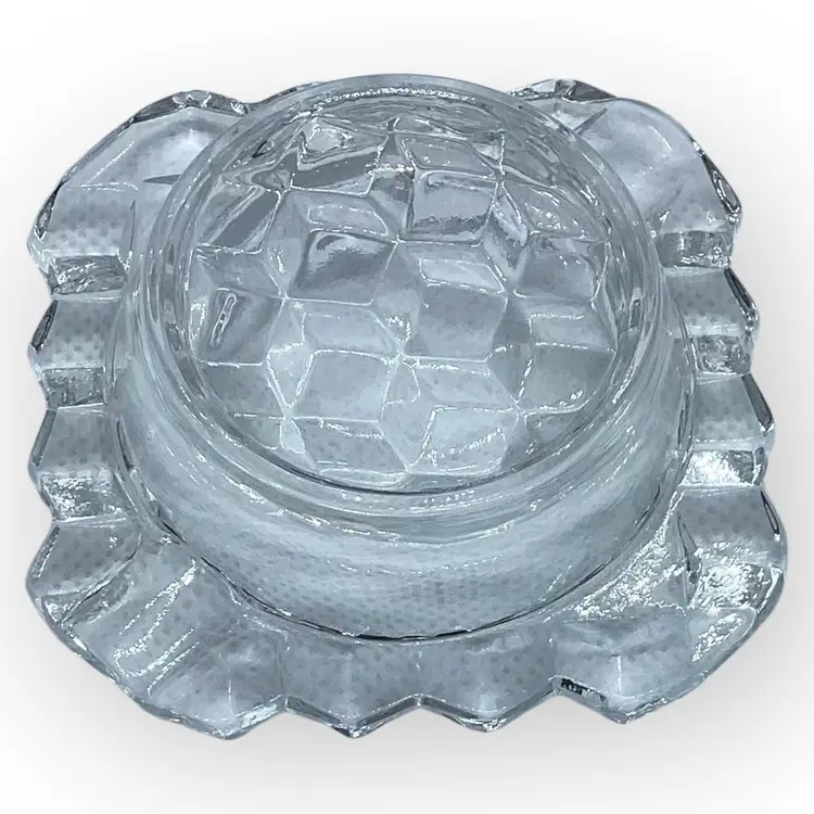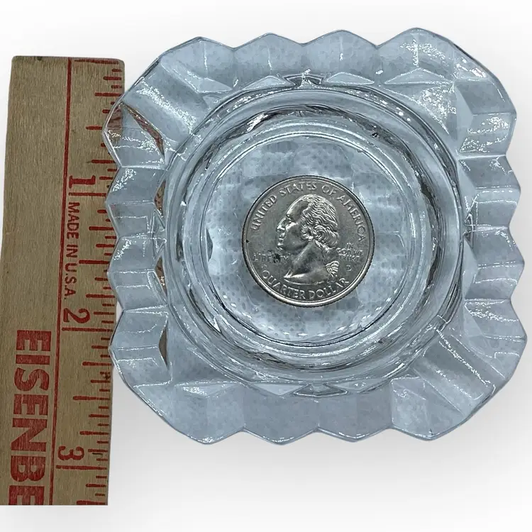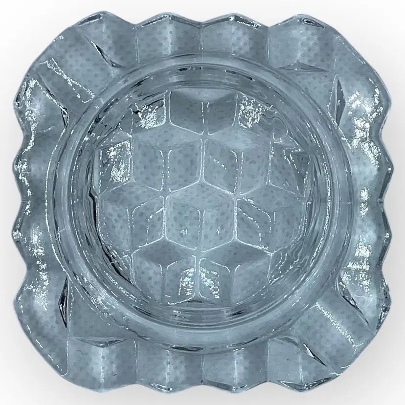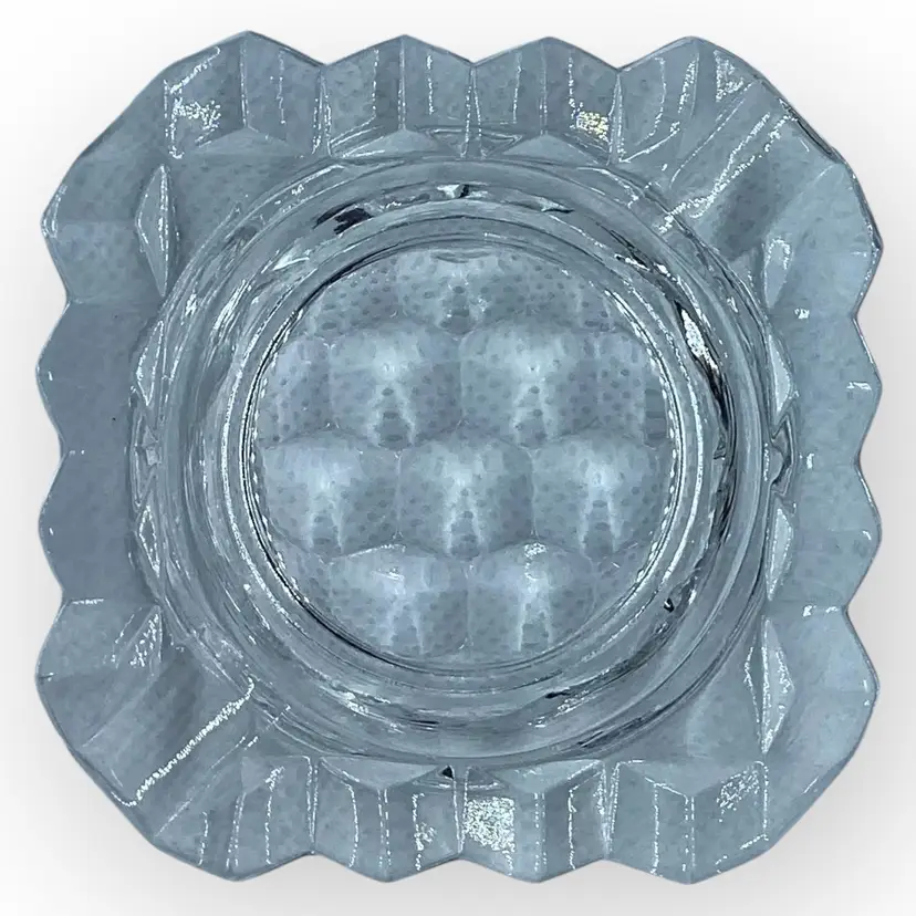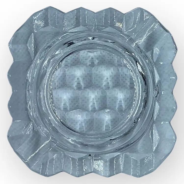The Fostoria Glass Company was in business for 99 years, from 1887 until 1986, when they sold the company and closed their last plant. This individual’s ashtray is from the American collection and likely from the 1960s. Pressed glass in a cubed pattern, the ashtray measures 2-7/8” square and is in mint vintage condition with no chips, cracks or repairs.