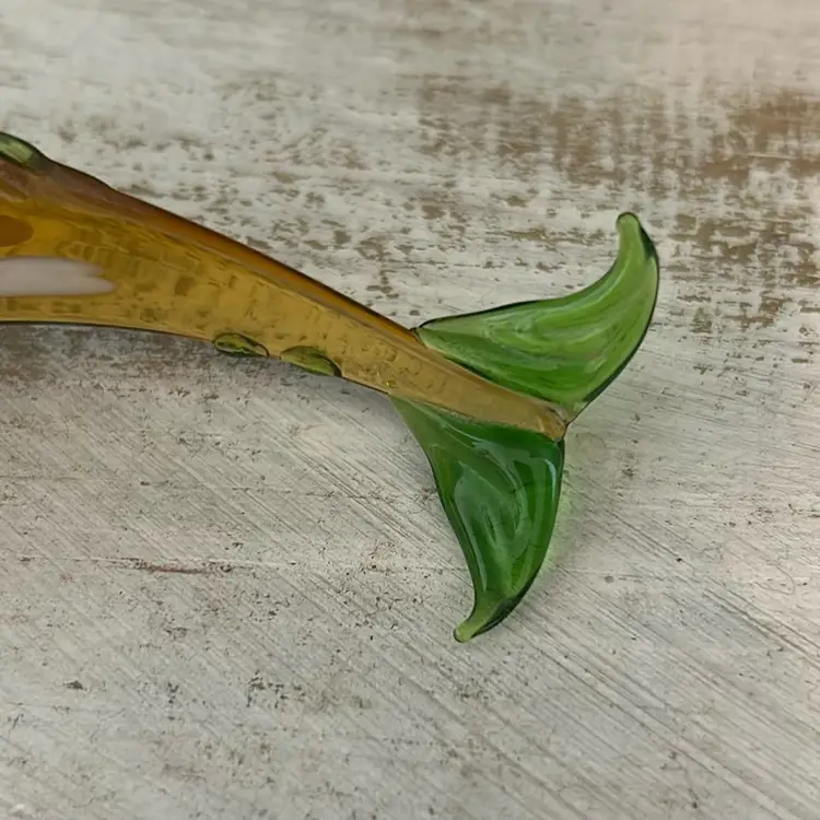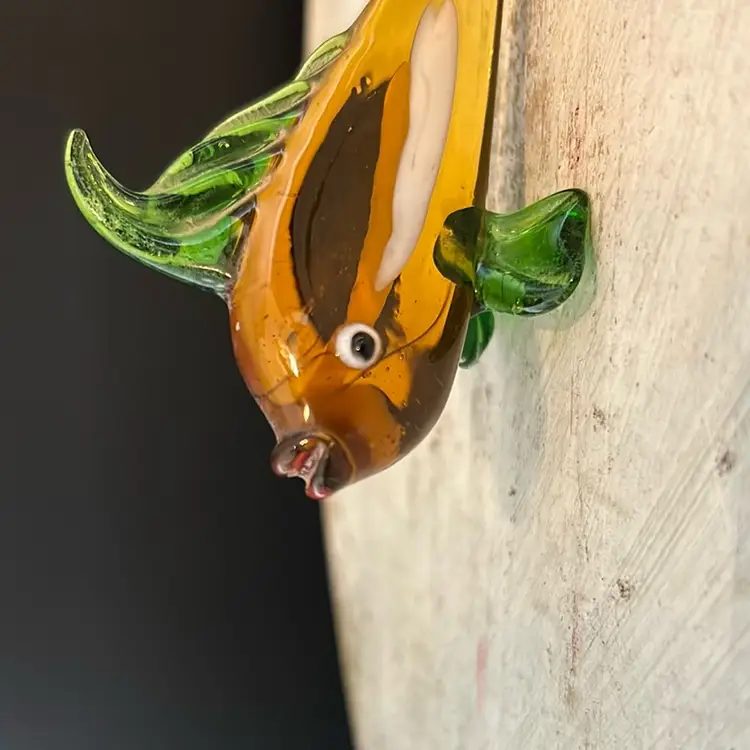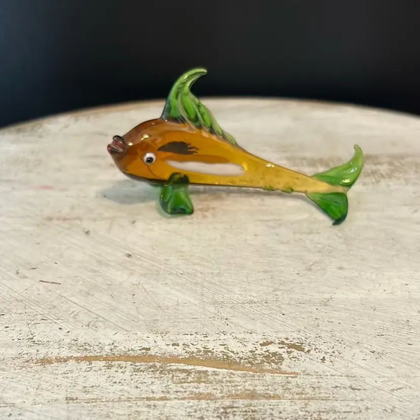 A fun little fish to add to anybody’s nautical collection or fish collection, pops of green and yellow height 2 1/2 inches tall by 3 1/2 inches wide from nose to tail
