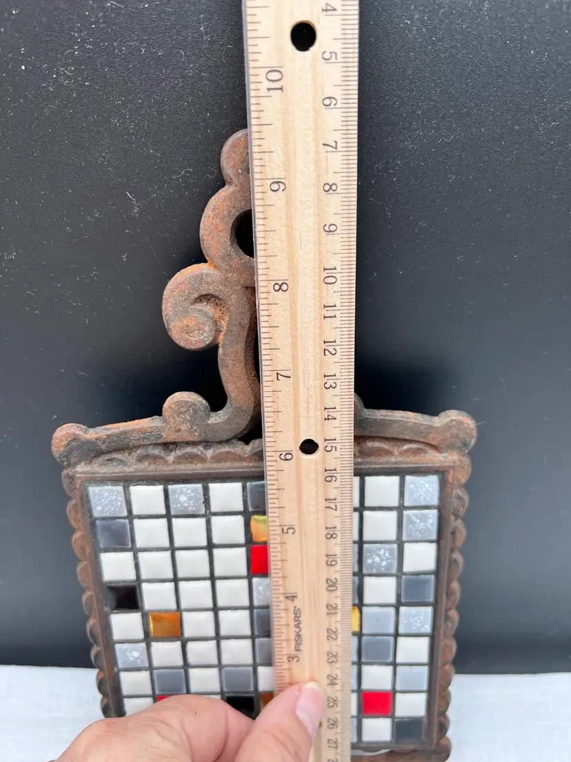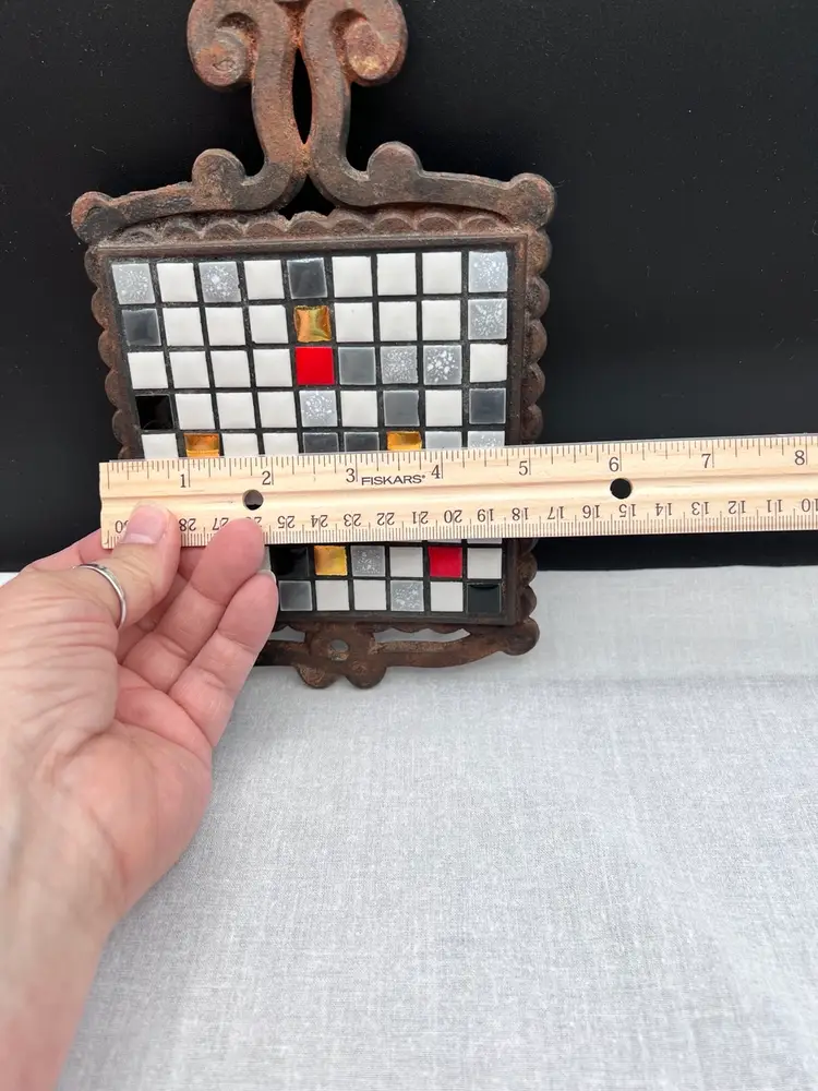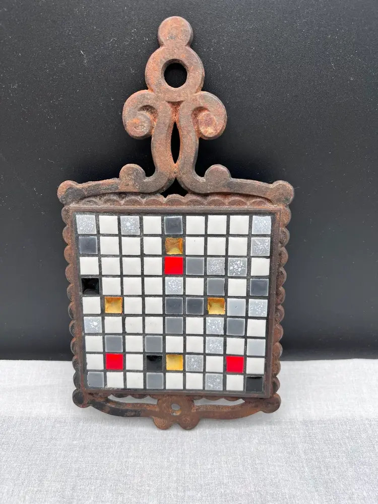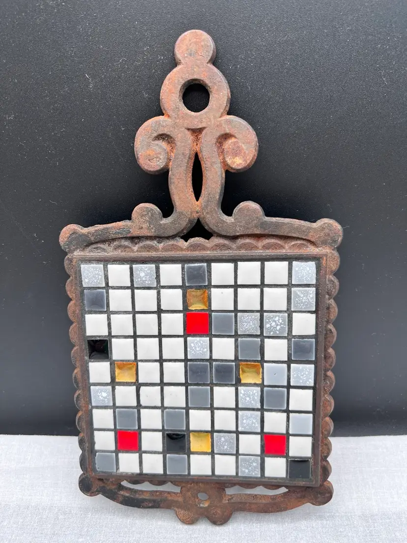 Vintage ceramic tile trivet that looks like a mosaic made with mini tiles mounted in a cast iron base.