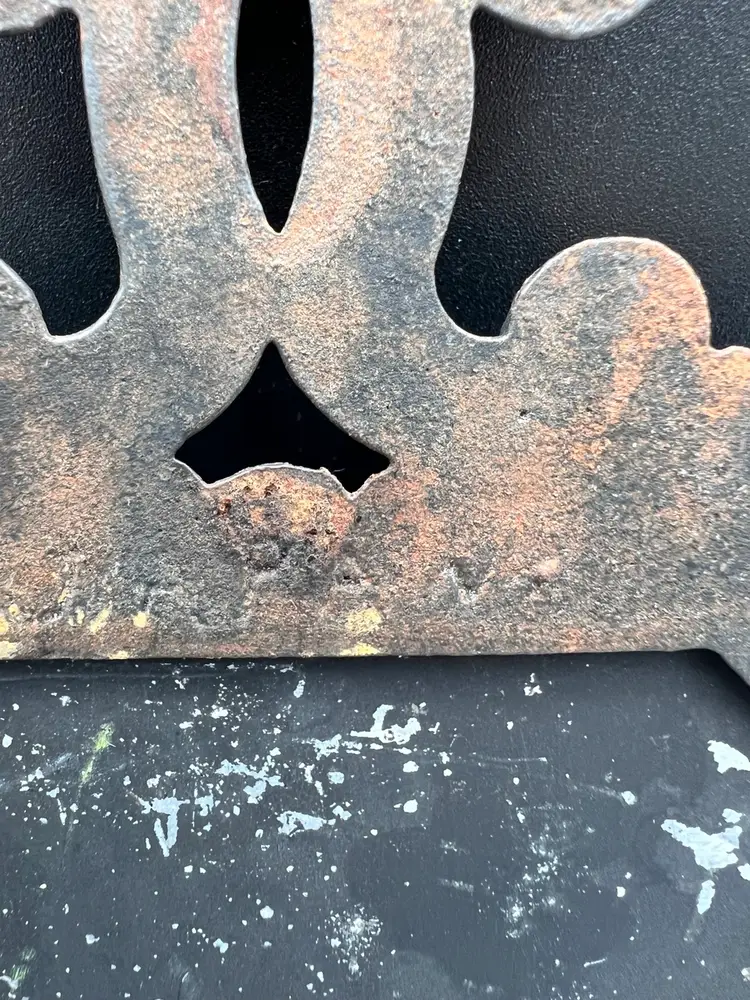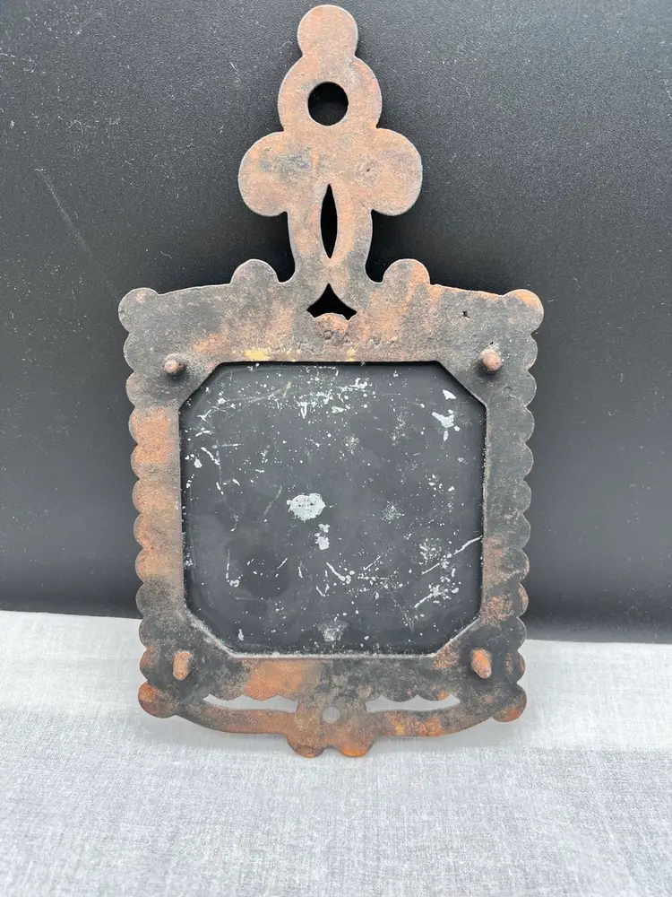 The metal is aged and rusty - would look great in a cabin. Tile mosaic is in good condition and the colors are neutral