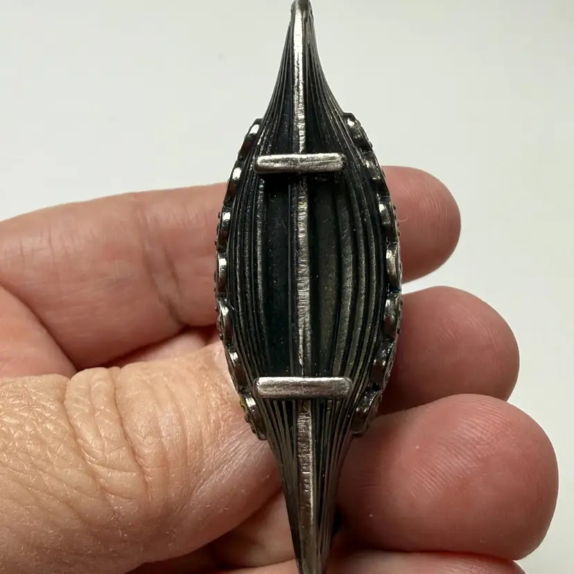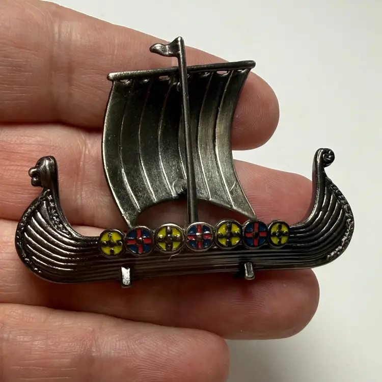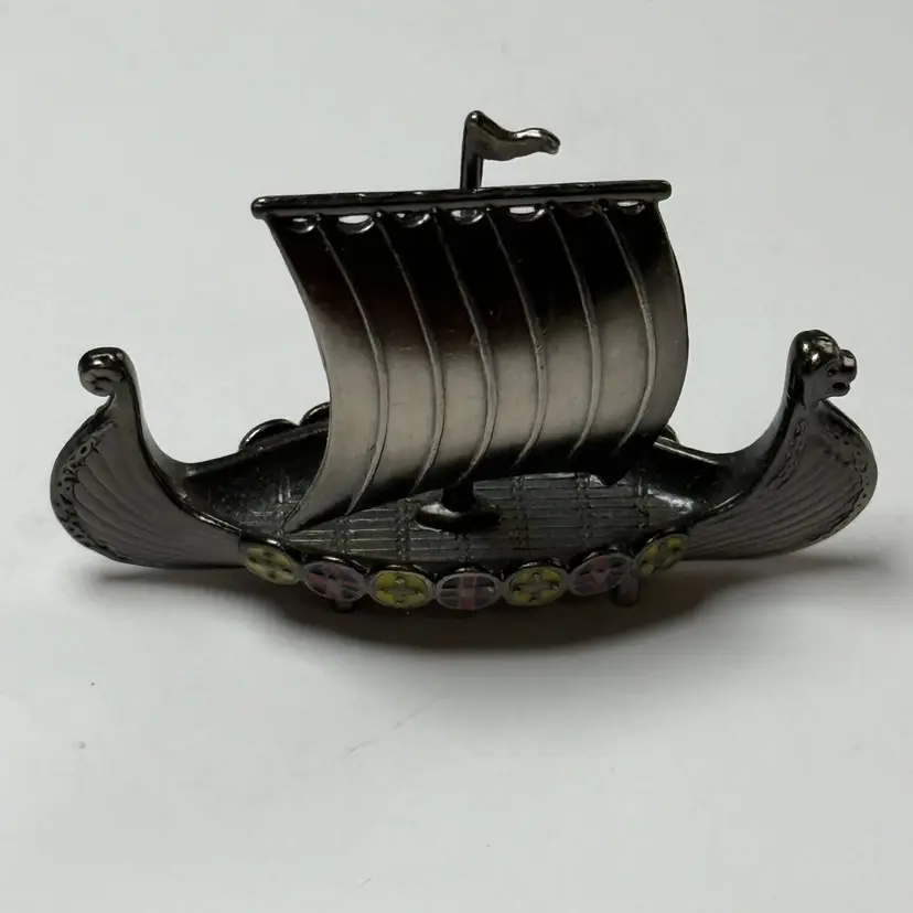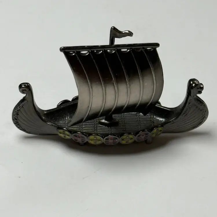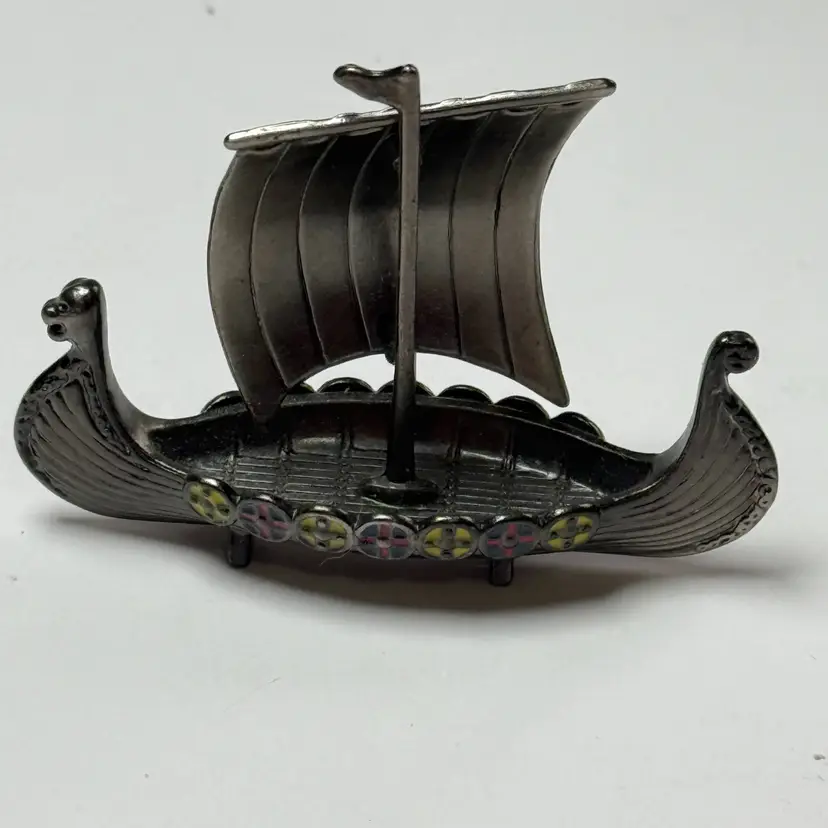 Vintage Mini Pewter Viking Ship Enamel Inlays Metal Ship Boat Scandinavian Decor. Great condition. No issues. 2.25" long x 1.75" tall. Unmarked.