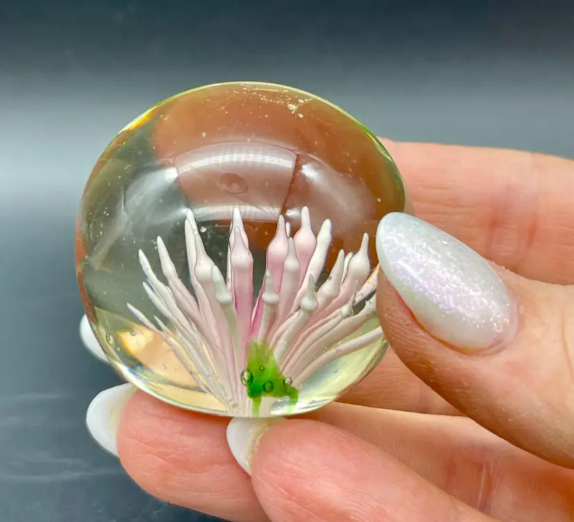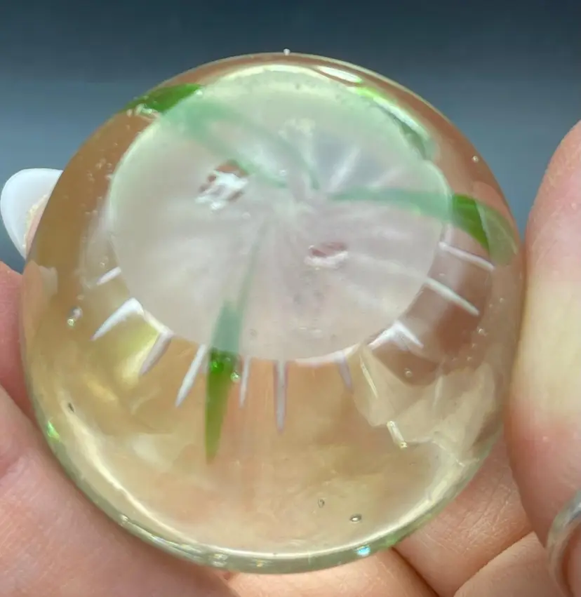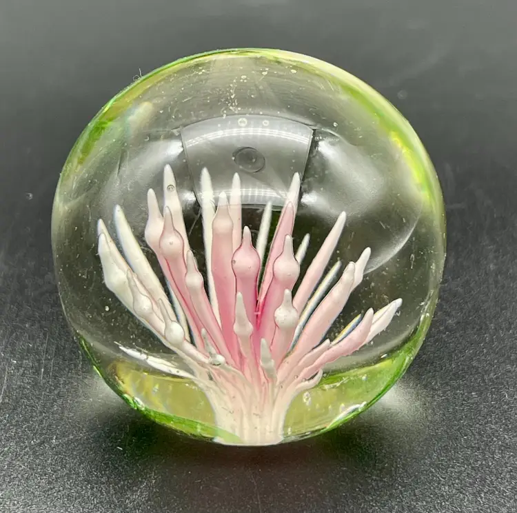 Clear glass with green & pink flower. Unpolished base. Excellent pre-owned condition. No chips, cracks or blemishes. No signatures or markings. Dimensions: 2" Diameter.