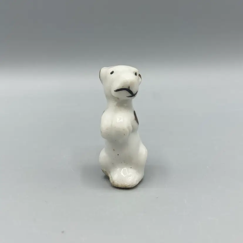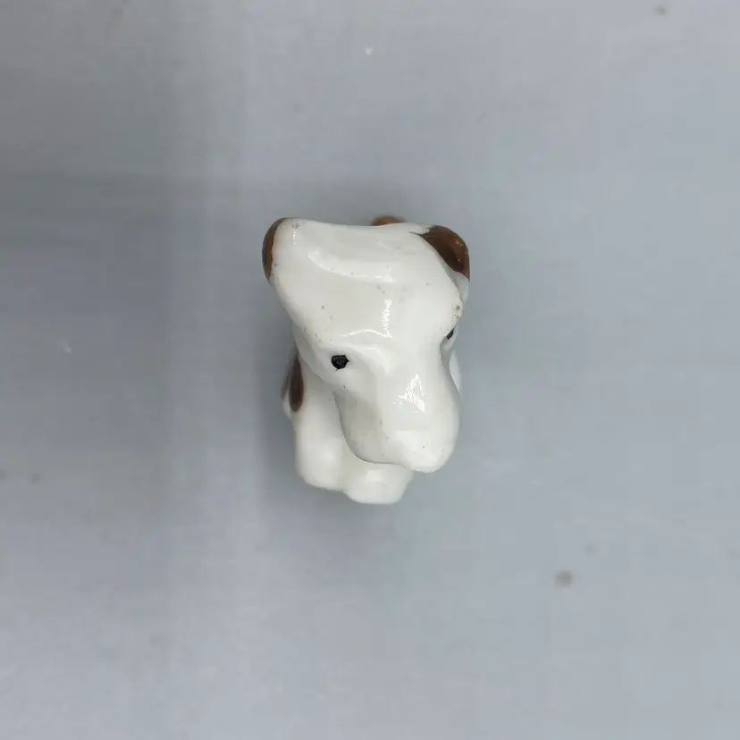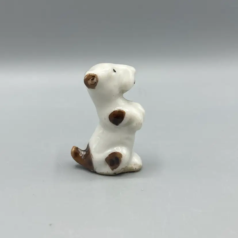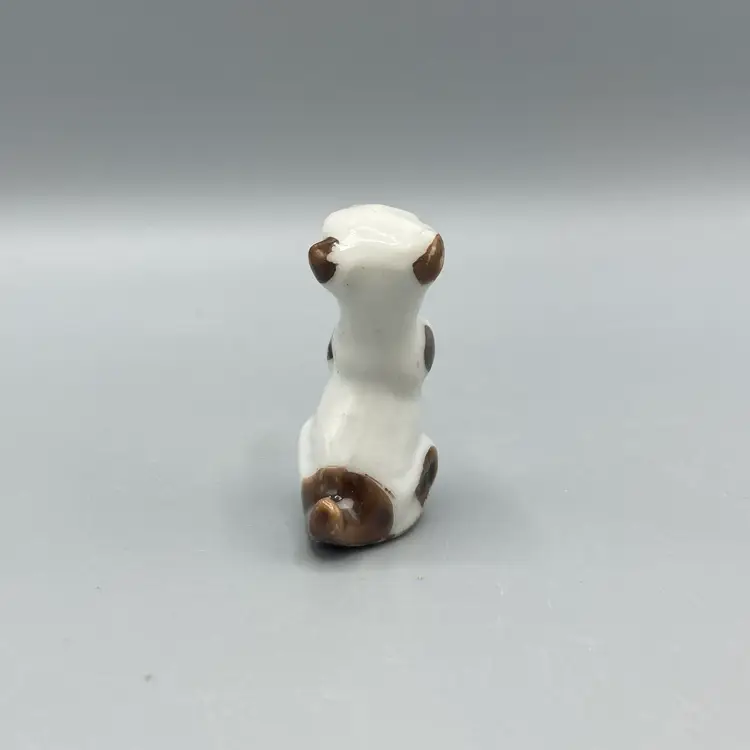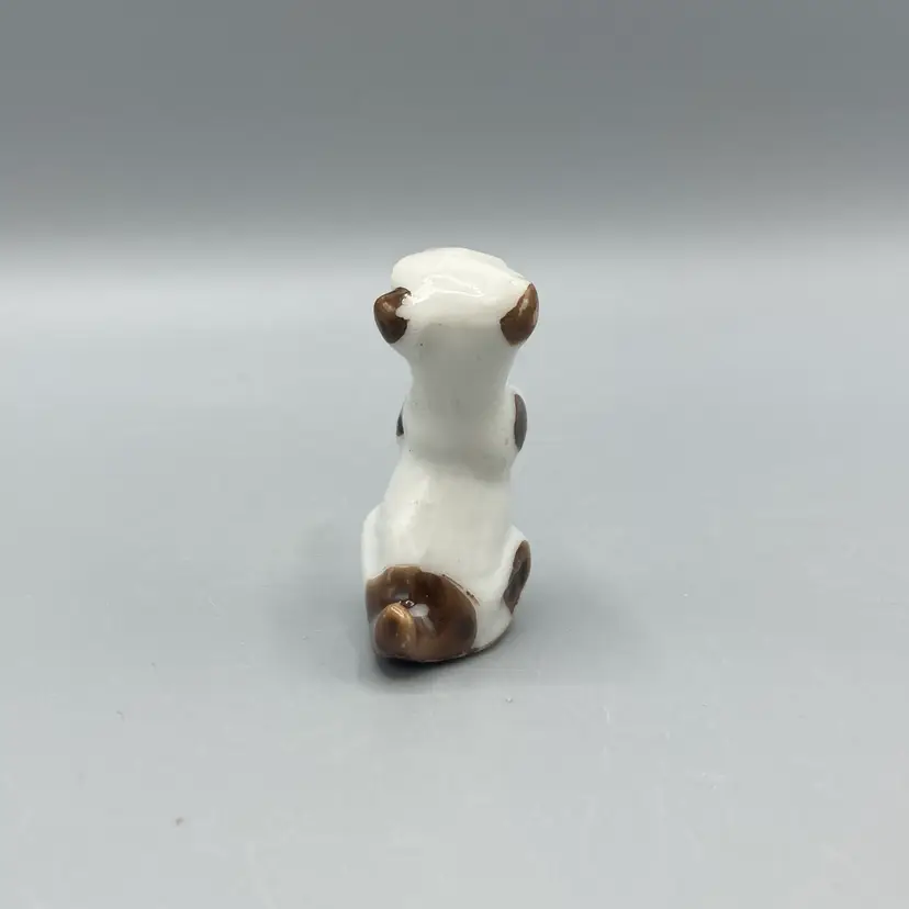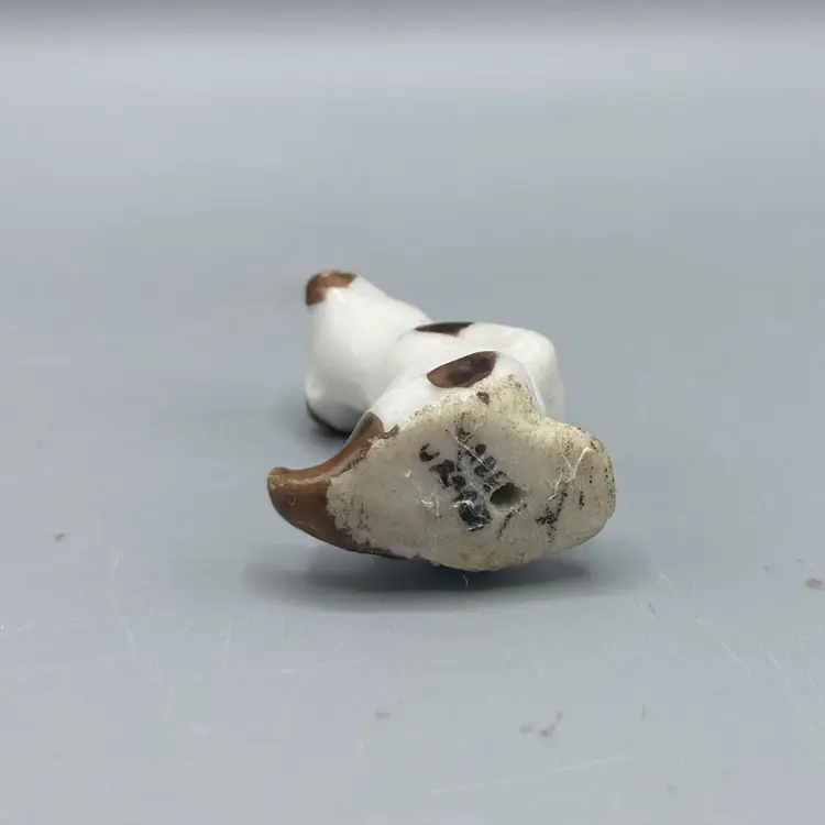 This dog is in good condition. There is a manufacturing issue at the base of the dog where the glaze didn't cover under the leg on the side with the spot. He measures approximately 1 1/2" tall x 1" x 3/4".