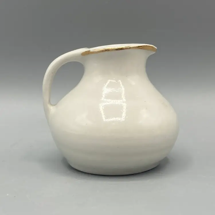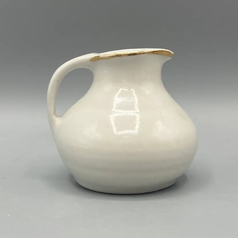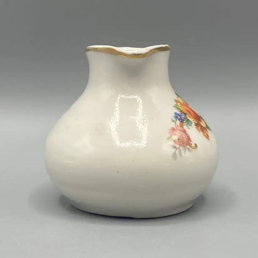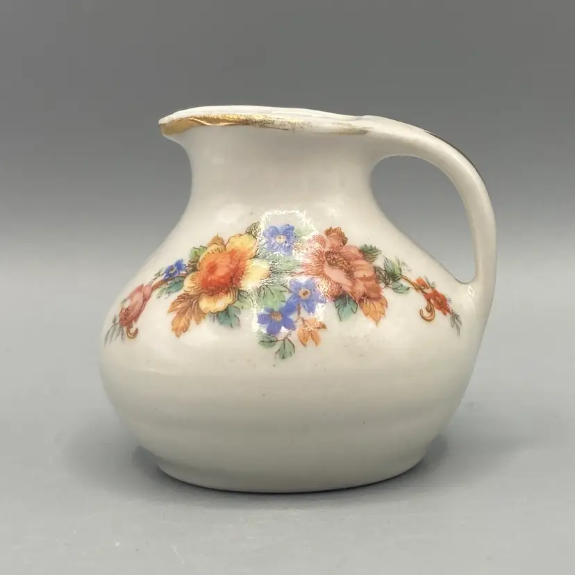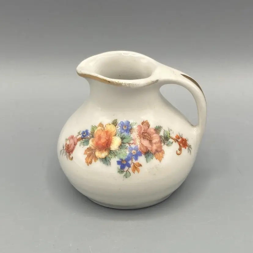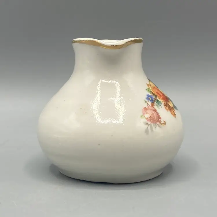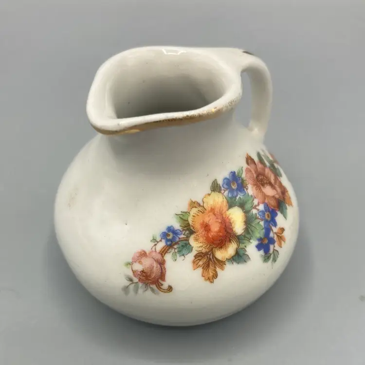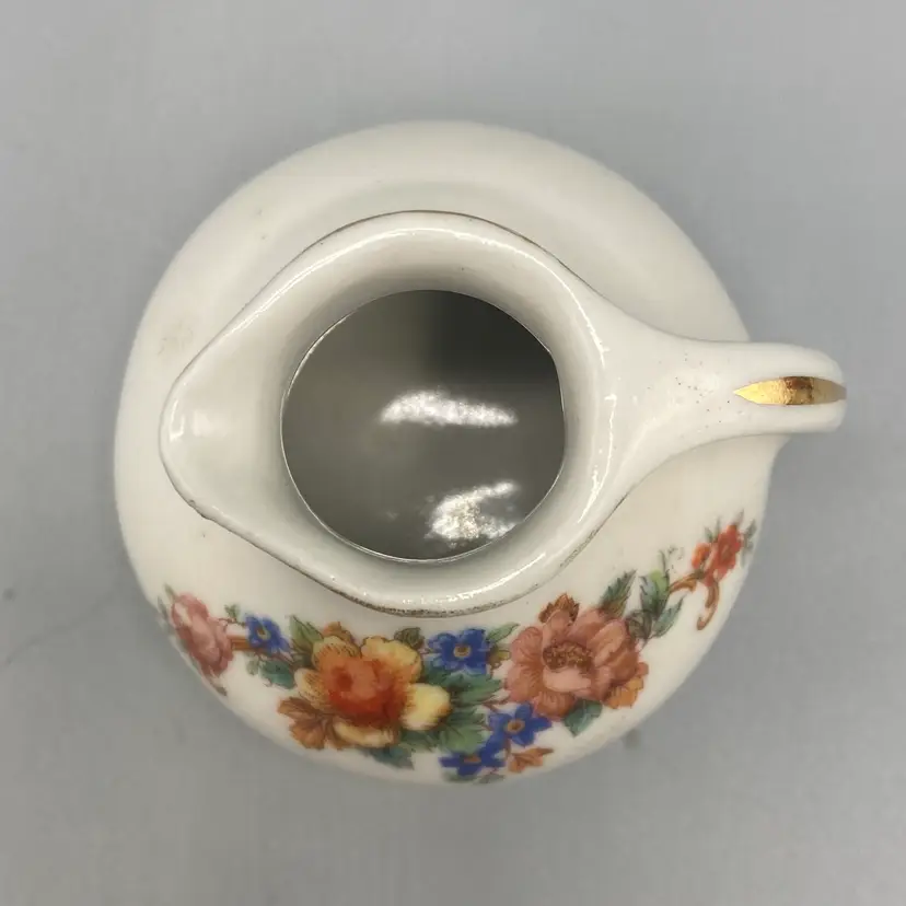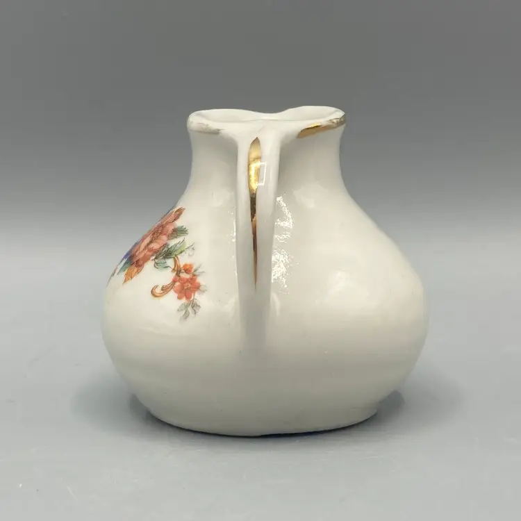 This pitcher is in good overall condition, there is some wear to the gold trim and flowers. It measures approximately 2" tall x 2 1/4" across.