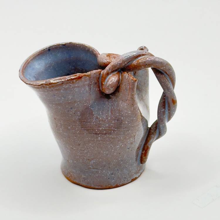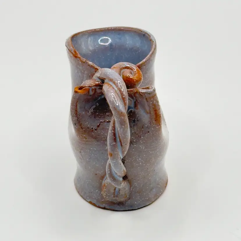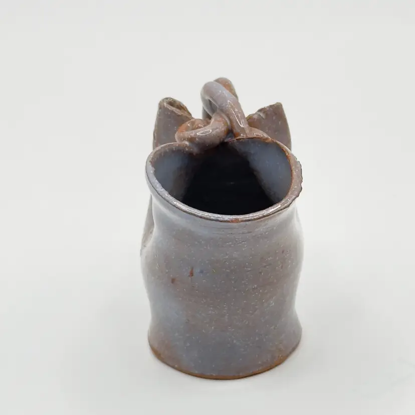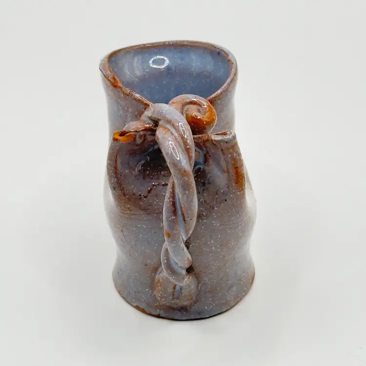 Add a touch of rustic charm to your collection with this miniature handmade pottery fluted pitcher. Featuring a unique twisted handle and earthy tones, it's perfect for enjoying your favorite beverage. This artisan piece is in excellent condition and makes a great gift for pottery enthusiasts. Measures 2.25x2x1.25 inches. Weighs 4oz.
