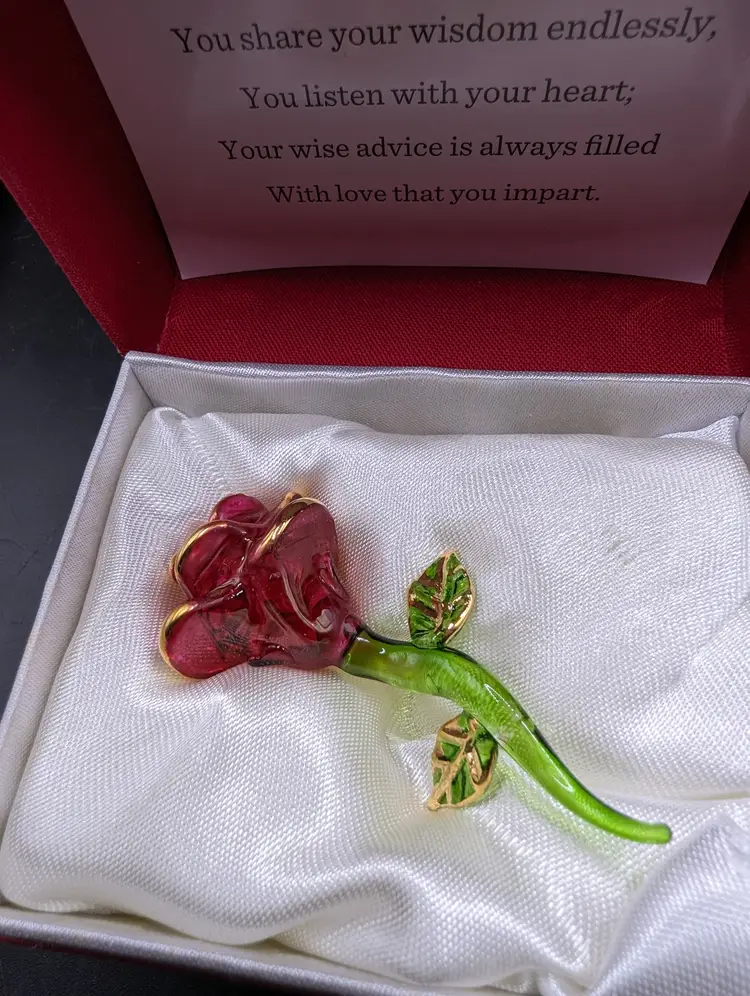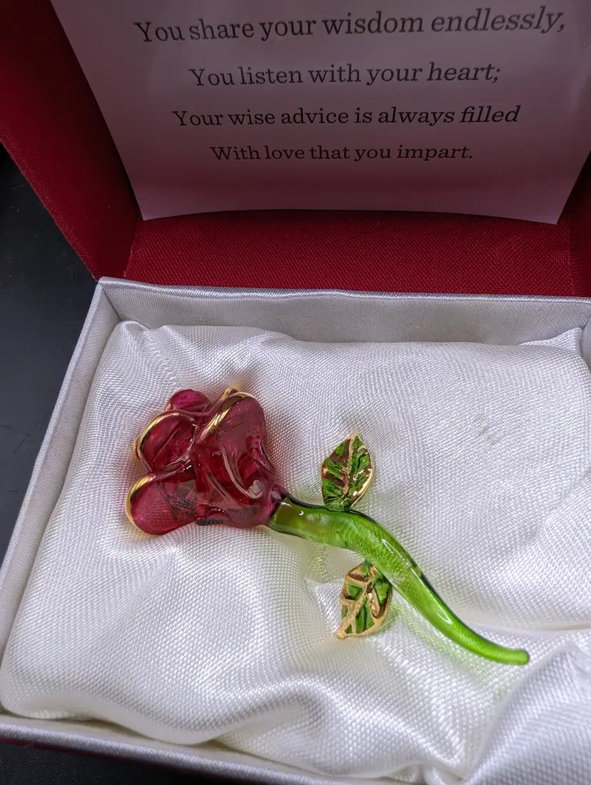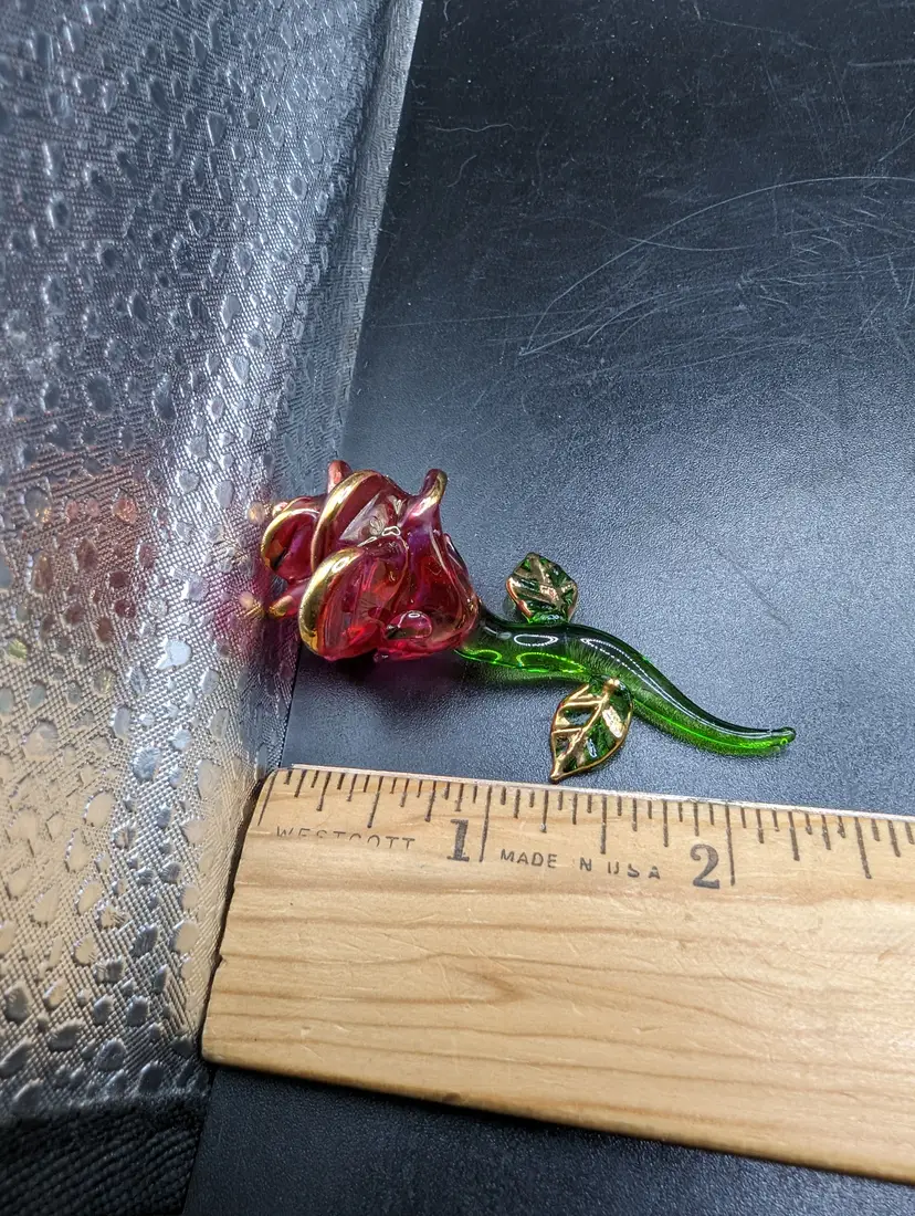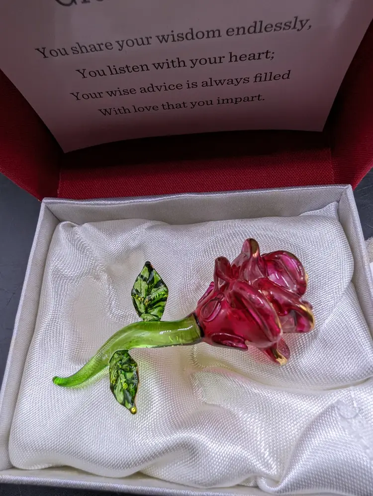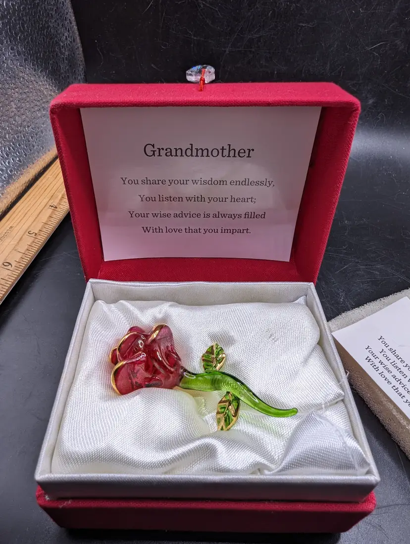 This is a lovely Vintage Miniature Glass Little Red Rose With Gold Accents in a Red Presentation Box Grandmother. No chips or cracks. Please see all pictures for condition and measurements.
