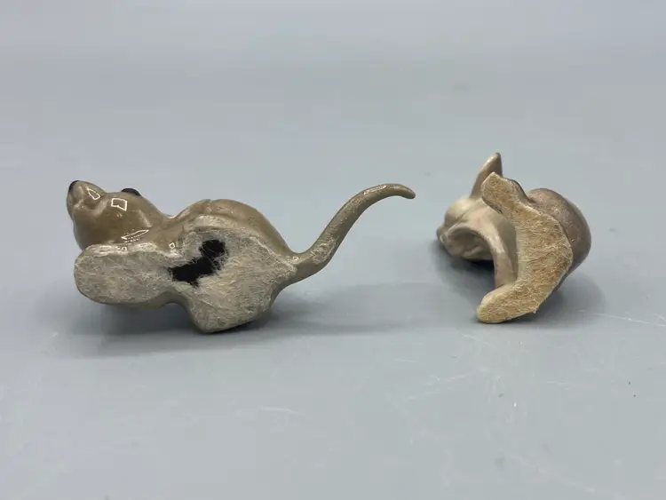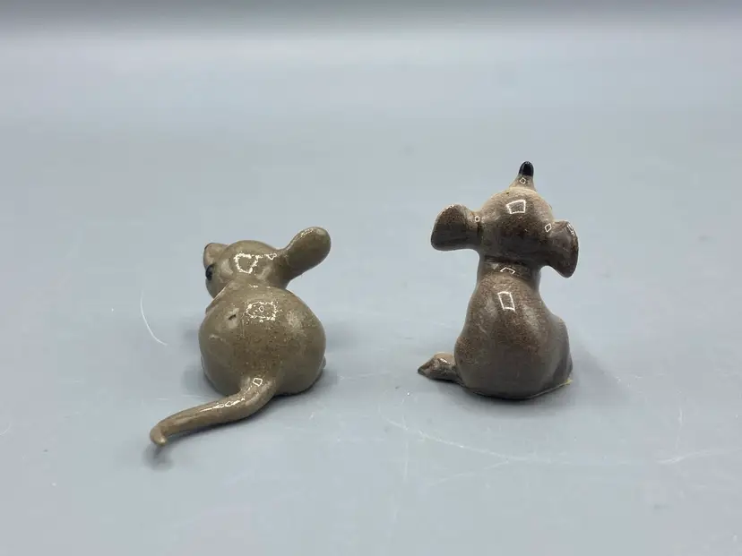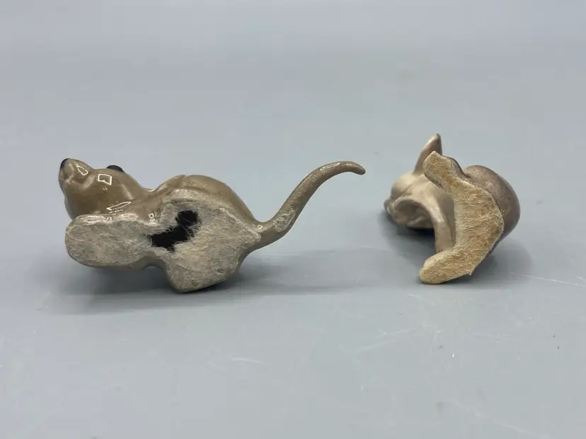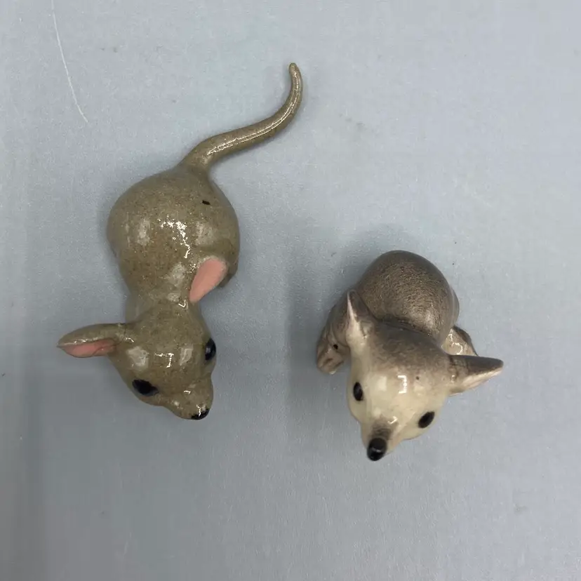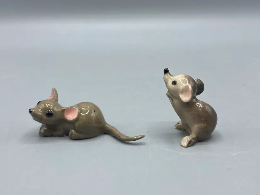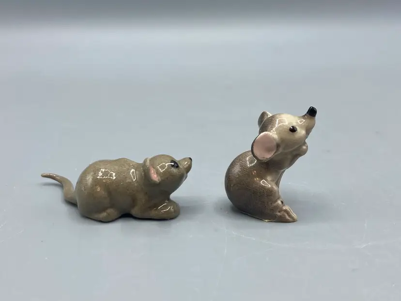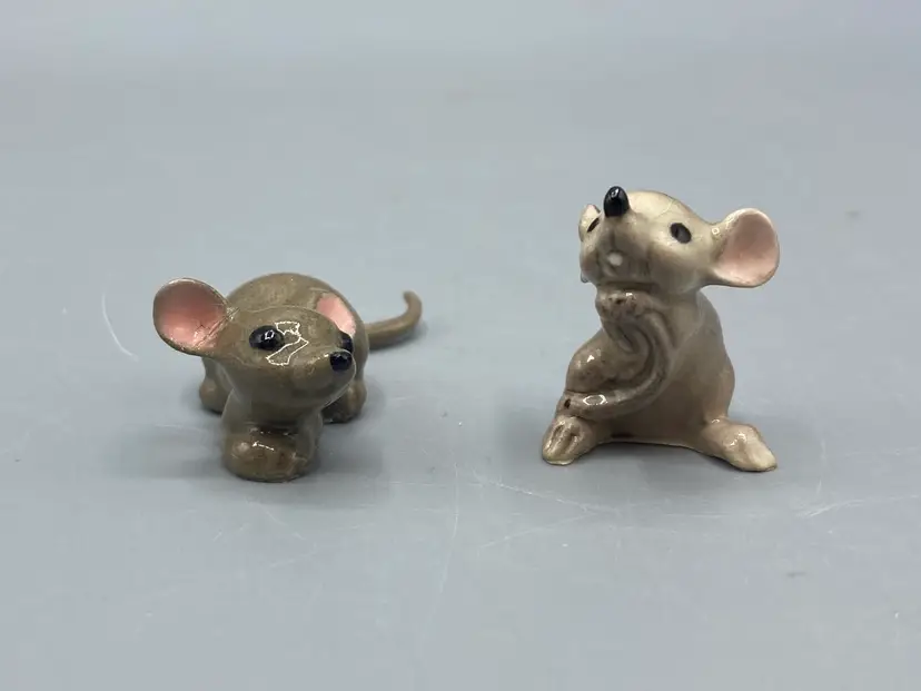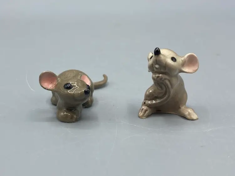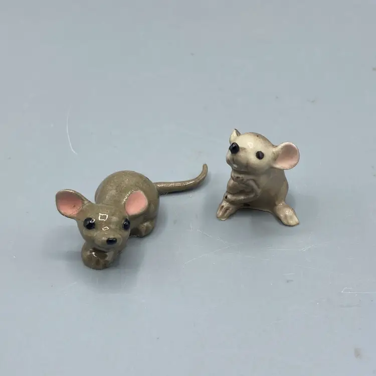 These mice are in good condition. The sitting mouse measures approximately 1" tall. And the lying down mouse measures approximately 3/4" tall.