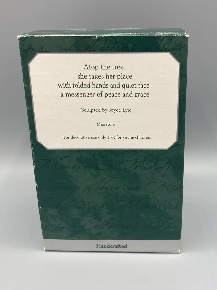 This tree topper is in good condition. It measures approximately 3" tall x 2 3/4" across wing to wing and a 1" opening.