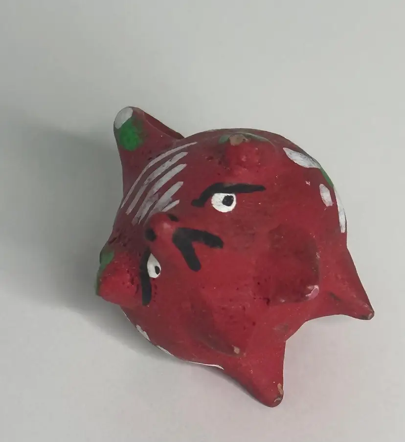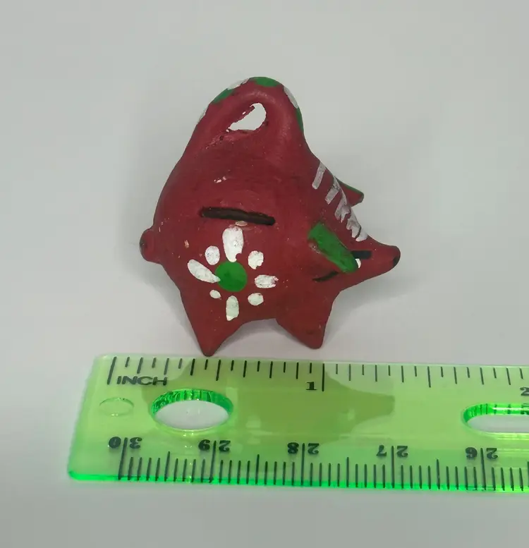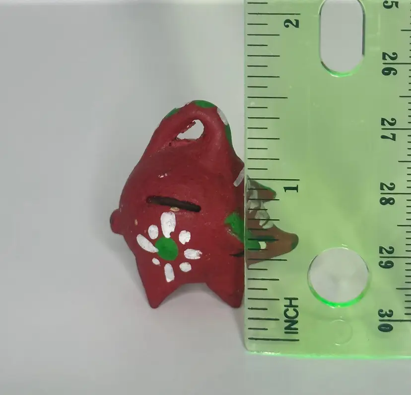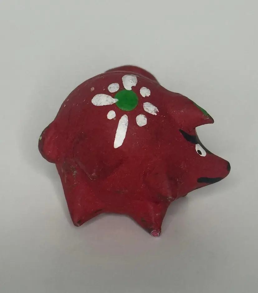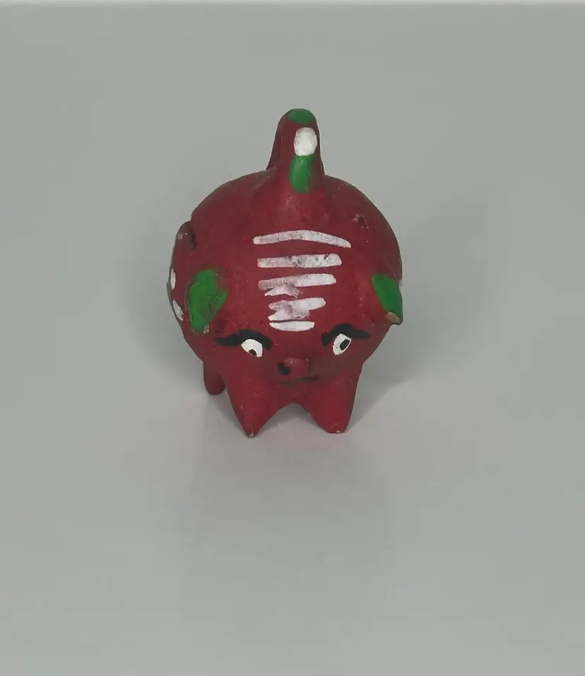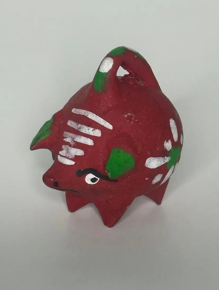Add a touch of whimsy to your collection with this charming handmade folk art pig figurine. Featuring a vibrant red color with white and green floral accents, it's perfect for adding a playful character to your space. Display it on a shelf or desk to bring a bit of rustic charm to your decor. W: .75" H: 1.25" L: 1.25"