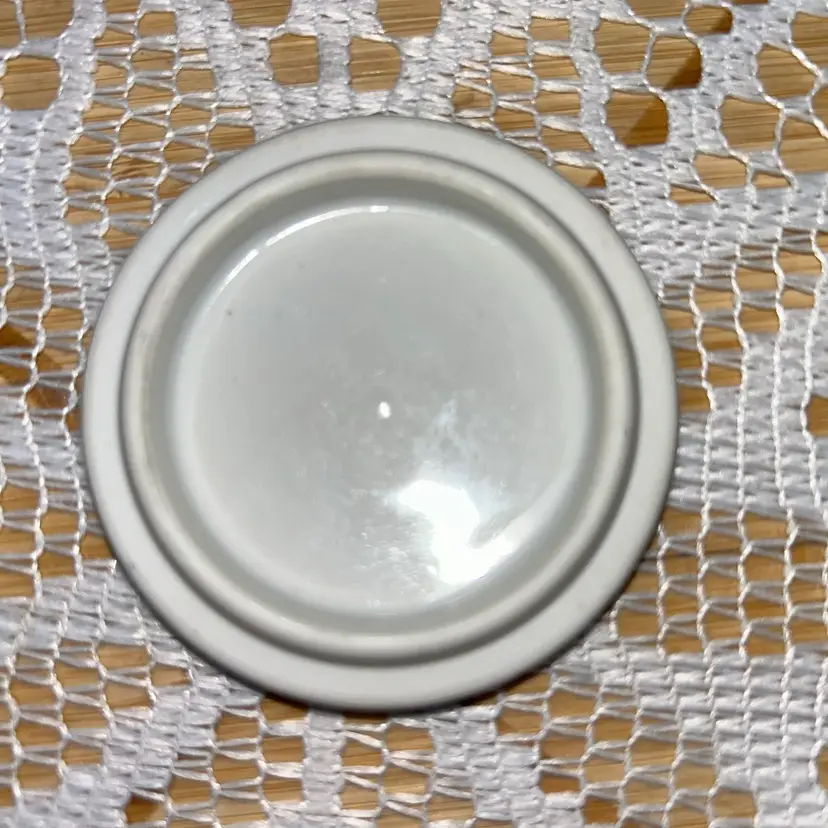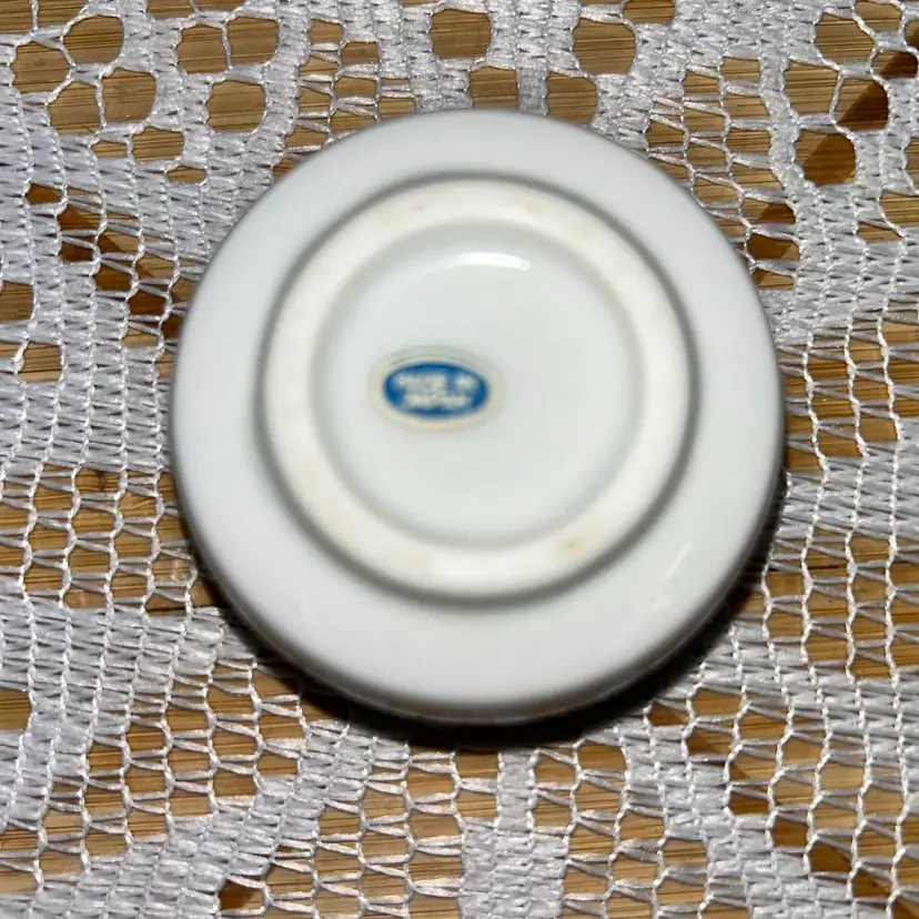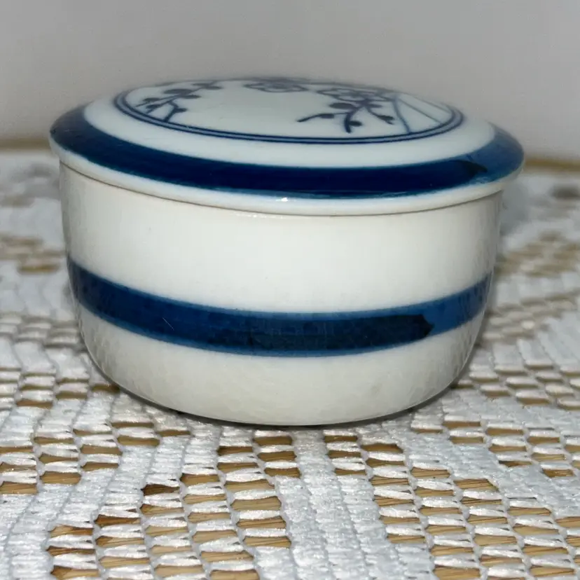 Small porcelain box is 1.5” tall with lid, 2.25” in diameter. The blue and white decoration is a branch from a cherry blossom tree. It is the excellent condition. No issues and a label that says made in Japan.