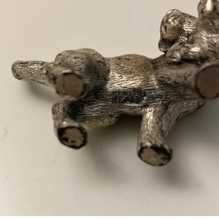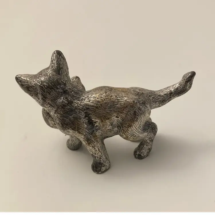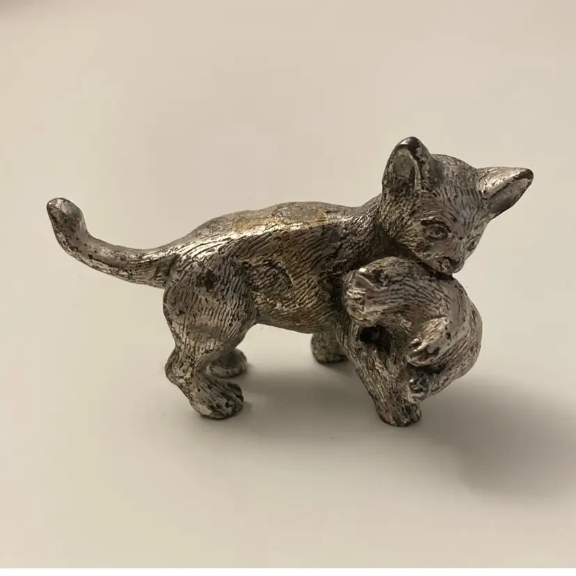 I believe this is a Italian Peltro, but not positive, mama cat carrying her kitten pewter figurine. This miniature measures 1” x 2 3/4” x 1 5/8” tall. It is quite heavy for the size. It is slightly magnetic with my rare earth magnet.