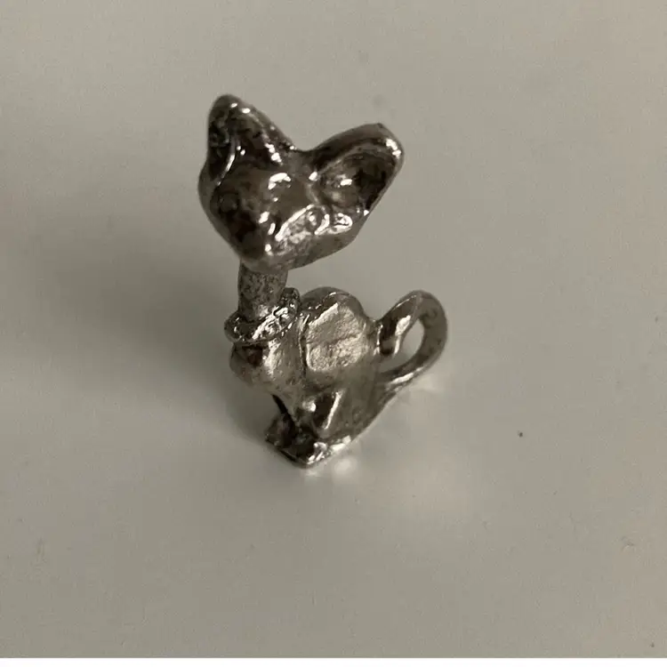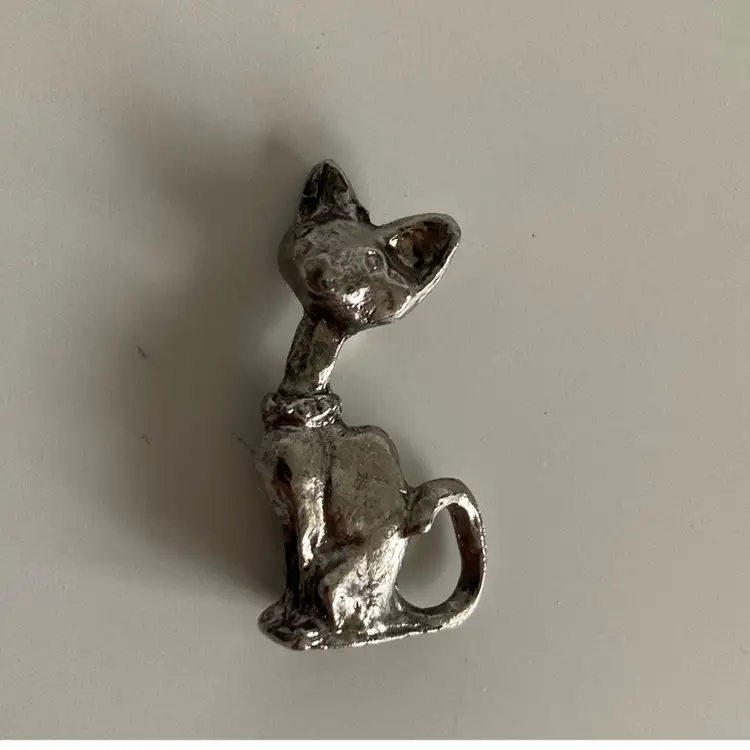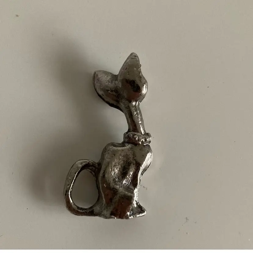 Vintage miniature silver pewter long necked Siamese cat. They measure just kitty measures 3/4” x 3/8” x 1 5/8” tall. No markings.