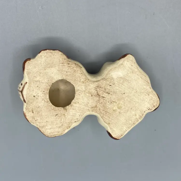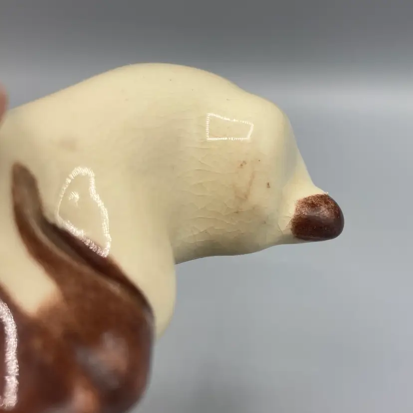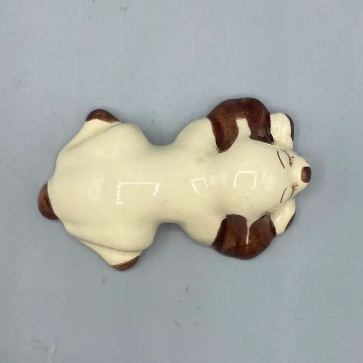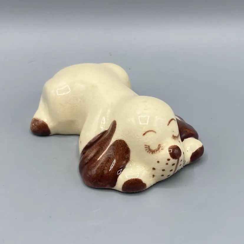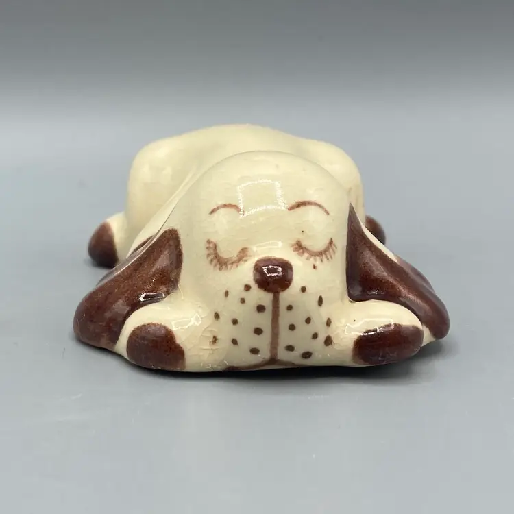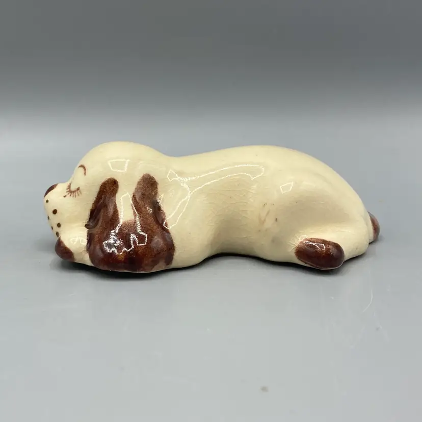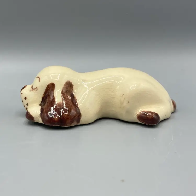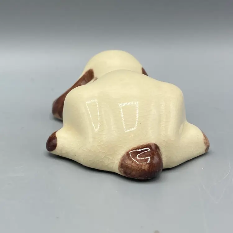 This dog is in good overall condition. There is a small mark on one of the legs and crazing. It measures approximately 3 1/2" long x 2" wide x 1" tall.