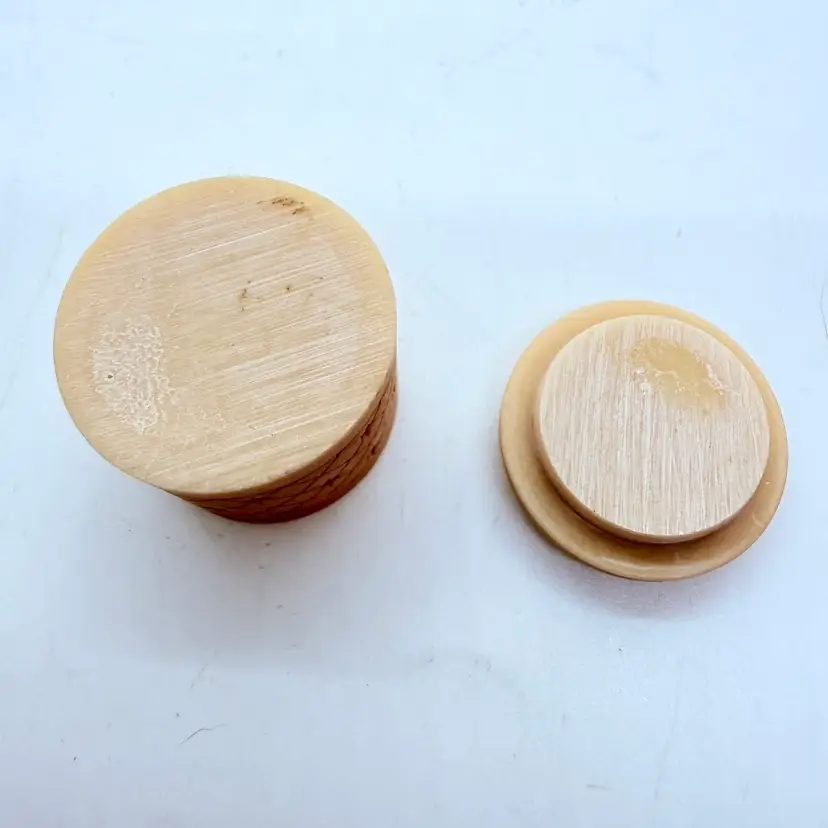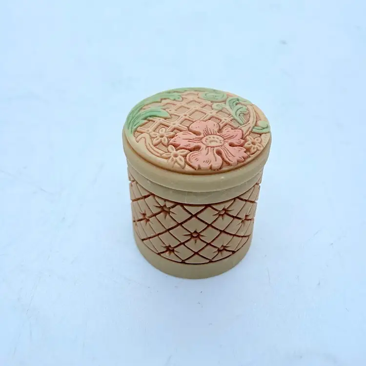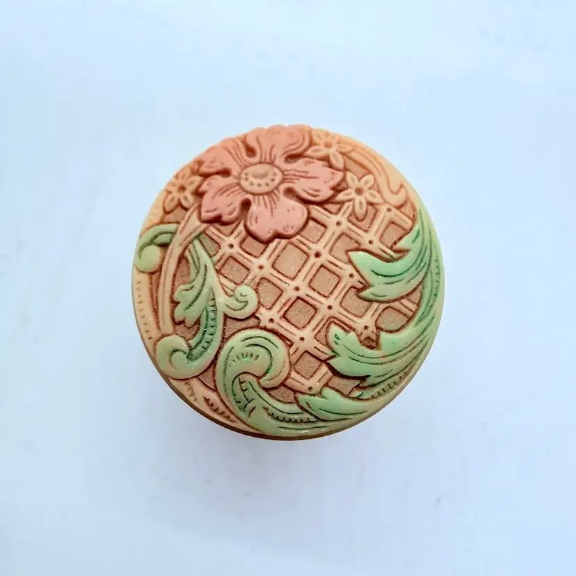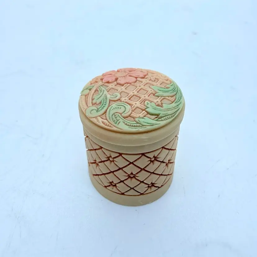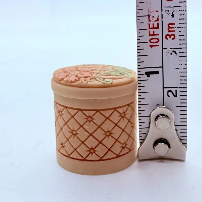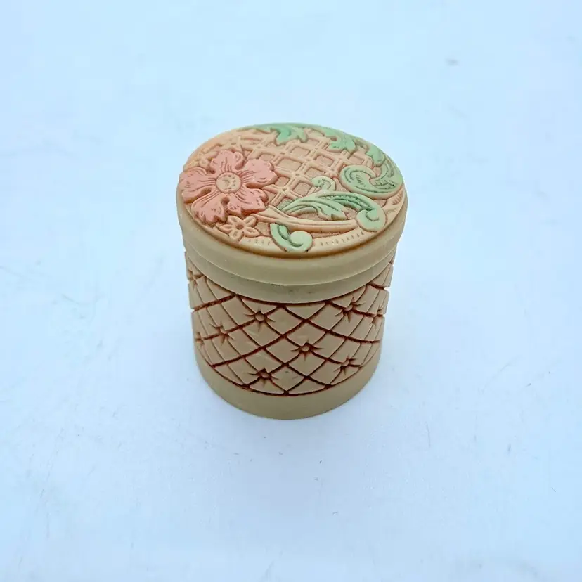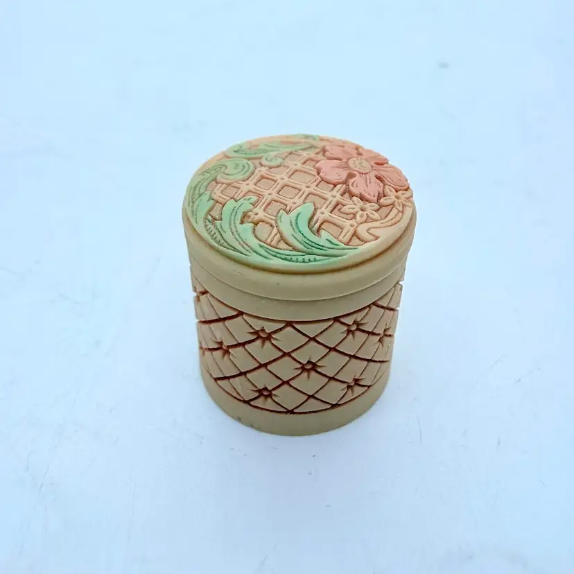 Vintage Miniature Pill/ Trinket Box with Lid. It appears to be an Asian inspired design with a Cherry Blossom flower. Unsure of material, it almost seems like a resin or plastic. Signs of wear and use. Some scuffing and scratching. Please see pictures.