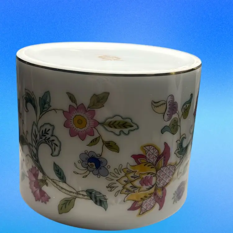 Well known English China pattern. Inspired by the flowers, pictures, murals and tapestries at Haddon Hall Castle- England. Production of pattern started over 60 years ago 1948-2011. No lid Has no damage and measures 3” tall & 3.5” wide