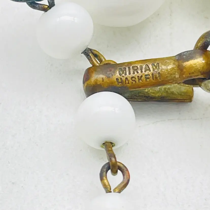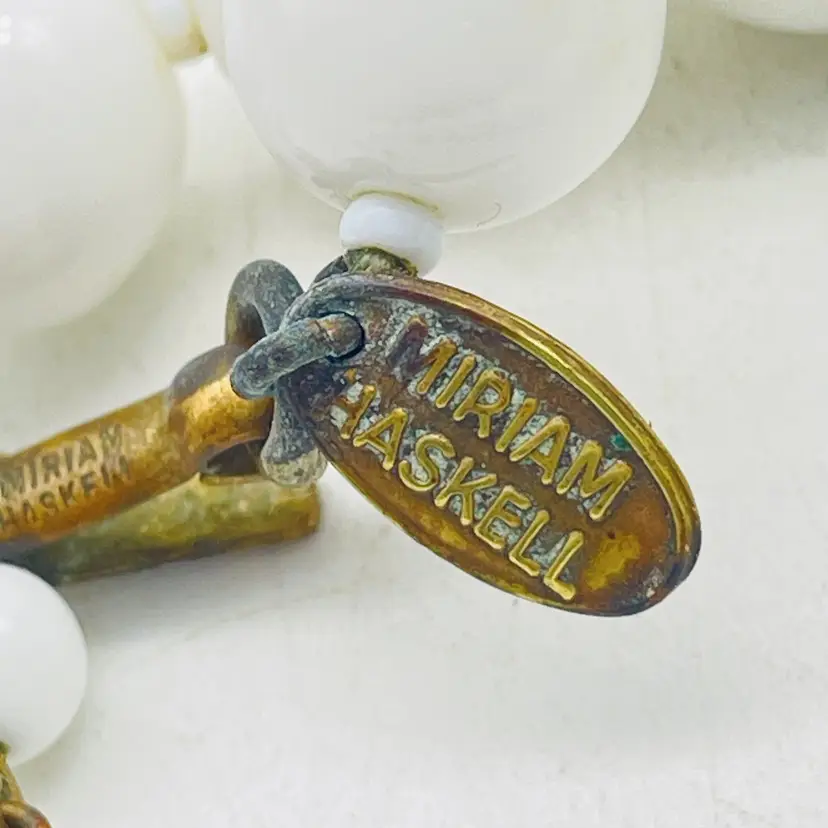 Classic Miriam Haskell necklace featuring white milk glass beads with her signature elegant, hand-assembled construction. Features: Signed Miriam Haskell (hang tag present) White milk glass beads Baroque-inspired bead shapes Gold tone findings with adjustable length Collectible vintage designer jewelry miriam haskell necklace milk glass beads vintage designer jewelry collectible costume jewelry baroque style necklace white statement necklace signed haskell jewelry classic vintage fashion 1940s 1950s style necklace elegant bridal jewelry