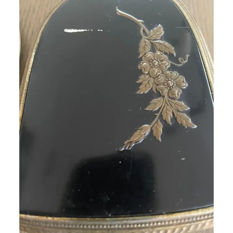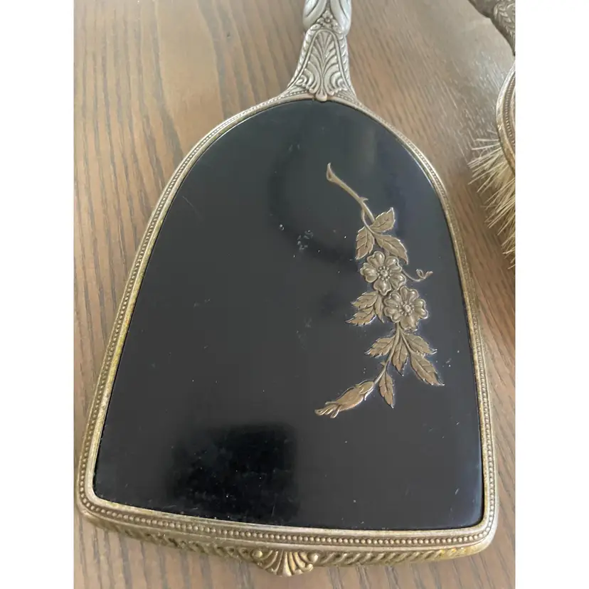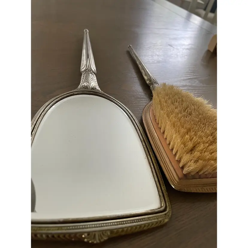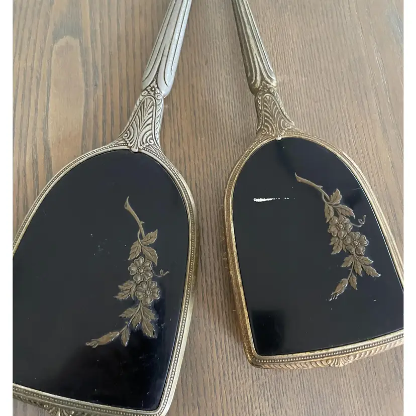 Vintage (possibly Antique) hand mirror and brush vanity set Art Deco design with floral embellishmnts. Materials appear to be metal (possibly silver or brass) Mirror 14" overall, Brush 11". One small scratch on brush. Bristles are probably horsehair. Beautiful Handles are intracately detailed.