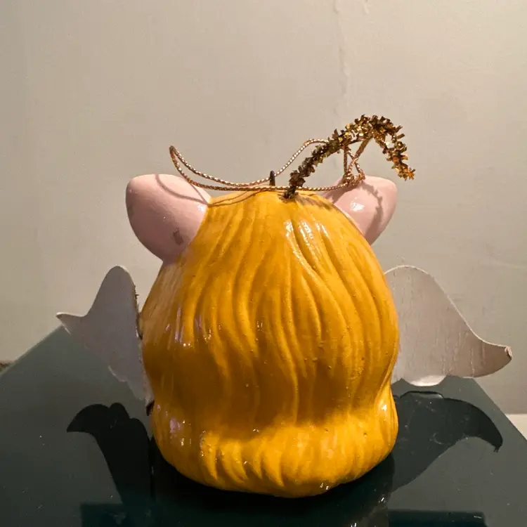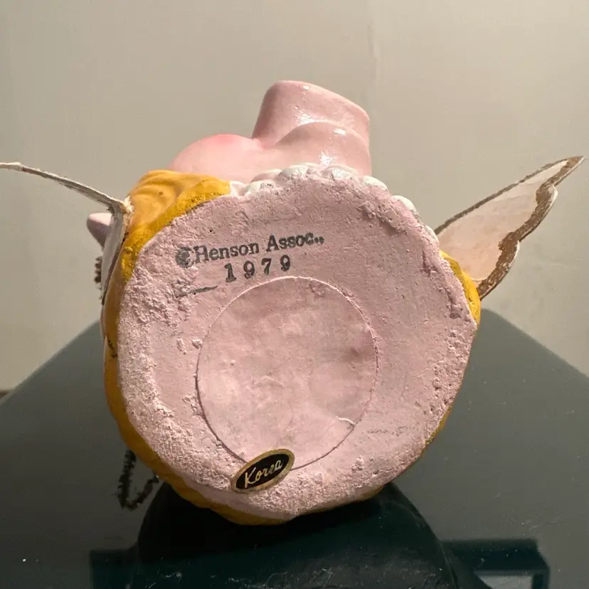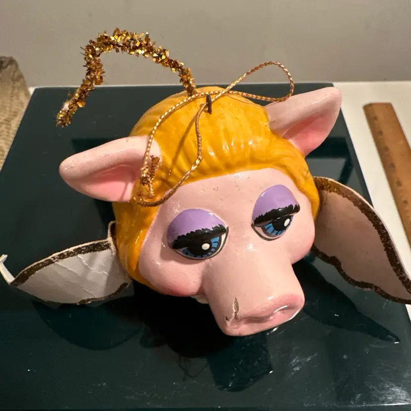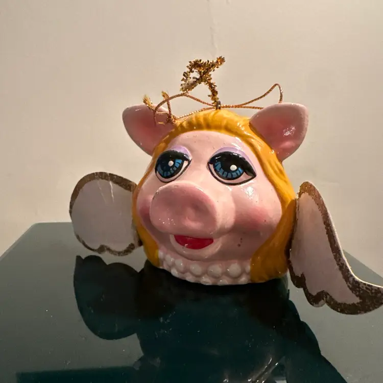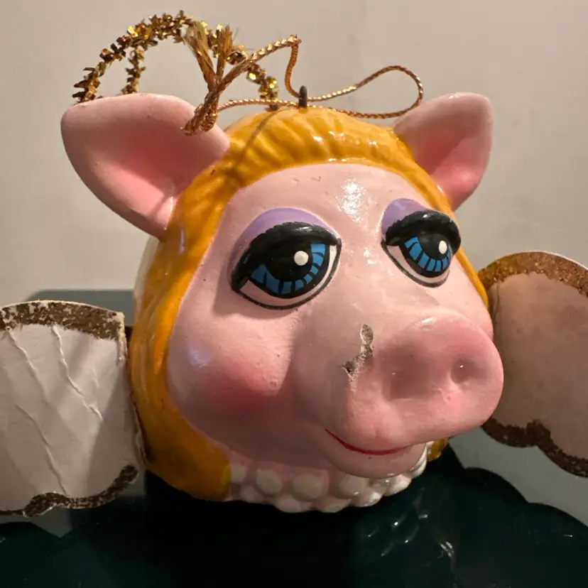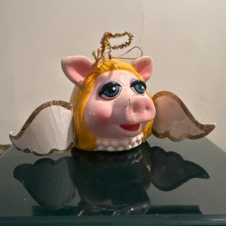 The item in the image is a vintage Miss Piggy Christmas ornament from 1979. It was made in Korea for Jim Henson Productions. The ornament depicts Miss Piggy as an angel, complete with wings and a halo. It's made of painted paper mache. It is considered a collectible item, especially for Muppets fans. The ornament's dimensions are approximately 3 x 2.5 inches without the wings.