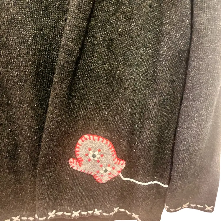 Adorable mittens sewn on this grey cardigan, and one on the back! Good condition.