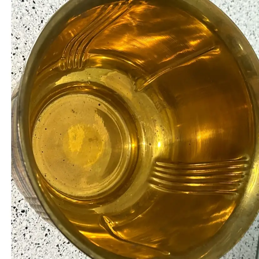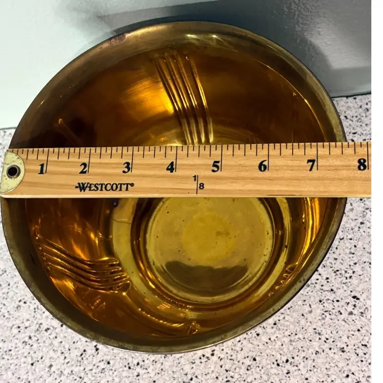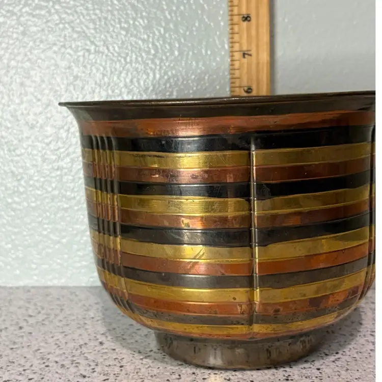 Mixed metals such as brass and copper, featuring a distinctive horizontal banded design and a small footed base. Made in India sticker. No dense. Normal wear and tear you would expect from a vintage planter.