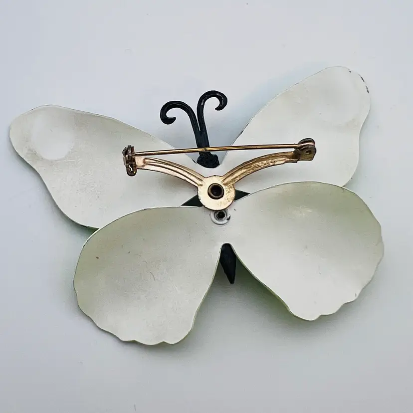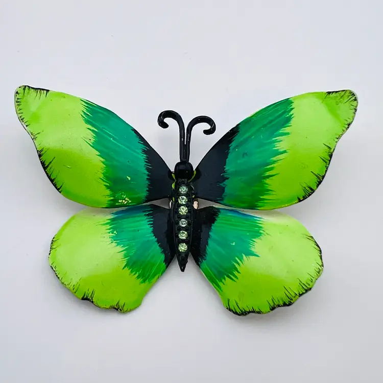 Vintage Mod Bright Green Enamel Uranium Rhinestone Butterfly Brooch