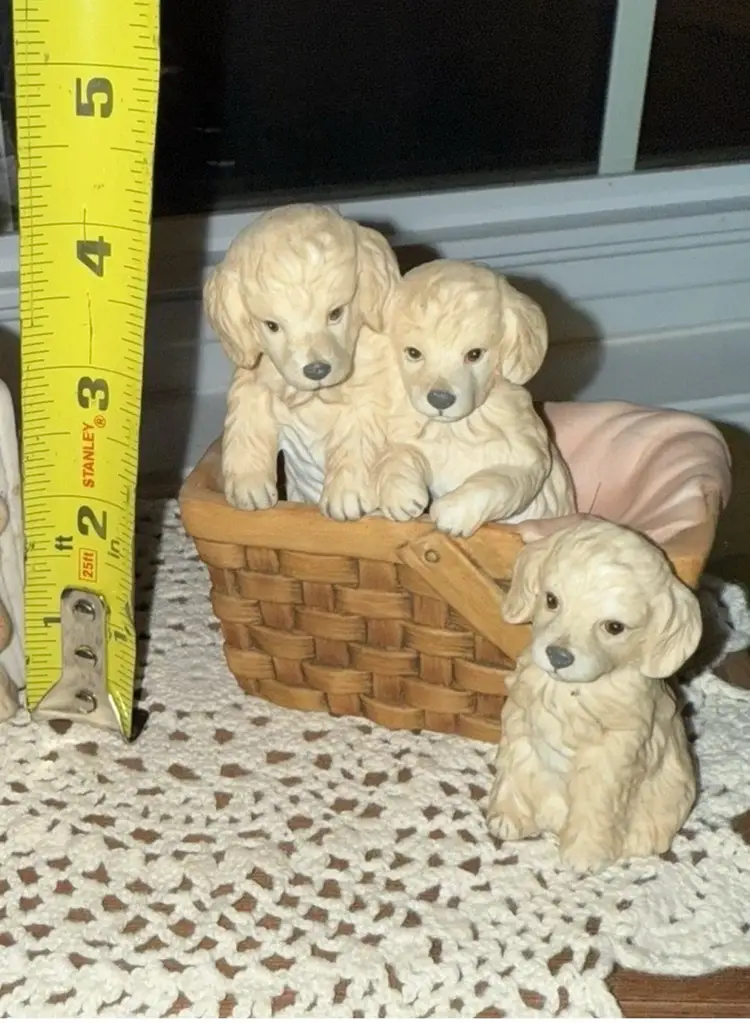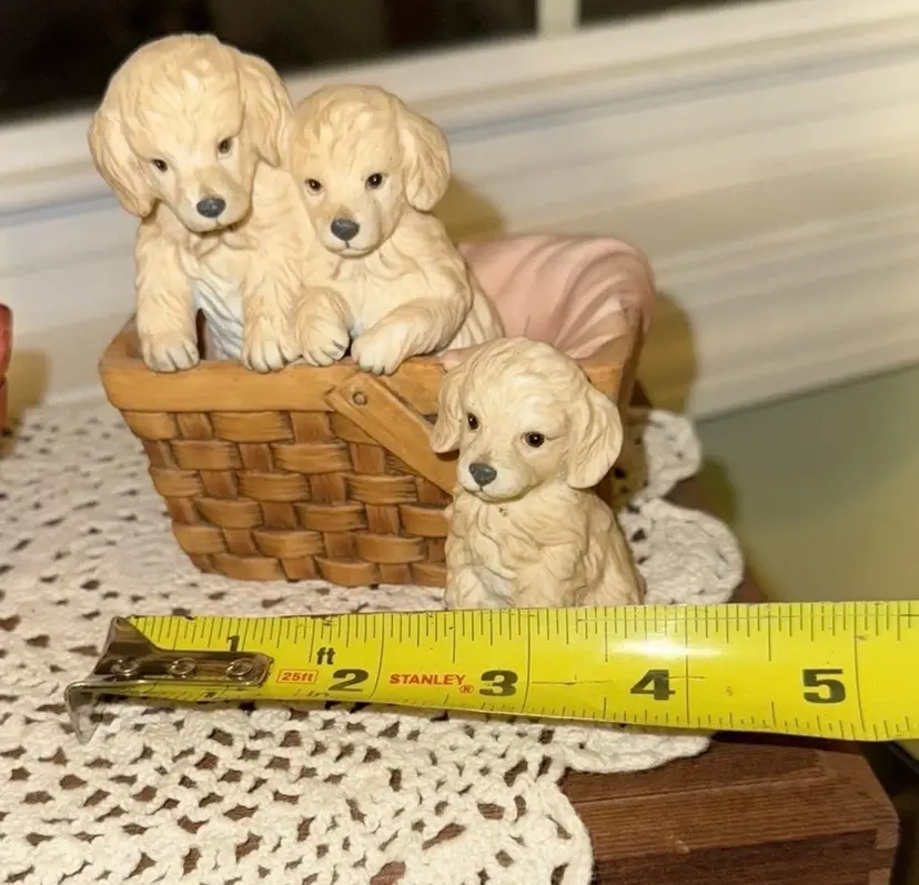 The Vintage Modern Masters figurine by Sally Miller is a charming Basket of Poodles made of porcelain. Measuring 4" in length and height, this multi-colored figurine depicts a playful scene of dogs in a unique and nostalgic way. Originating from Taiwan by Modern Masters Limited, this figurine is a beautiful addition to any dog lover's collection, showcasing both vintage and modern design elements in a whimsical and delightful manner.