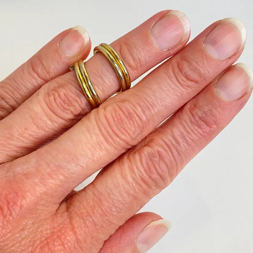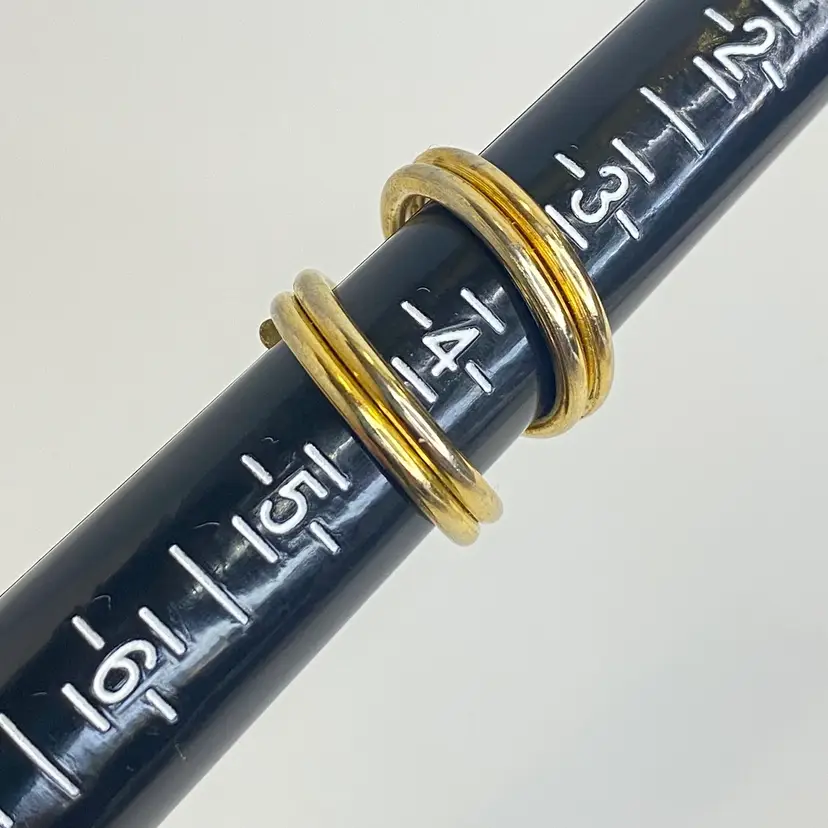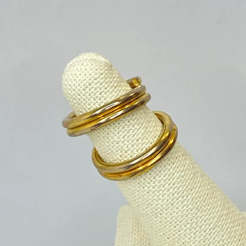 This vintage gold tone wrap layering ring features a split open coil design, perfect for adding a touch of retro and bohemian style to your look. With a size of 4.5, this piece is ideal for wearing on your pinky finger. The ring is crafted with a unique beauty and artistry, making it a great addition to your collection of vintage and antique jewelry.