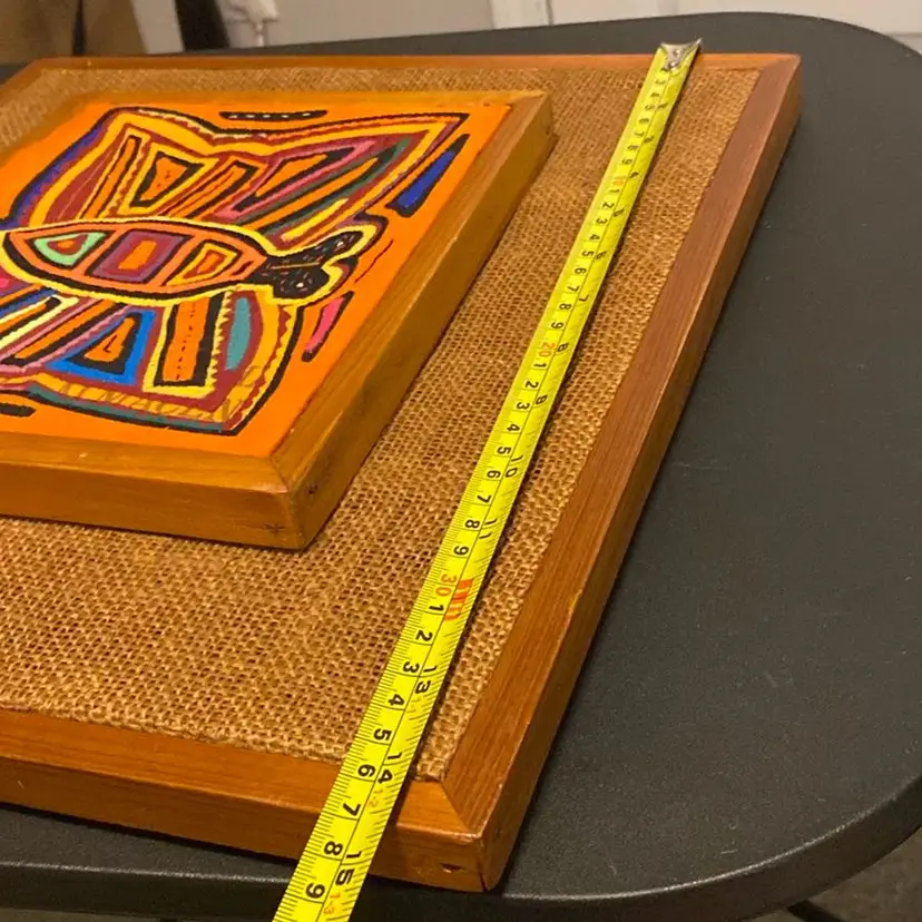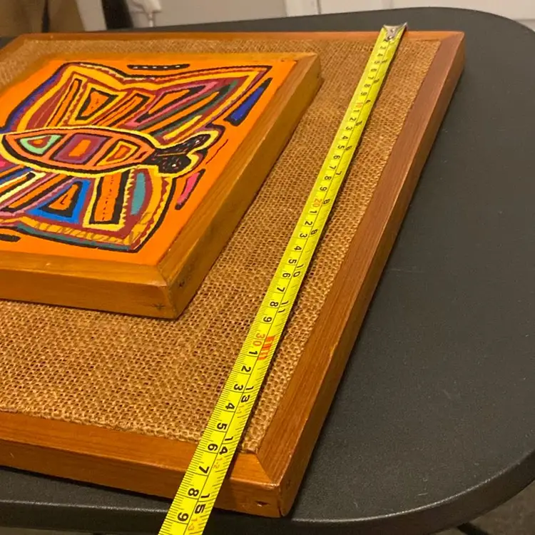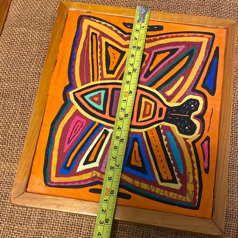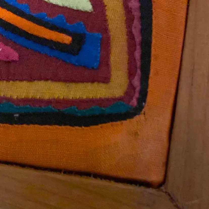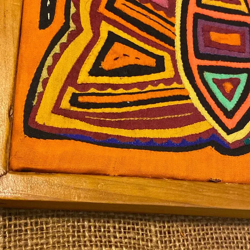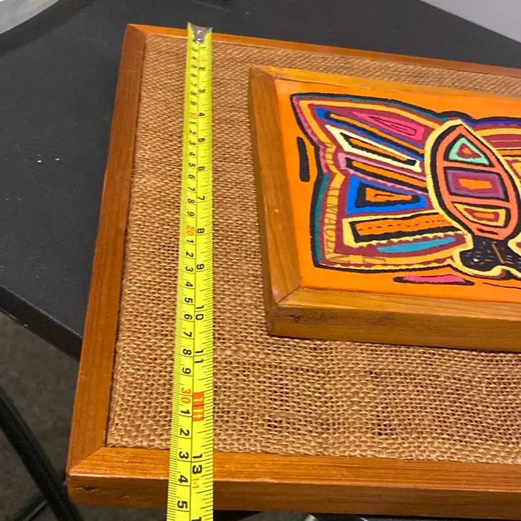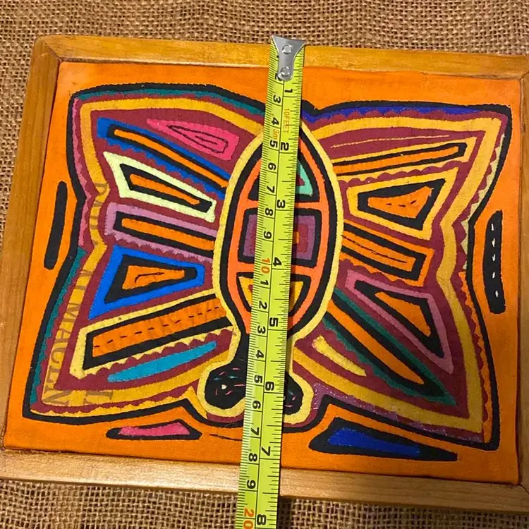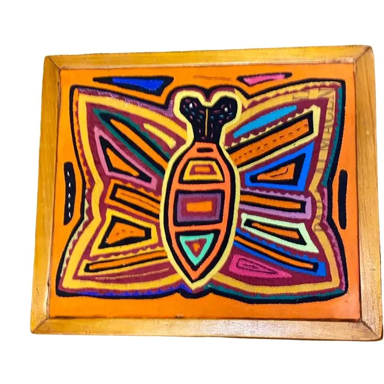 Multicolored handstitched mola textile framed butterfly 1980s please review last two pictures very carefully for imperfections.8th pic slight discoloration last pic a couple of tears.