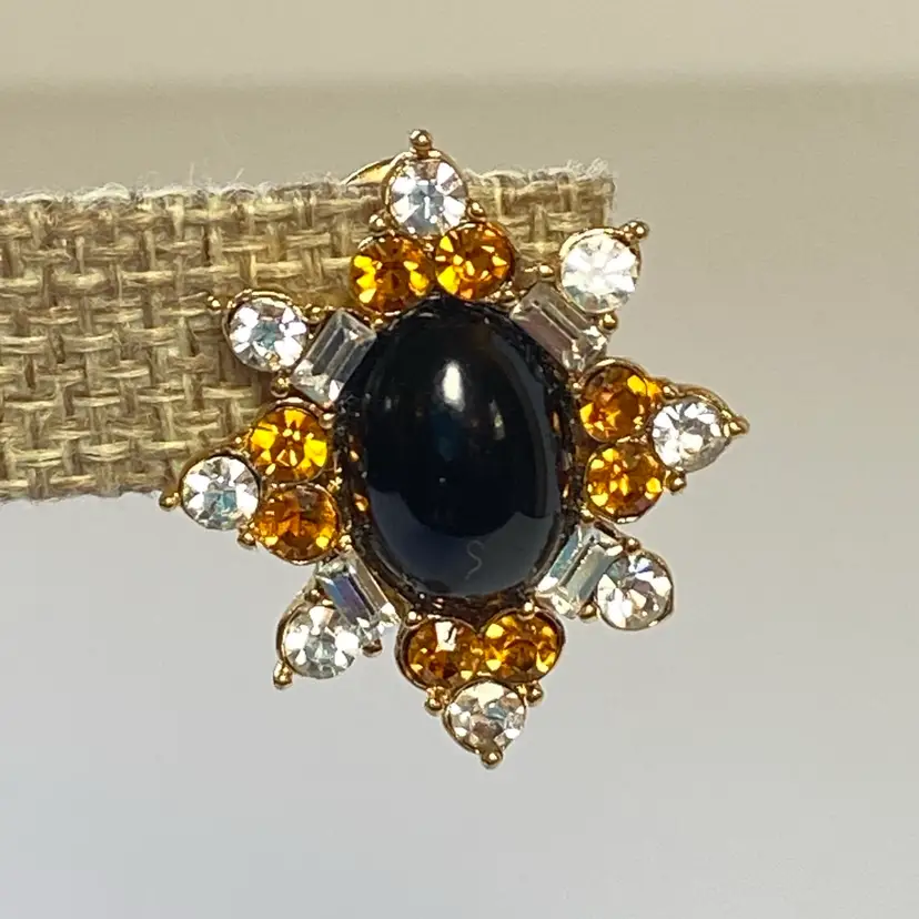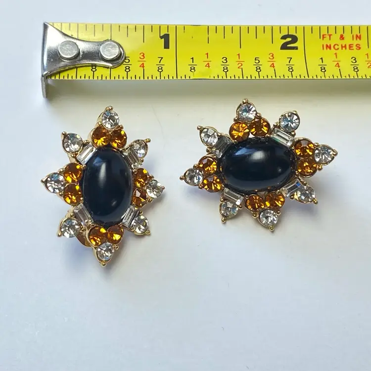 Vintage Monet 80s Retro Runway Statement Gold Tone Clear Amber Round Baguette Rhinestone Black Cab Clip On Earrings. Very good vintage condition. Please see pictures for details. SMOKE FREE/PET FREE HOME Approximate measurements: Length- 1.2" Width- 1"